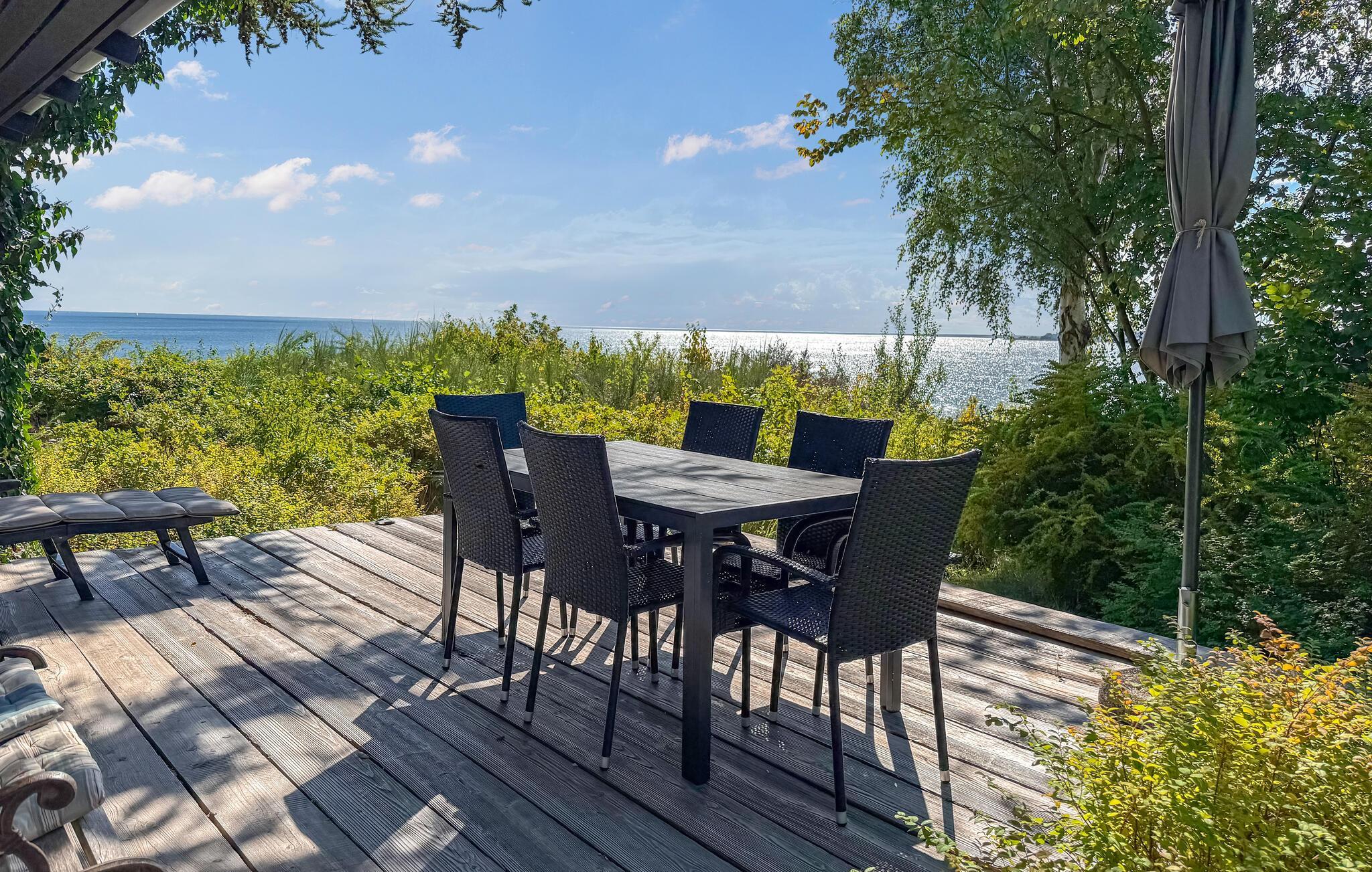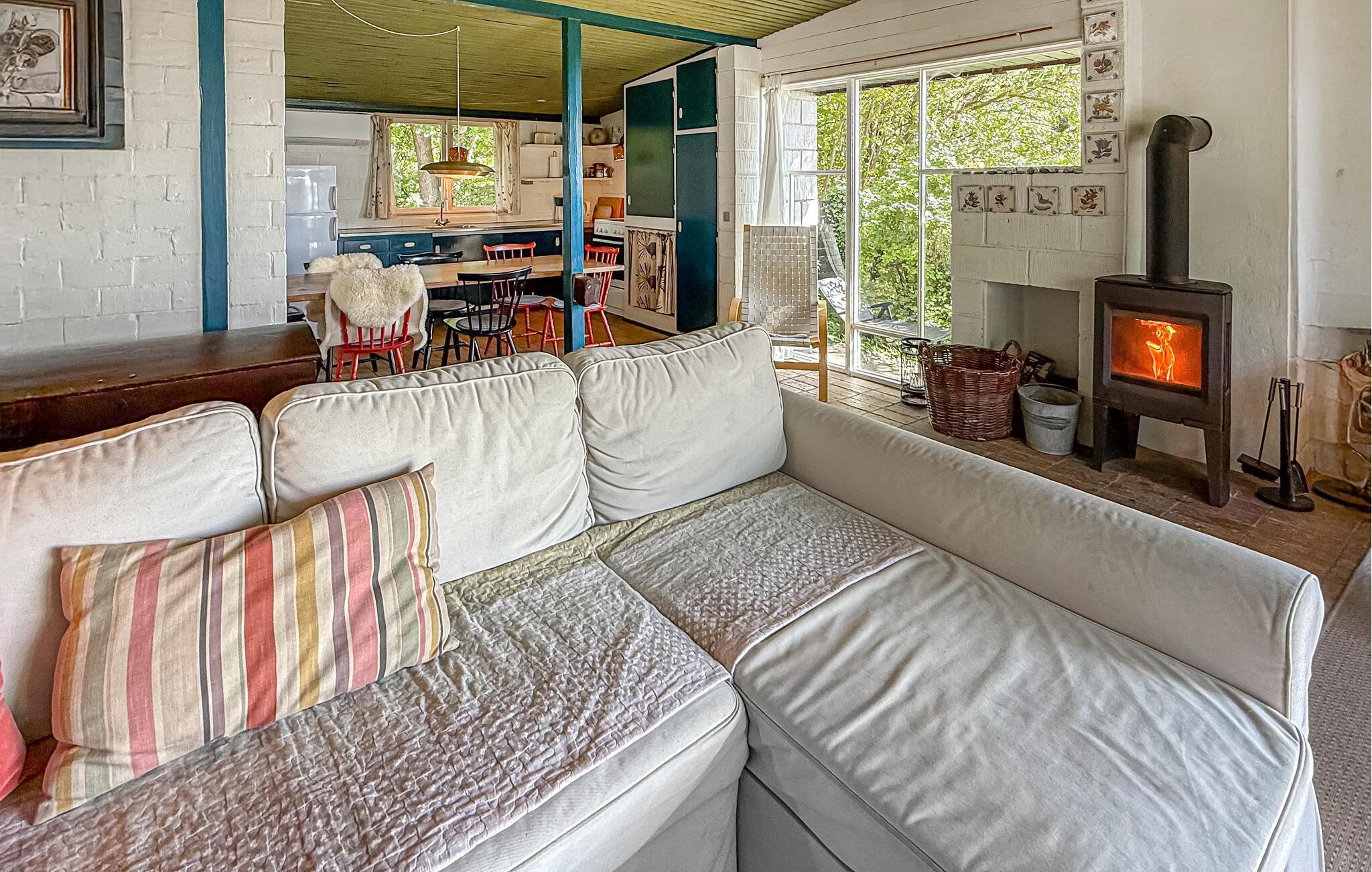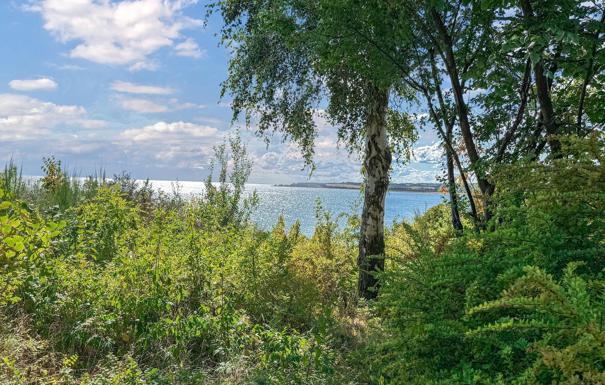 Charmerende feriehus ved Fuglsø Strand med panoramaudsigt, brændeovn og bålplads for en afslappende ferieoplevelse.