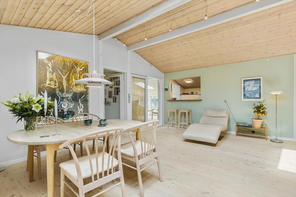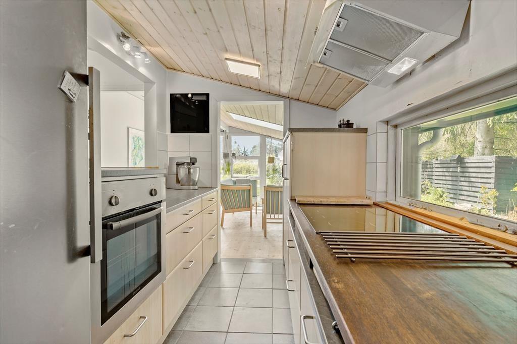 Dette dejlige sommerhus byder på højt til loftet og masser af plads både indenfor og udenfor, hvilket skaber en indbydende atmosfære for hele familien. Køkkenet er åbent mod stuen, så I kan være sammen, mens der tilberedes lækre måltider. Udenfor finder du flere terrasser, der alle har møbler, så du kan følge solen rundt på grunden og nyde den fredelige have omgivet af træer.