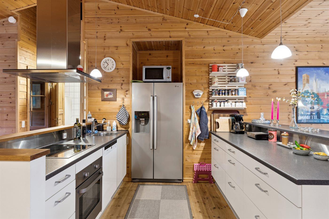 Køkkenet er udstyret med 1 amerikansk køleskab. Der er 4 keramiske kogeplader, varmluftovn, mikrobølgeovn samt opvaskemaskine.