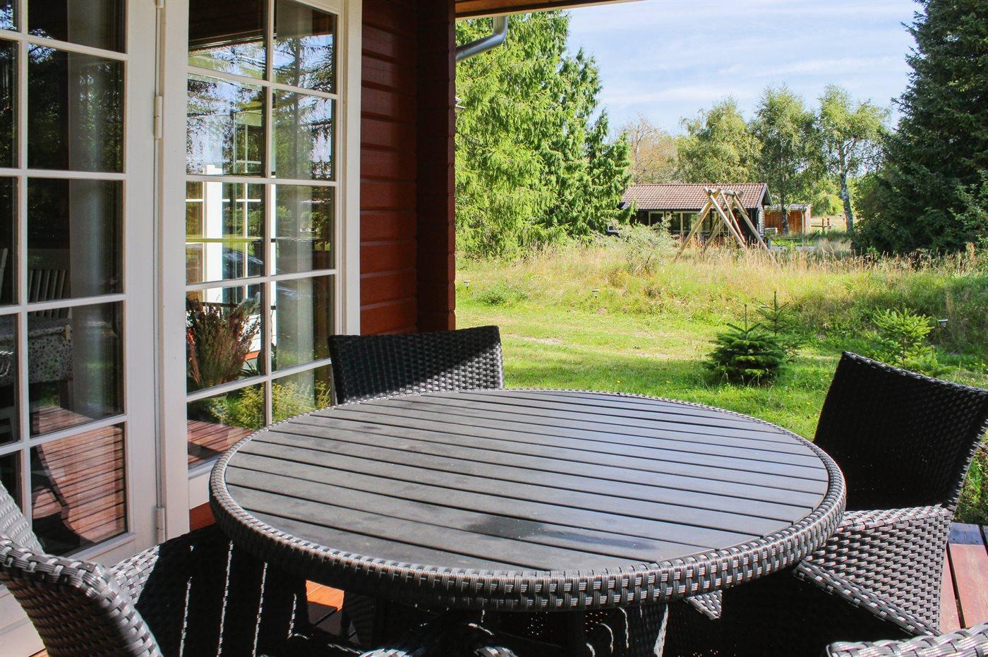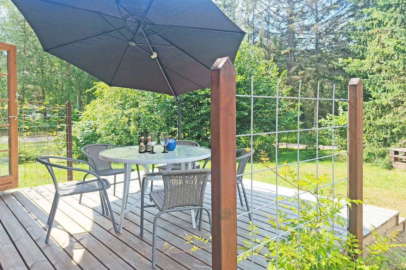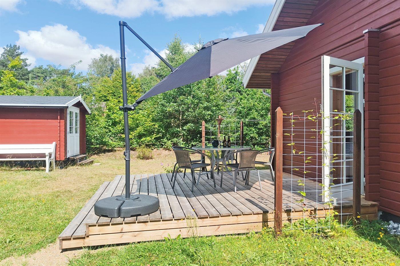 Ferieboligen er beliggende på en 1246 m² stor naturgrund. Der er 8000 m til havet. Nærmeste forretning er beliggende i en afstand af 4000 m. Til ferieboligen hører åbent terrasseareal. Desuden er der overdækket terrasse. Der er redskabsrum. Gynge. Sandkasse. Bålsted. Grill til rådighed. Parkering ved ferieboligen.