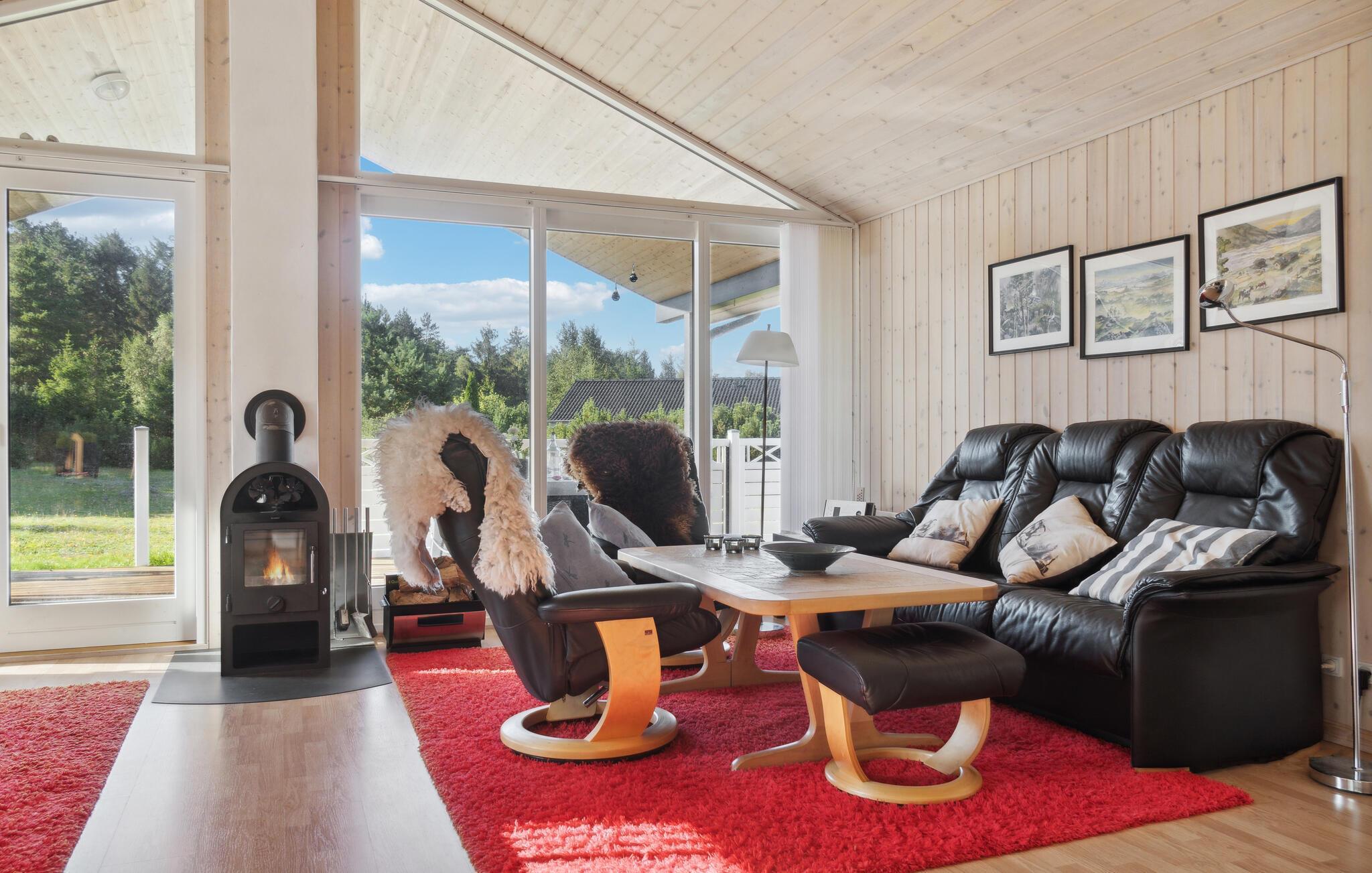 På en smuk ugenert naturgrund i Fuglslev, lige uden for Nationalpark Mols Bjerge, venter dette skønne feriehus med jacuzzi og sauna. Huset byder jer velkommen med en beroligende og lys atmosfære takket være den smagfulde komfortable indretning og det store vinduesparti, som bringer solnedgangen indenfor. Her kan I tage en pause fra hverdagen og trække jer tilbage omgivet af natur. Sæt jer med en god bog i den solbeskinnede lænestol ved brændeovnen eller forkæl jer selv med en tur i saunaen og en massage i boblebadet, inden den hyggelige spilleaften ved spisebordet går i gang. Benyt den store træterrasse til udendørs hygge på lune sommeraftener og nyd roen. Mens jeres børn fortsætter deres leg på plænen efter aftensmaden, kan I lægge planer for de kommende dage.