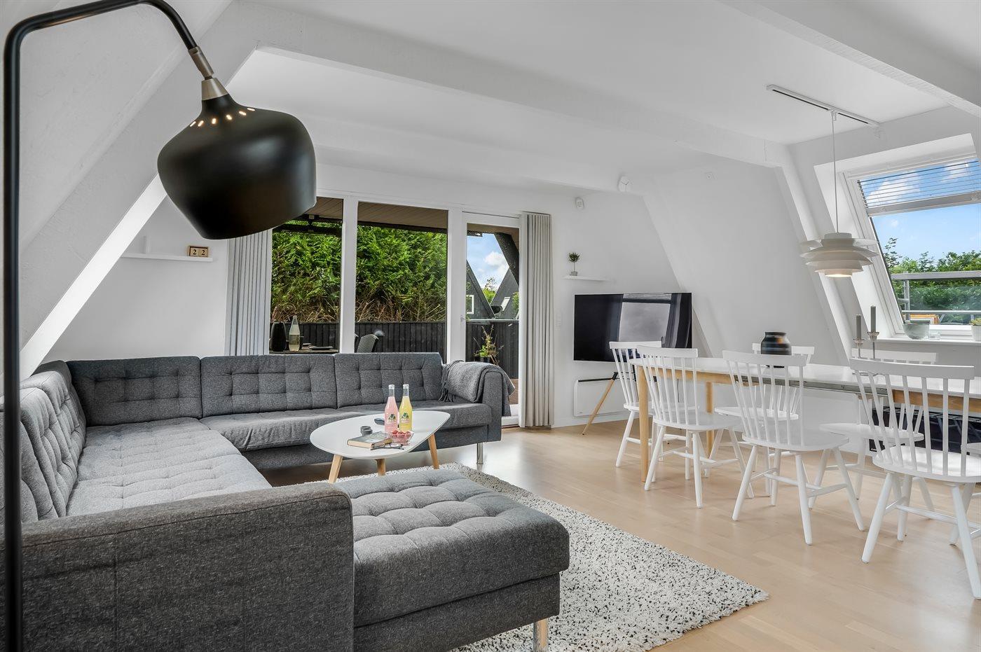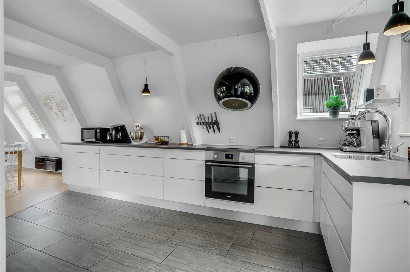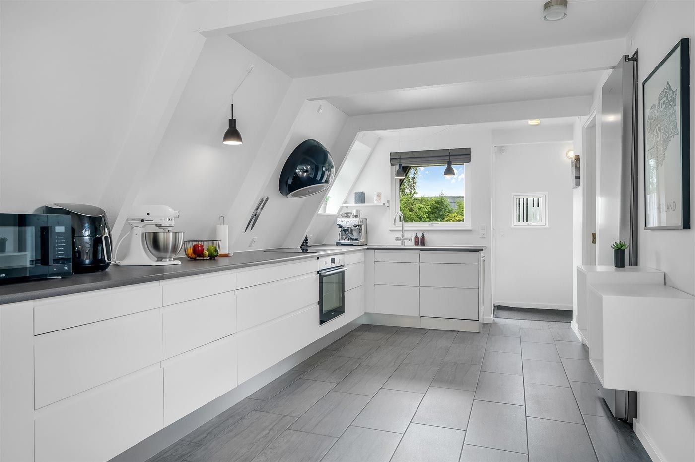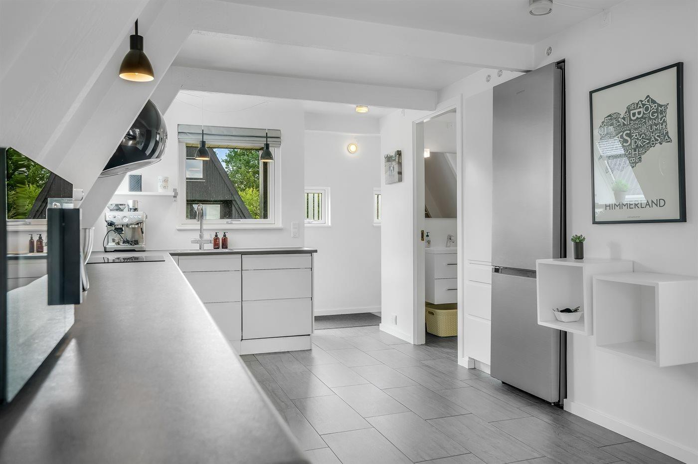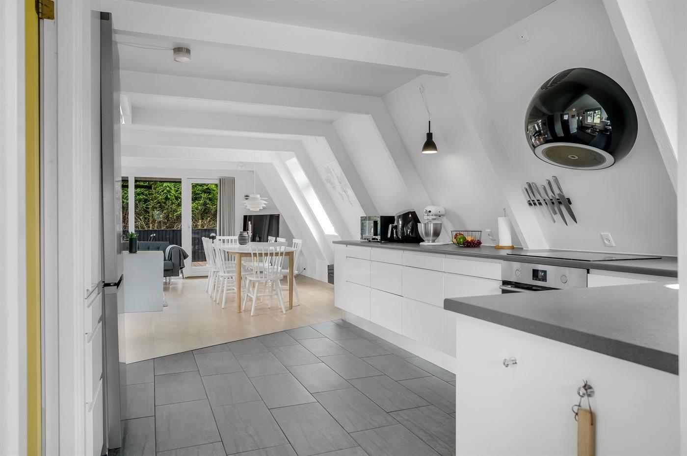 Køkkenet er udstyret med 1 køleskab. Der er 4 keramiske kogeplader, varmluftovn, mikrobølgeovn, Airfryer samt opvaskemaskine.