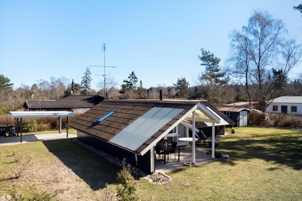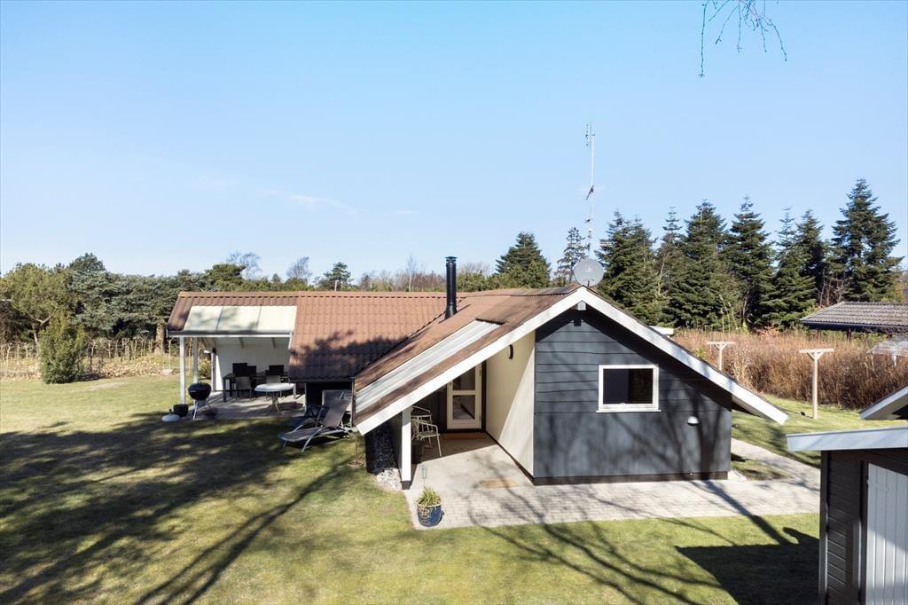 Sommerhuset er beliggende på en 1000 kvm stor grund. Til sommerhuset er en skøn delvist overdækket terrasse med havemøbler og grill. Derudover har huset en stor græsplæne, hvor der er plads til en masse sjov og leg.