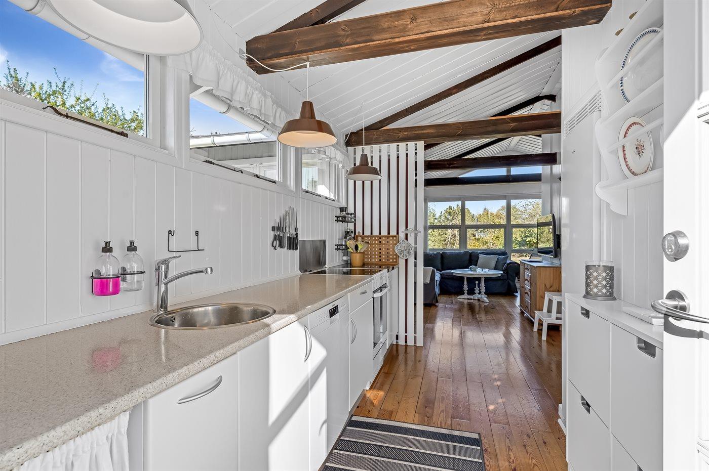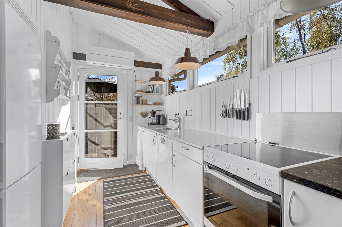 Køkkenet er udstyret med 1 køleskab. Der er 4 keramiske kogeplader, varmluftovn samt opvaskemaskine.