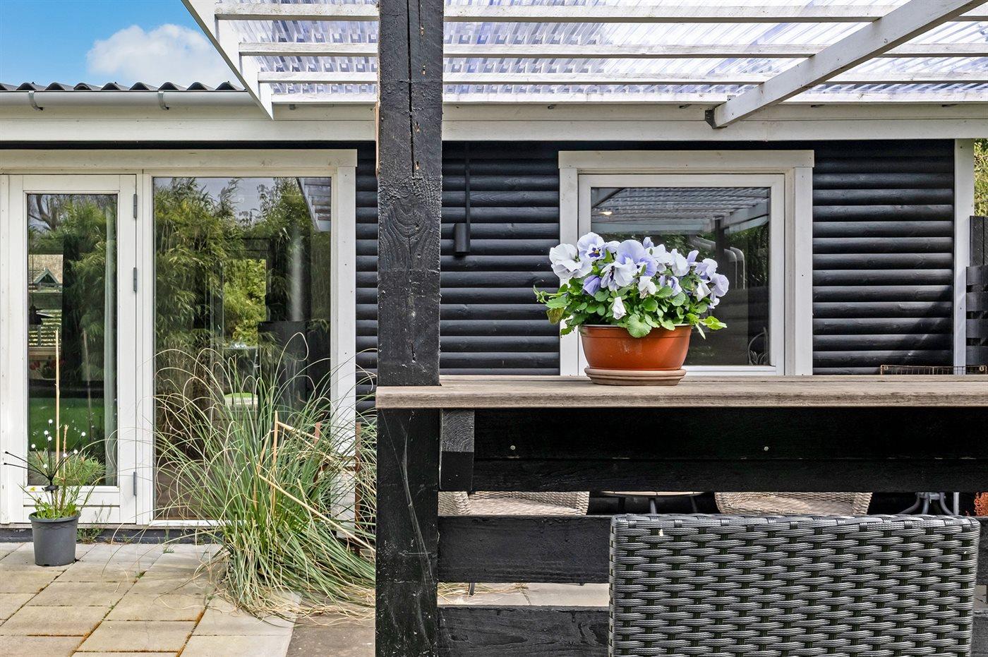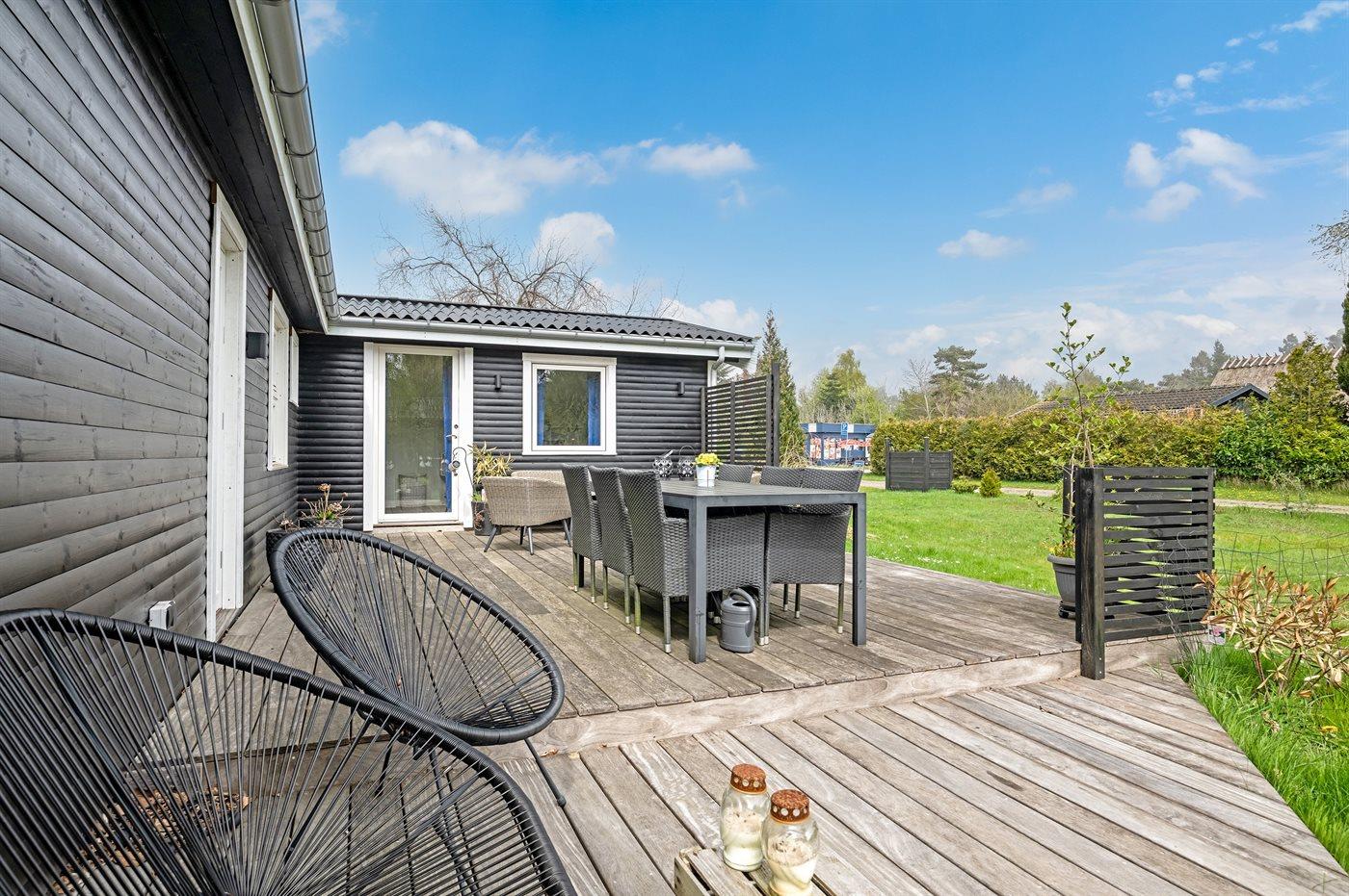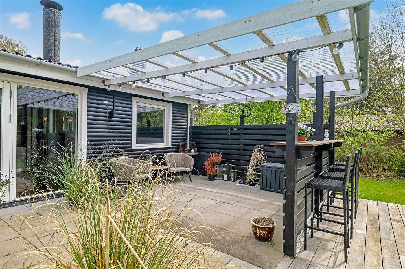 Udenfor finder du den skønne terrasse som egner sig perfekt til morgenkaffen i solen eller sommeraftener i baren med grill og hyggeligt samvær. I den frodige have er der god plads til leg for børn og barnlige sjæle.