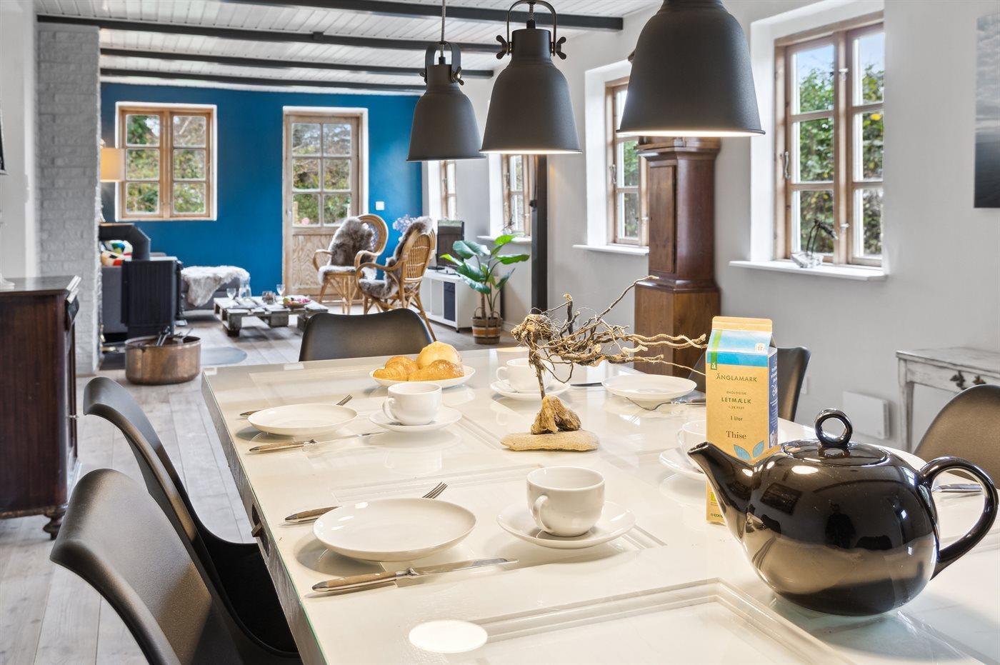 Stuen er stor, luftig og lys. Det åbne rum er inddelt i en spiseplads til 6-8 personer og et hyggeligt sofa-hjørne med TV og brændeovn til de kolde dage. Imellem de to områder er der desuden rigeligt med gulvplads til at spille Twist eller rulle yogamåtten ud.
