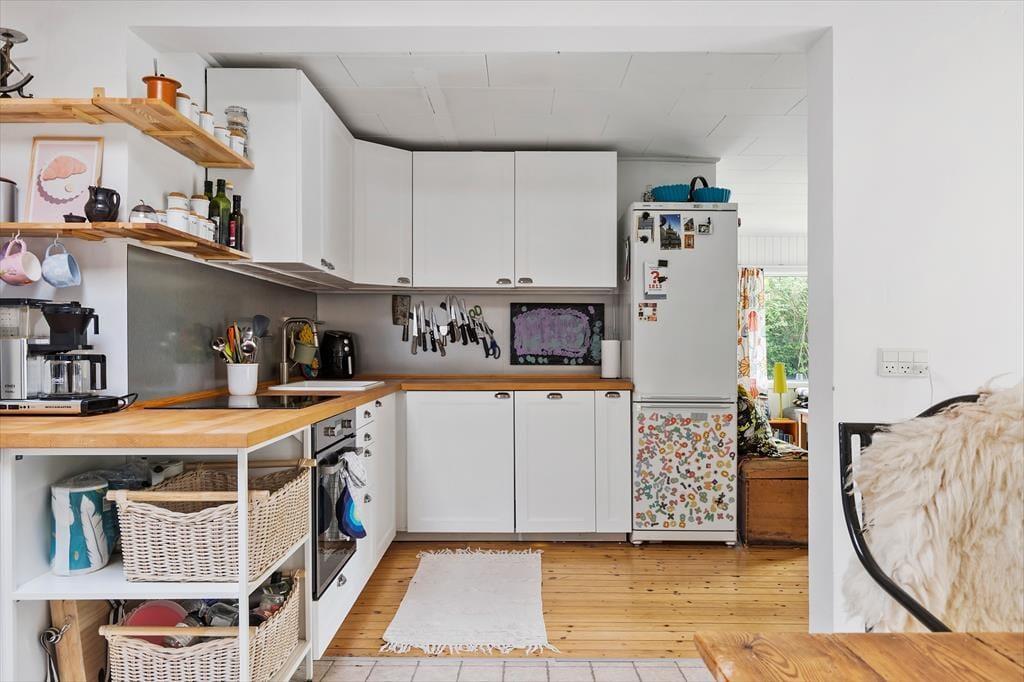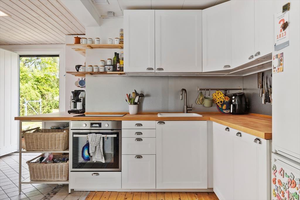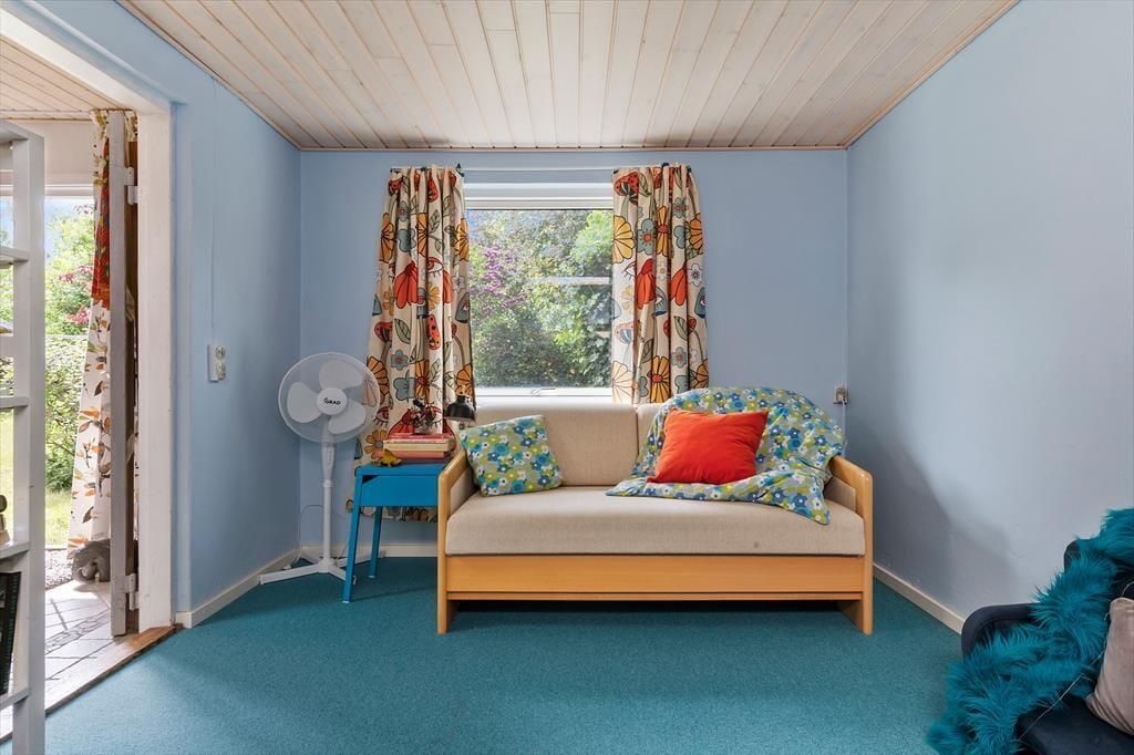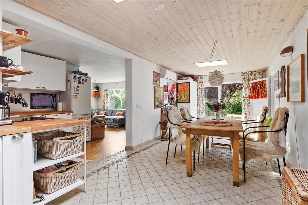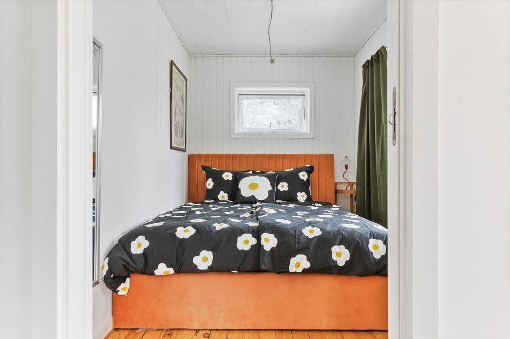 Allerede når I træder indenfor, mærker I den legende og varme atmosfære. Husets hjerte er det åbne alrum, hvor køkken og spisestue smelter sammen. Her er der god plads til at være sammen – til madlavning, tegnerier ved bordet eller brætspil, mens maden simrer. Rundt om hjørnet ligger opholdsstuen med en stor sofa, hvor hele familien kan slappe af og nyde freden. I det farverige børneværelse er der både en køjeseng og en sovesofa samt et udvalg af legetøj, der gør det let at finde på nye lege. Fra overkøjen kan man ligge og kigge op på stjernerne gennem ovenlysvinduet – en magisk detalje, der gør sengetid til noget helt særligt. Derudover byder huset på et lyst soveværelse med dobbeltseng.