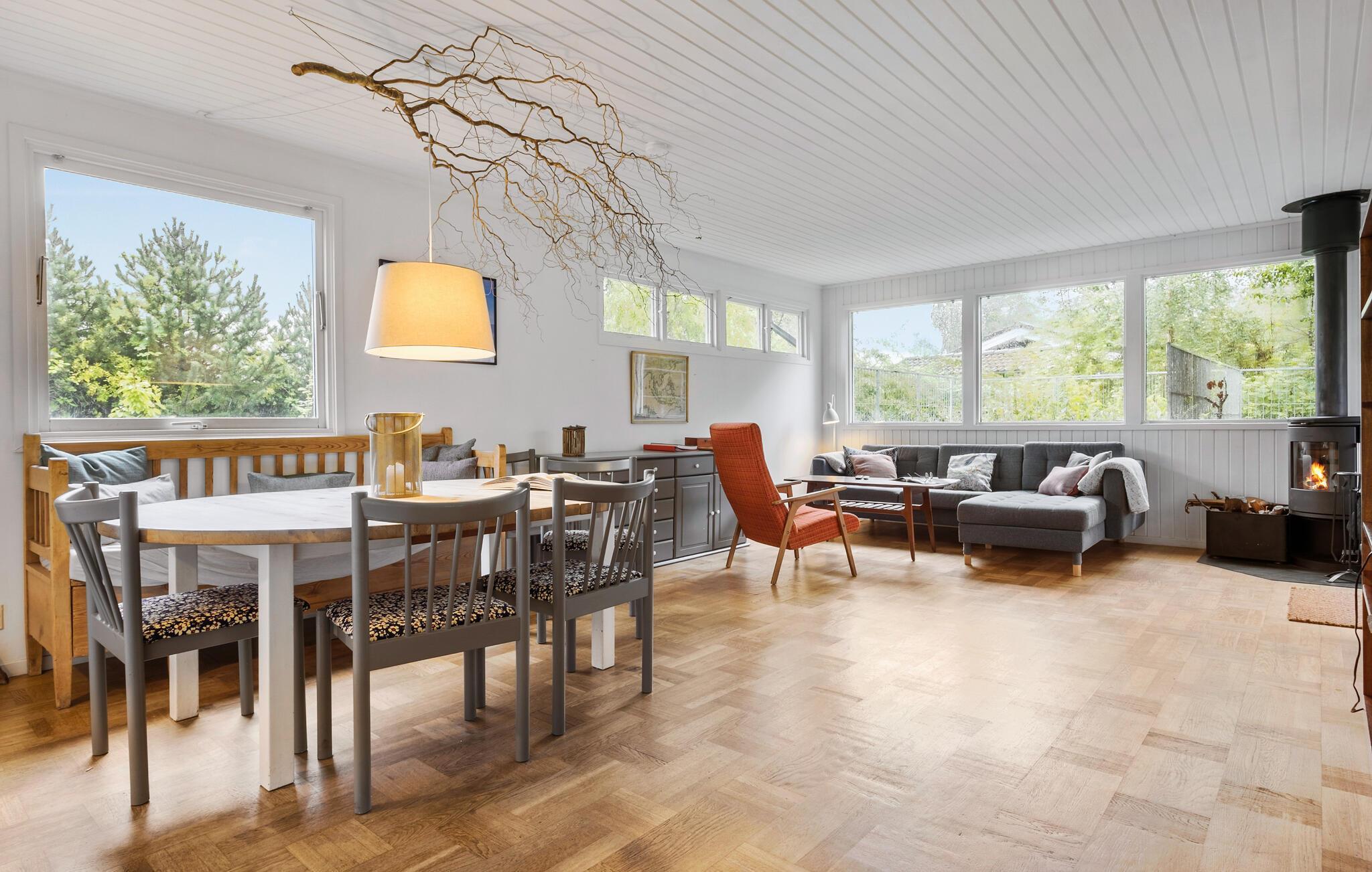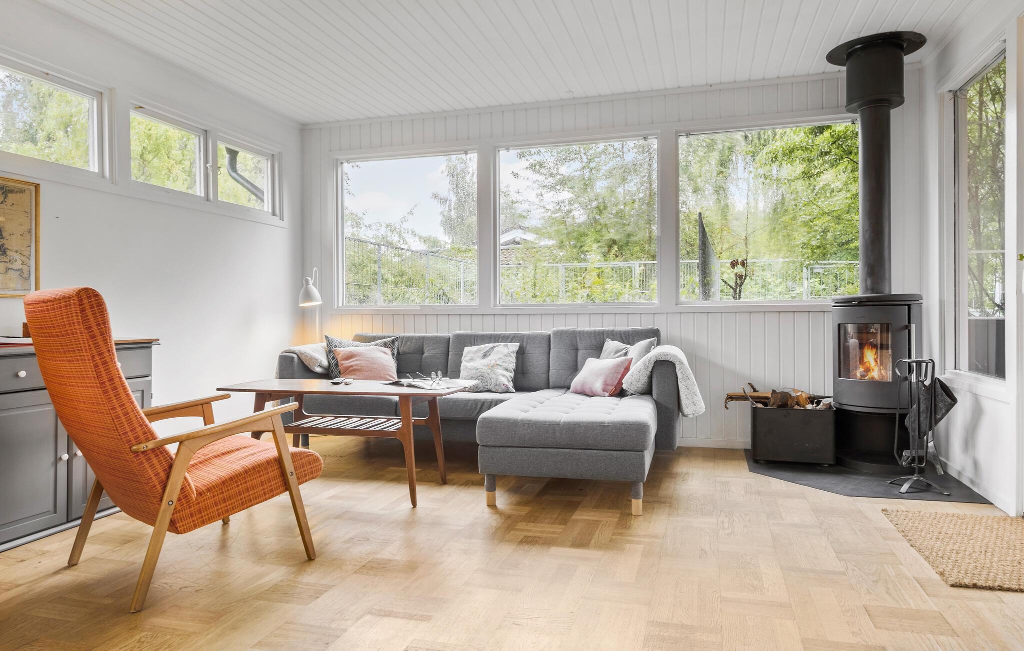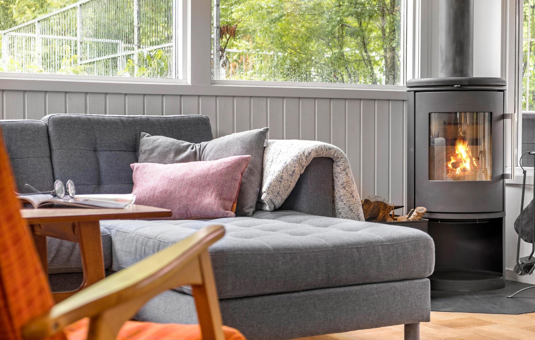 Fra husets opholdsområde får I en vidunderlig udsigt over haven, og I kan se frem til mange hyggelige aftener til lyden af brændeovnens gnitren.