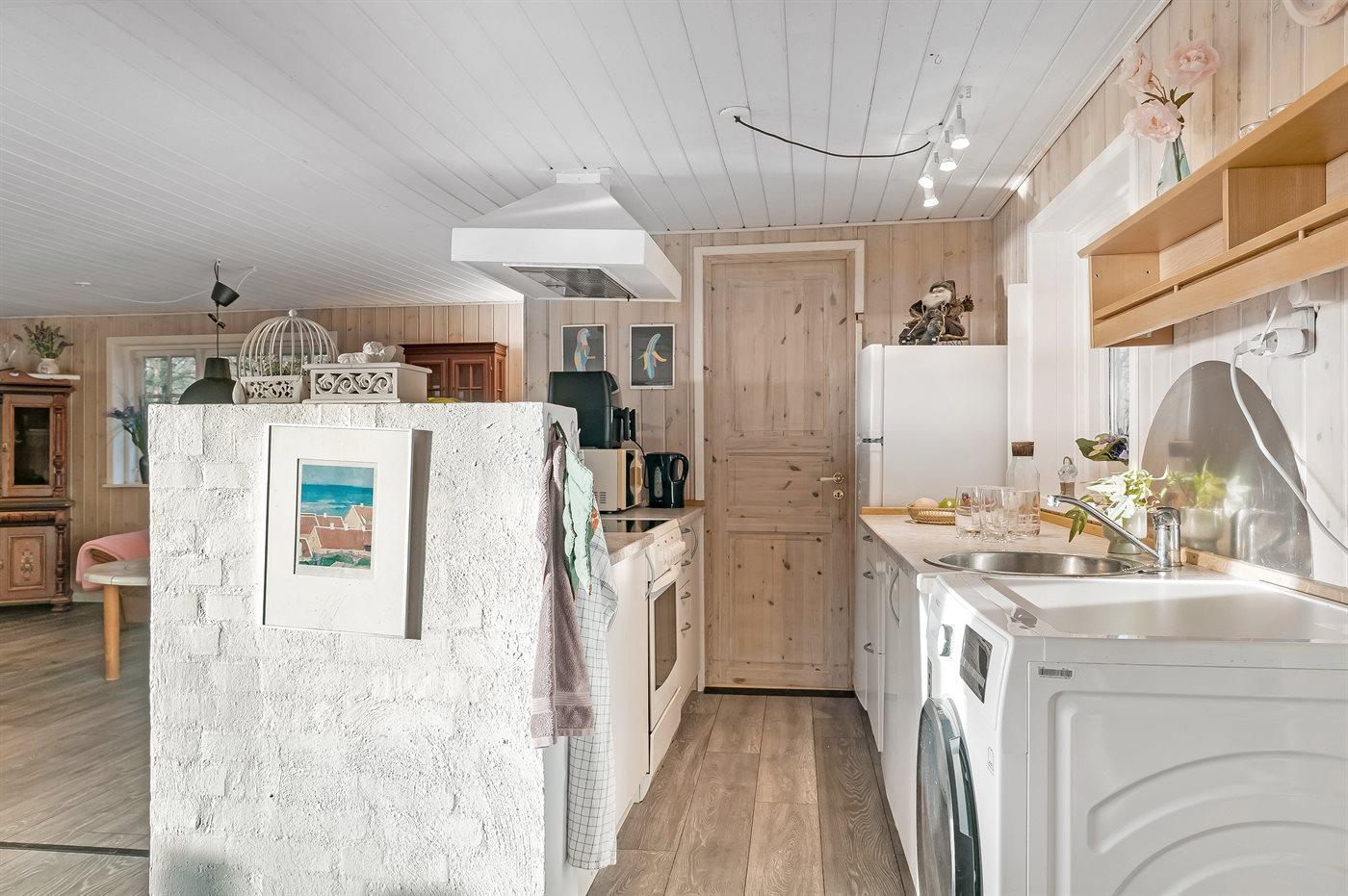 Køkkenet er udstyret med 1 køleskab. Der er 4 keramiske kogeplader, varmluftovn, mikrobølgeovn, Airfryer samt opvaskemaskine.