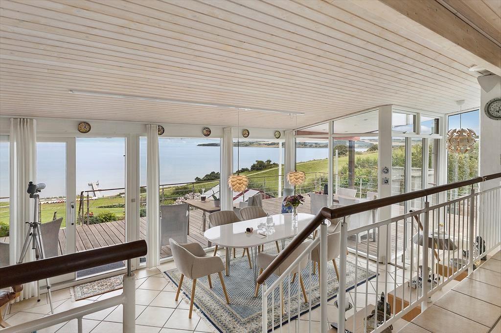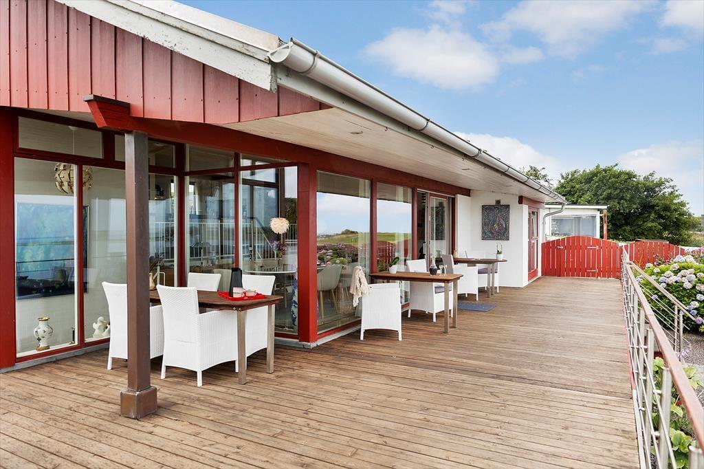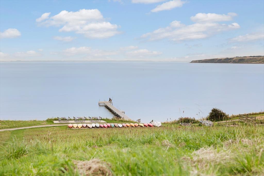 Udelivet folder sig for alvor ud på den store terrasse, der strækker sig over hele 130 m2 og tilbyder små, hyggelige kroge til enhver smag og stemning. Du kan tage kaffen med ud og finde din yndlingsplads i solen – eller trække dig ind i den charmerende pavillon, når duggen falder sidst på dagen. Her bliver aftenerne lange og stemningsfulde, mens fjorden changerer i blågrønne toner og landskabet spejler sig i det stille vand. Med badebroen lige ved hånden, er det oplagt at starte dagen med en frisk dukkert – og måske slutte den med et glas vin og kig til stjernerne. Her er rammerne sat for rendyrket feriehygge i ét med naturen.