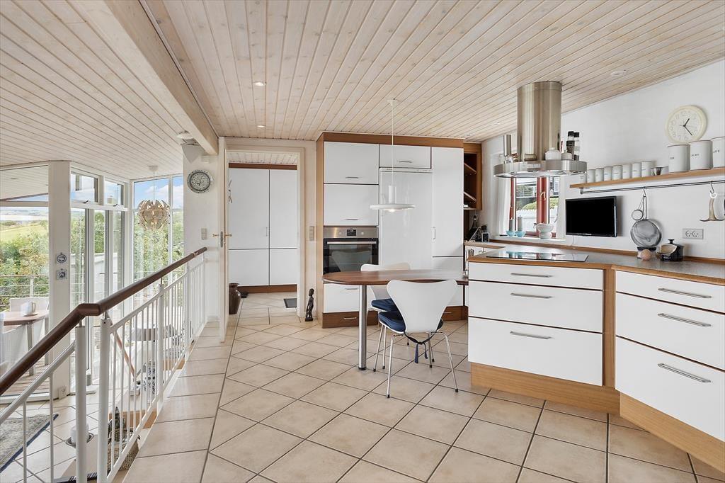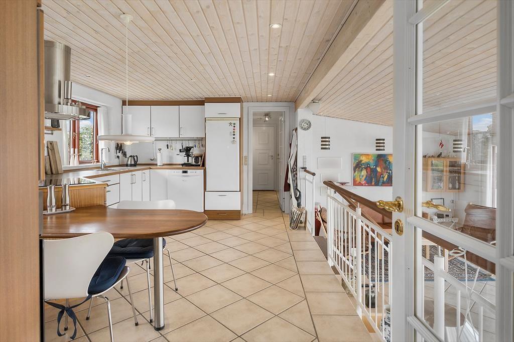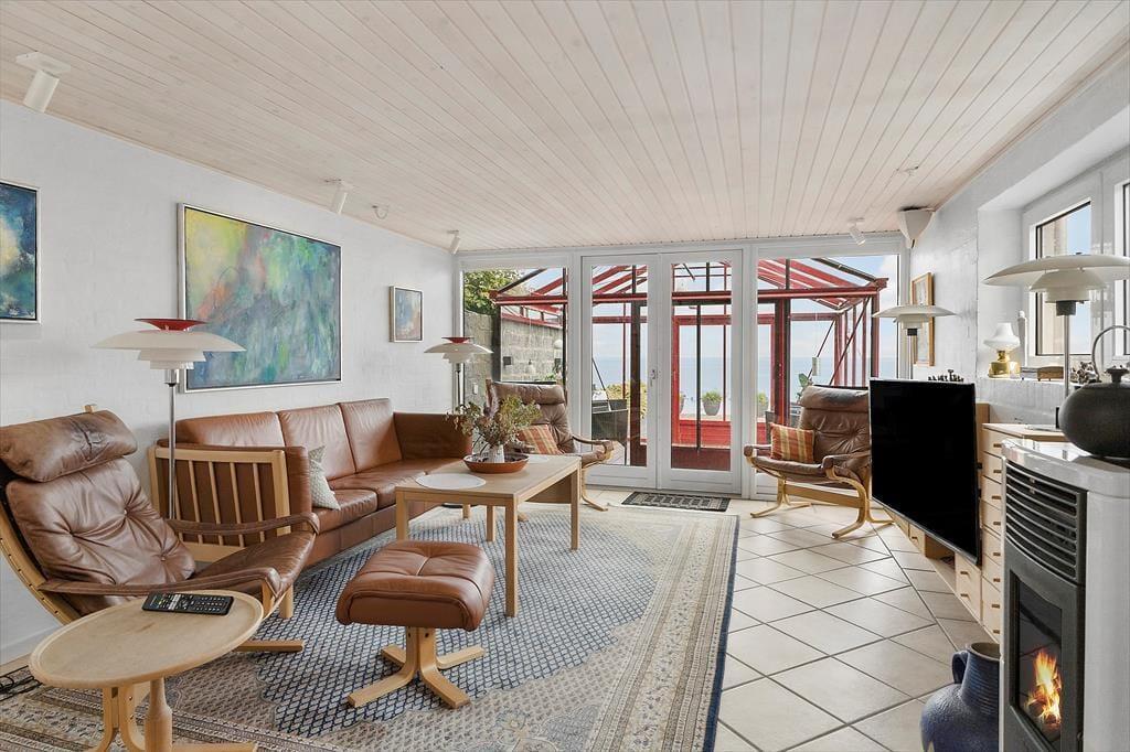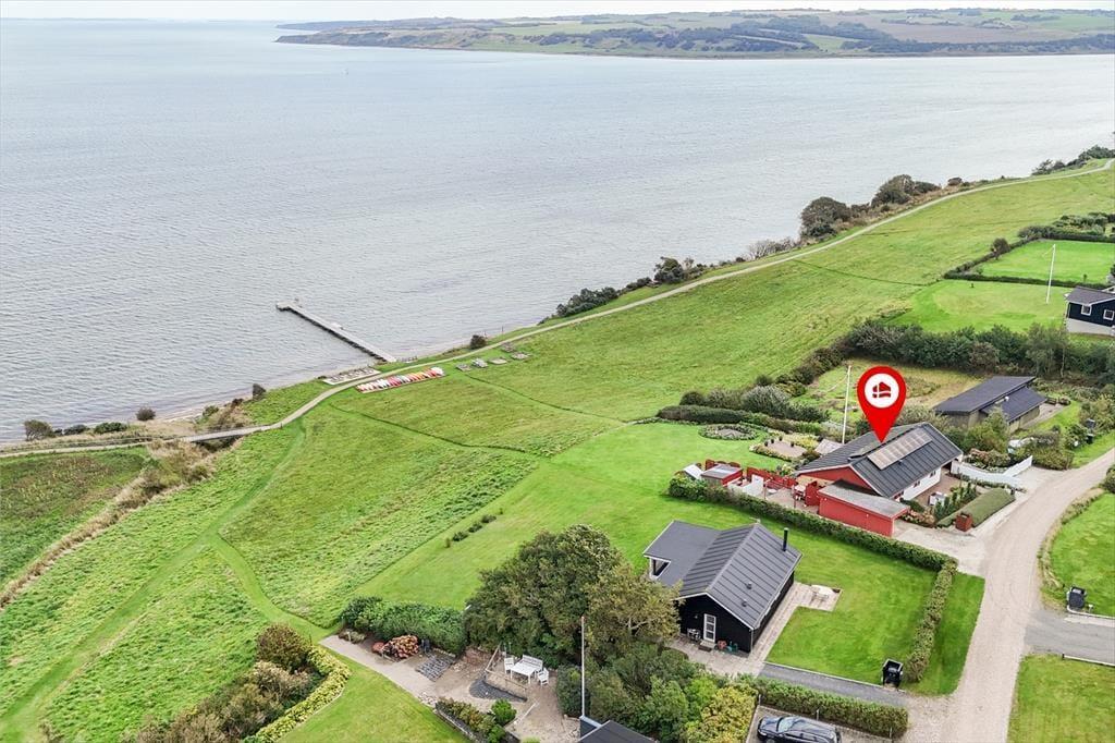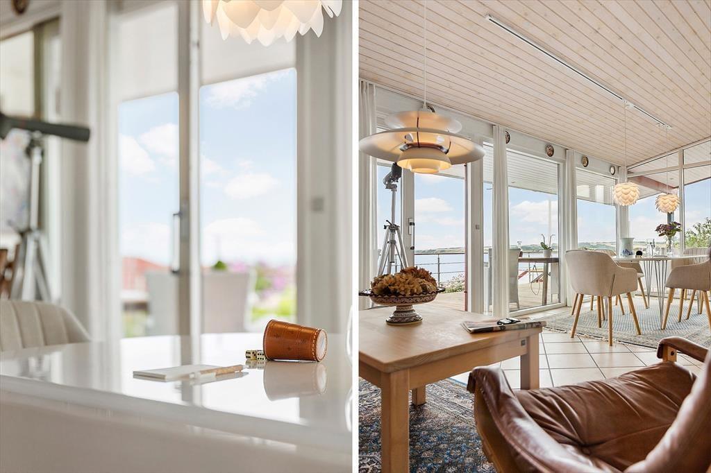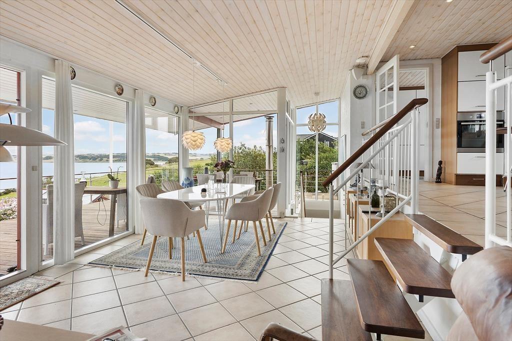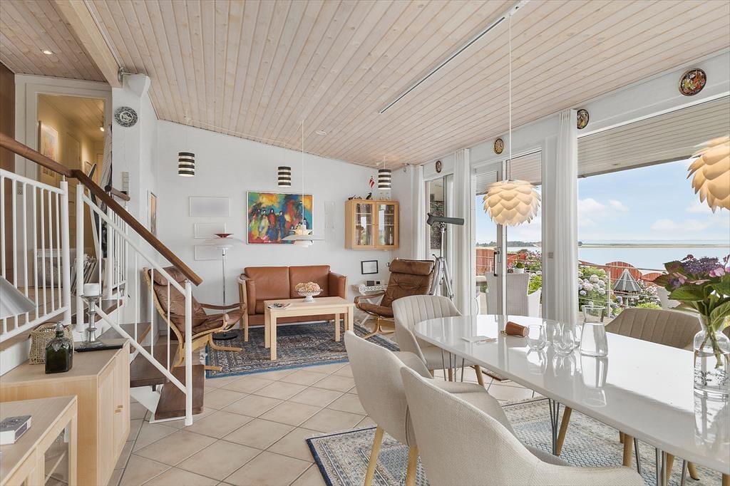 Det føles næsten som om, Limfjorden flytter med ind i stuen – så tæt er du på vandet her i det charmerende sommerhus ved Gjellerodde. Store vinduespartier trækker lyset og udsigten helt ind i opholdsrummet, hvor den åbne indretning giver en naturlig forbindelse mellem stue og køkken. Niveauforskydningen i huset skaber en spændende arkitektonisk oplevelse, og gør rummene levende og varierede. Uanset om I samles til morgenmad, slapper af med en god bog i sofaen eller blot nyder stilheden, vil det imponerende fjordkig være en konstant ledsager. Her er der dømt ægte feriestemning med fokus på nærvær, udsigt og afslapning i smukke rammer.