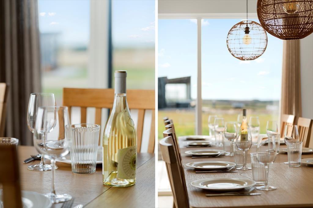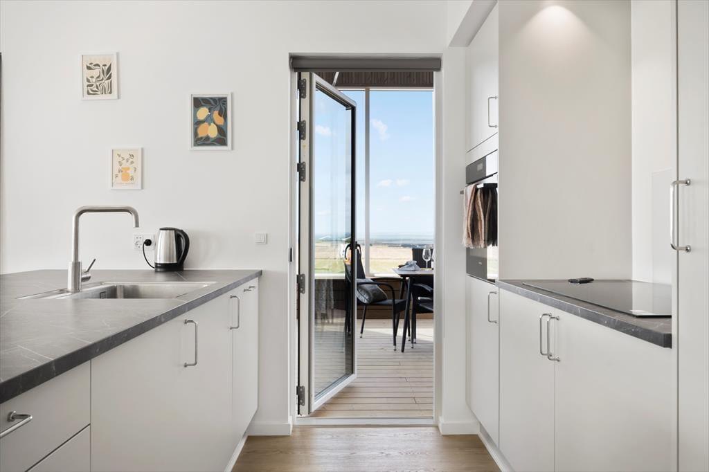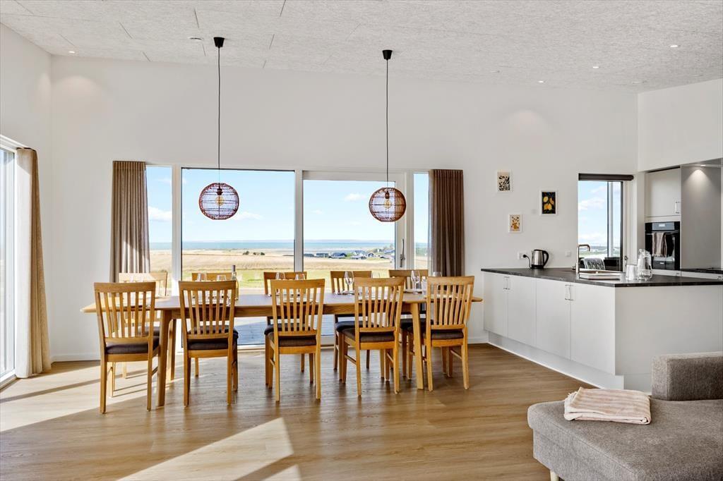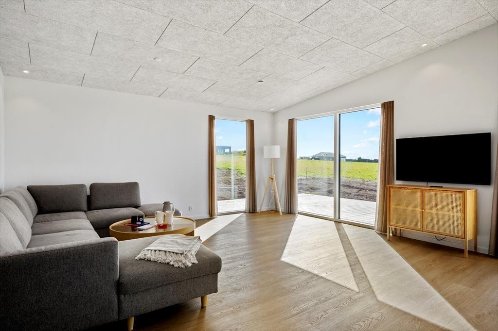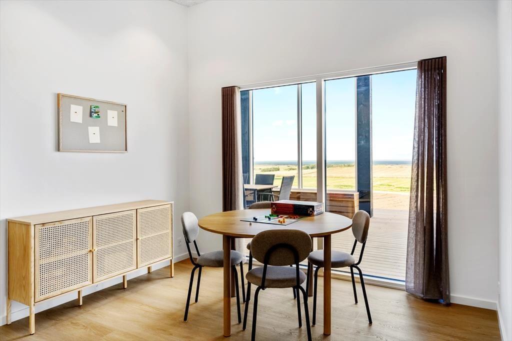 Sommerhuset er nyopført og klar til ferieglade gæster fra sommeren 2025. Indretningen er moderne og gennemtænkt, og her er plads til både store og små, hvad enten I er en eller to familier, en venneflok eller tre generationer på ferie sammen. Det store, lyse opholdsrum udgør husets hjerte med stue og køkken i åben forbindelse – her kan I samles om madlavning, hyggelige måltider og lange aftener med spil og snak, mens lyset strømmer ind og understreger den imponerende udsigt til fjorden. Har du lyst til lidt mere aktivitet, kan du bevæge dig ind i husets aktivitetsrum og udfordre resten af selskabet i et spil – uanset alder er der garanti for grin og gode stunder. Med to badeværelser, sauna og adgang til udebruser får selv praktikken et strejf af velvære, og det samme gælder naturligvis den lækre udespa, som gør det muligt at koble fuldstændig af – uanset om dagen står på afslapning eller eventyr.