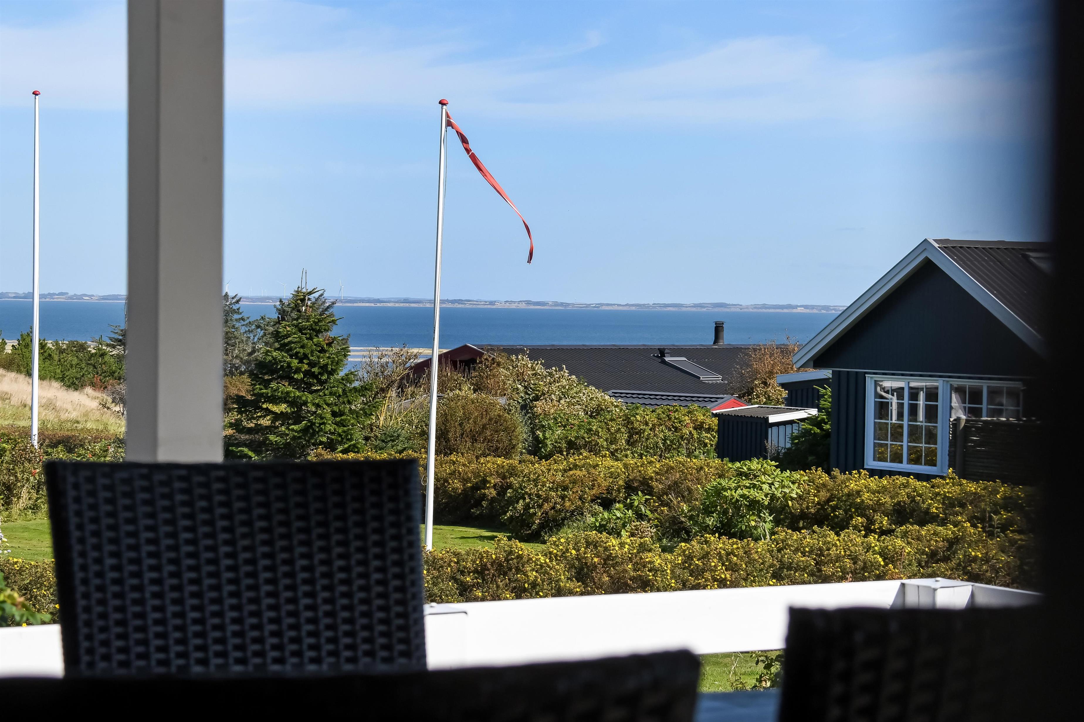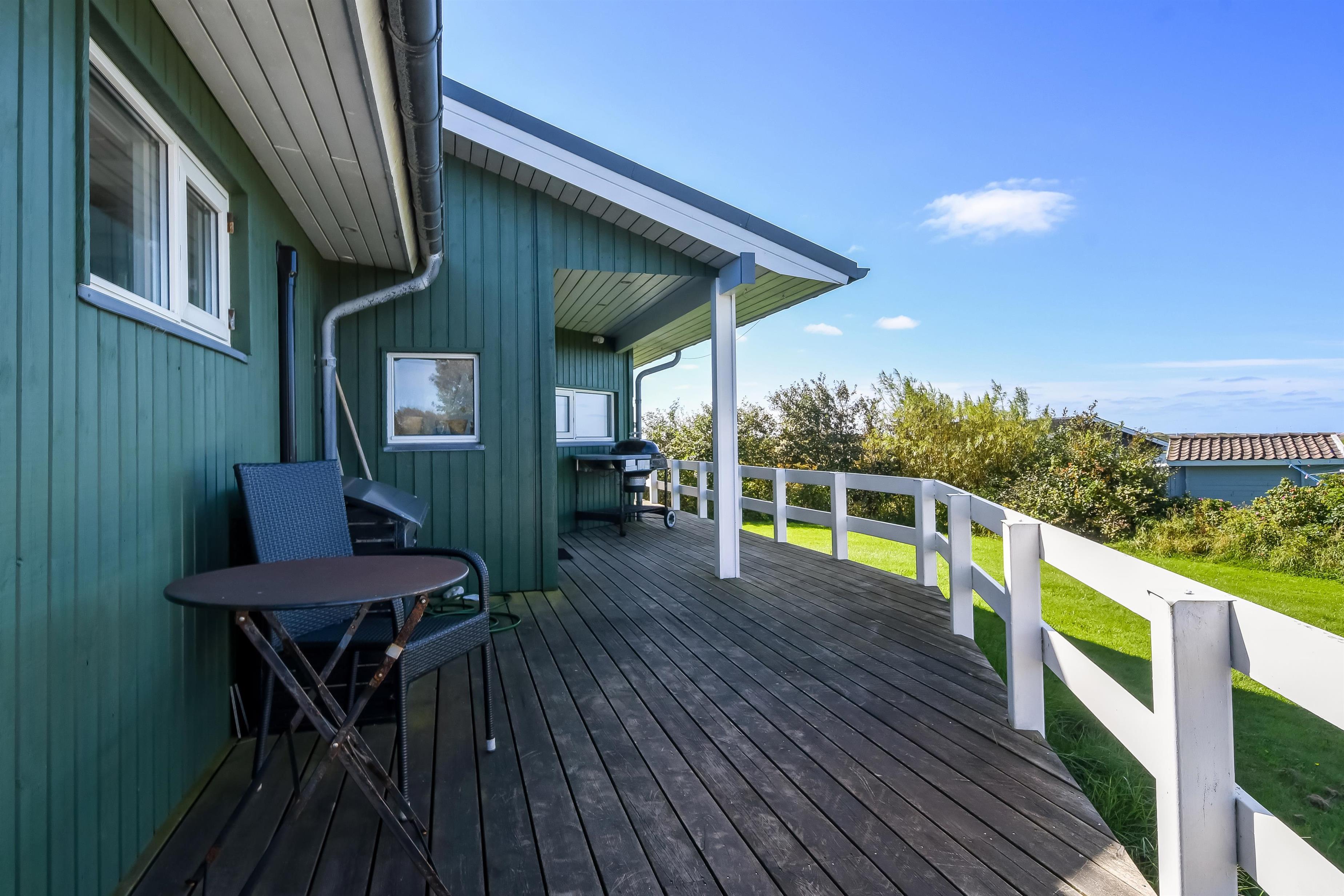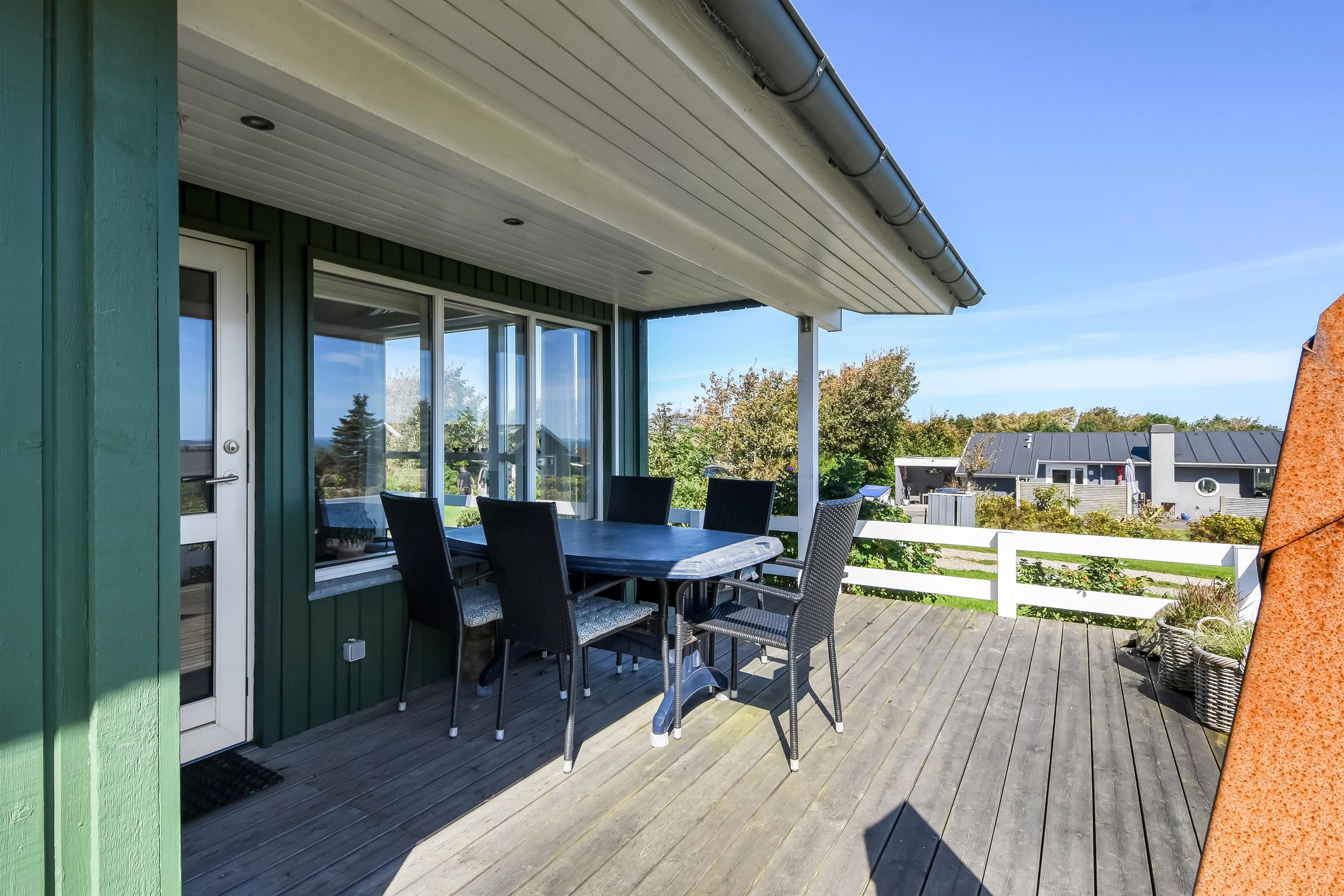 Huset har både åbne og overdækkede terrasser, udstyret med havemøbler og grill, som kan tilpasses efter behov. Uanset hvor du sidder, vil du kunne nyde læ- og solforholdene, og udsigten til Limfjorden er helt fantastisk. Der er et dejligt stisystem, som hurtigt fører dig ned til vandet. Cirka 500 meter fra huset ligger en ny, flot naturlegeplads i træ med både fodboldbane og rutsjebane – et hit for både store og små.