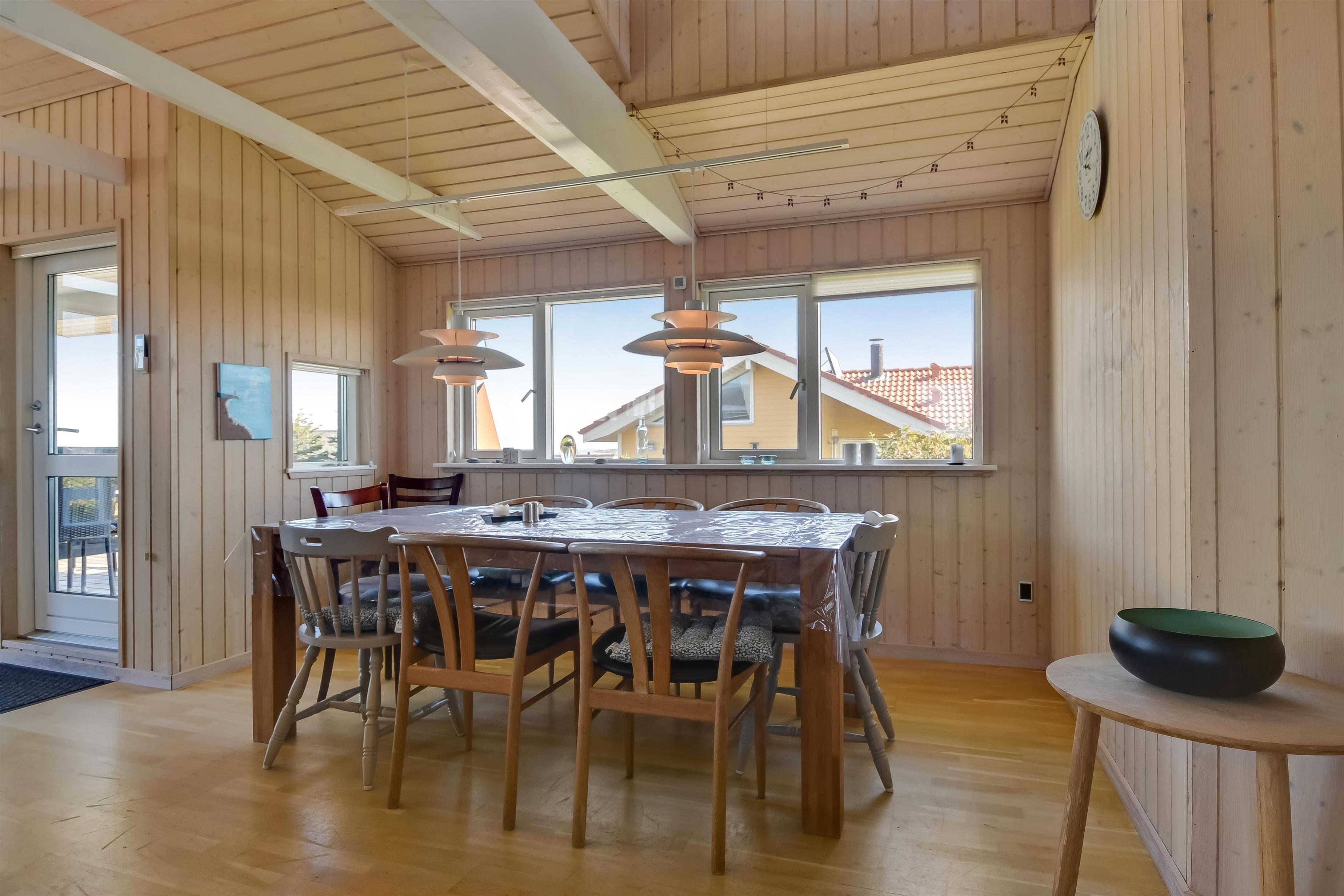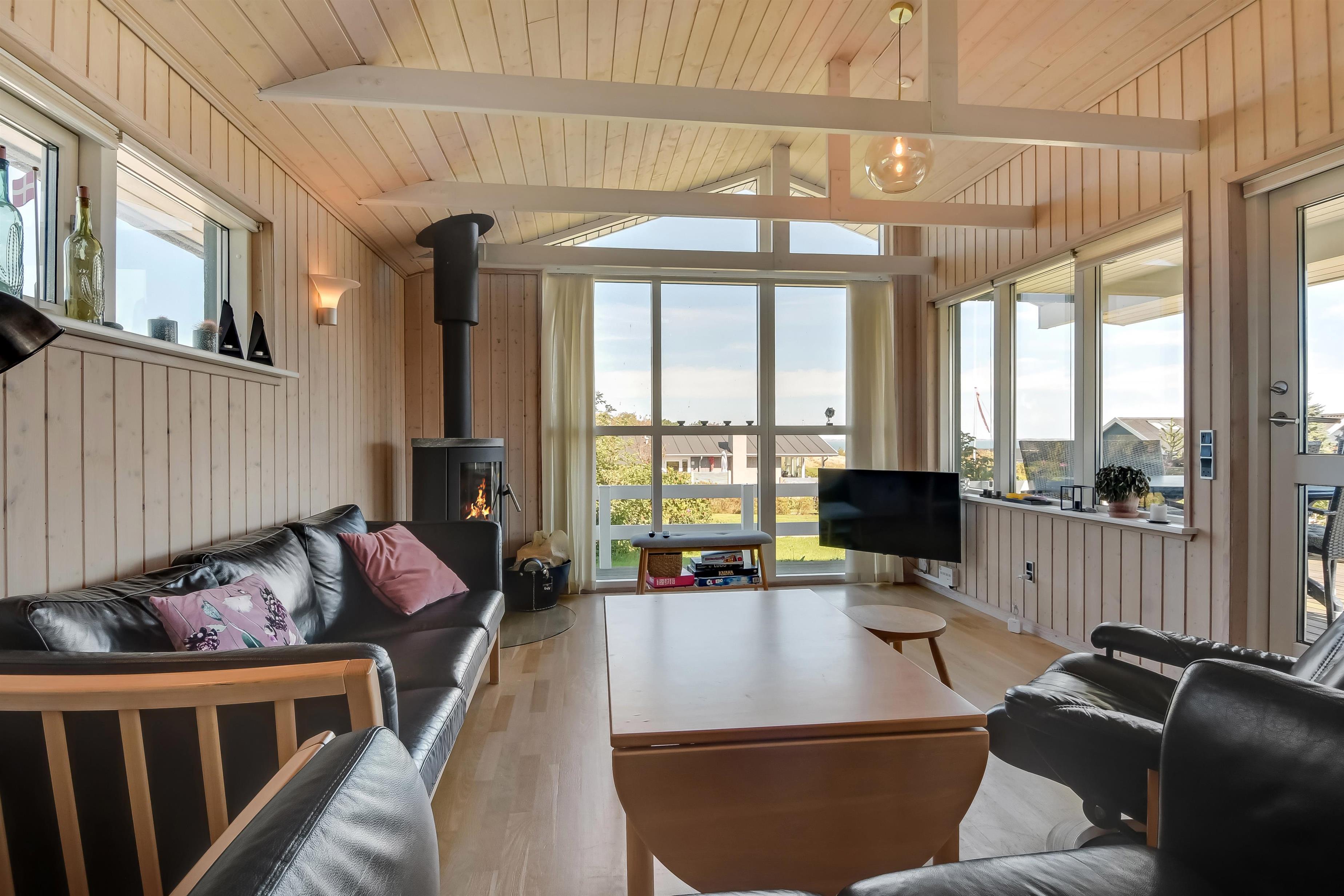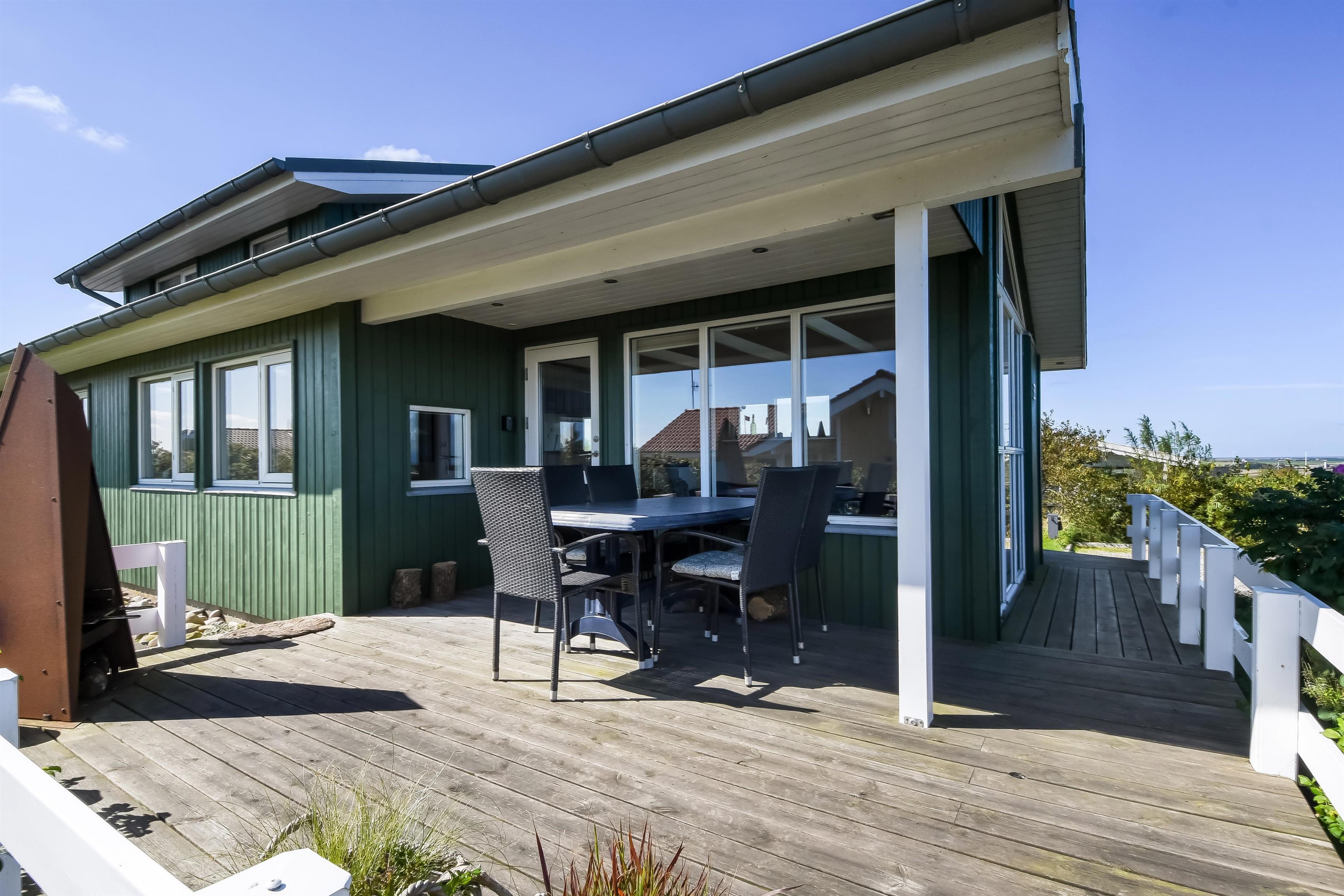 Huset har både åbne og overdækkede terrasser, udstyret med havemøbler og grill, som kan tilpasses efter behov. Uanset hvor du sidder, vil du kunne nyde læ- og solforholdene, og udsigten til Limfjorden er helt fantastisk. Der er et dejligt stisystem, som hurtigt fører dig ned til vandet. Cirka 500 meter fra huset ligger en ny, flot naturlegeplads i træ med både fodboldbane og rutsjebane – et hit for både store og små.