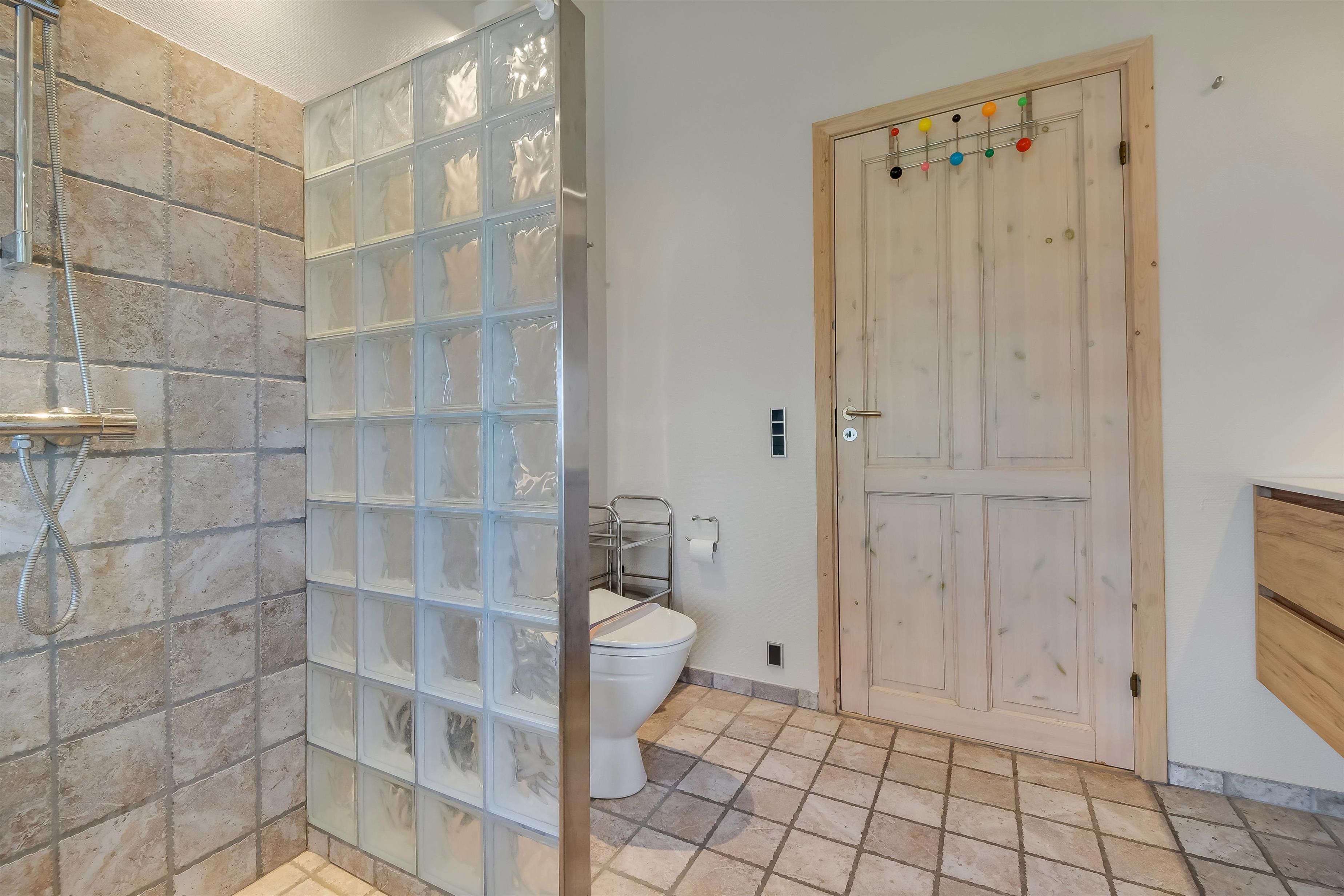 Badeværelse: Toilet, håndvask, bruser, spabad, gulvvarme.