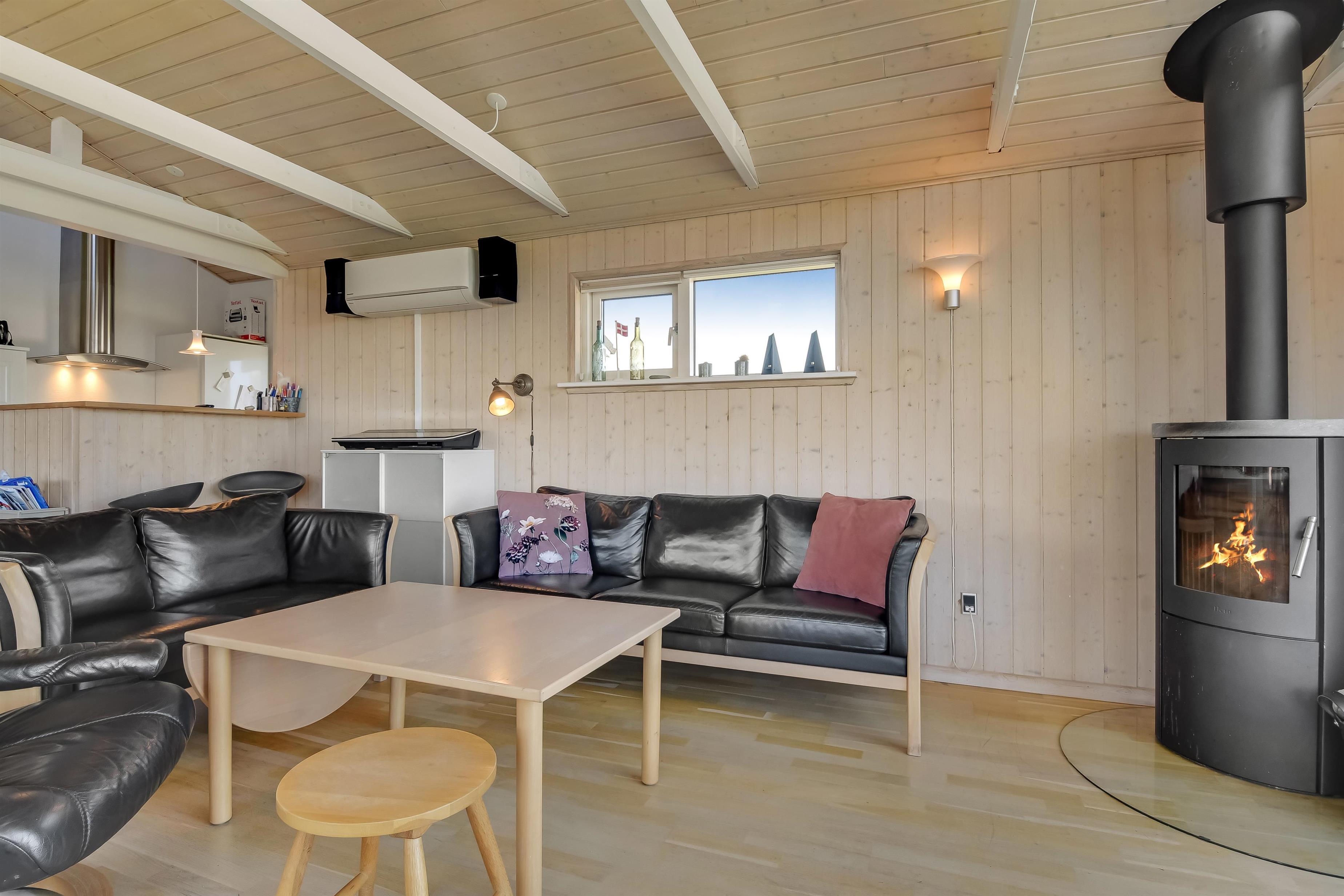 Stue: Brændeovn, varmepumpe, TV kun med Chromecast, stereoanlæg med CD.