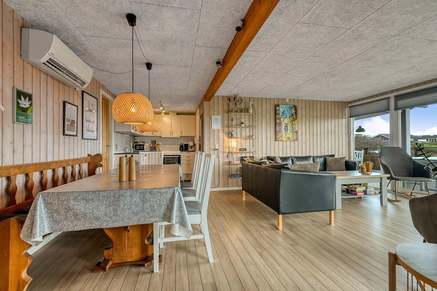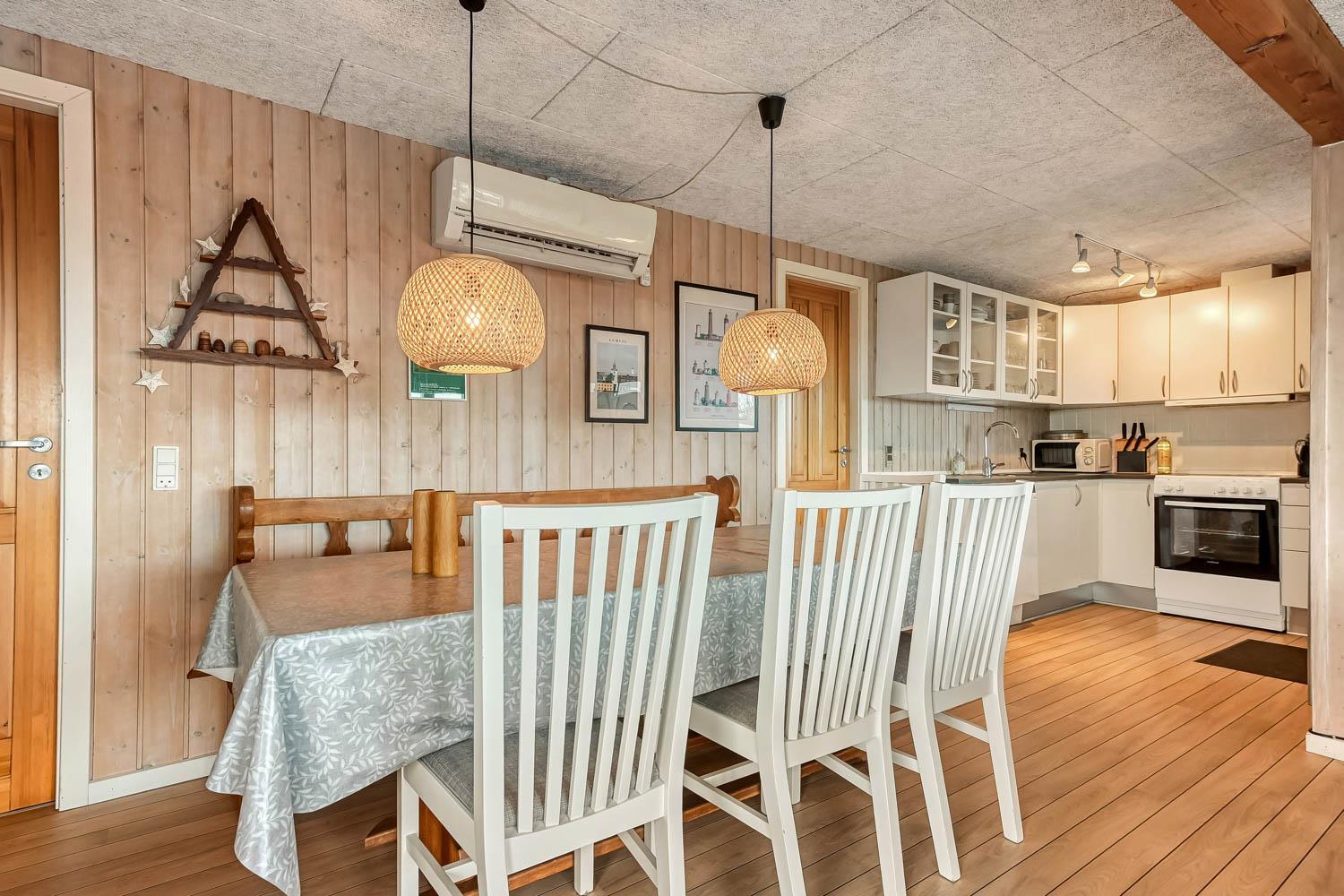 Flot og velindrettet feriehus på 65 m² med 3 gode soverum (1DS, 1DS, 1DS). Den kombinerede opholdsstue og det åbne køkken har store vinduespartier, der fremhæver den unikke udsigt over fjorden og skaber en lys og indbydende atmosfære.
