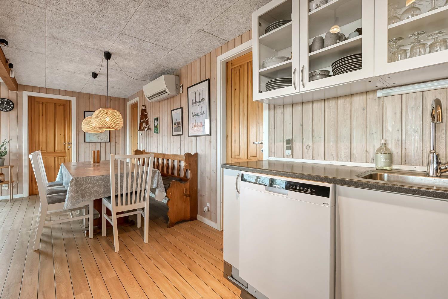 Køkkenhjørnet er veludstyret med alt i service og køkkengrej samt komfur med glaskeramiske kogeplader, emhætte, mikrobølgeovn, opvaskemaskine, køleskab og fryser. I opholdsstuen findes komfortable lædermøbler, spisebord, radio, TV med danske og tyske programmer, Chromecast og mulighed for streaming af egne abonnementer.