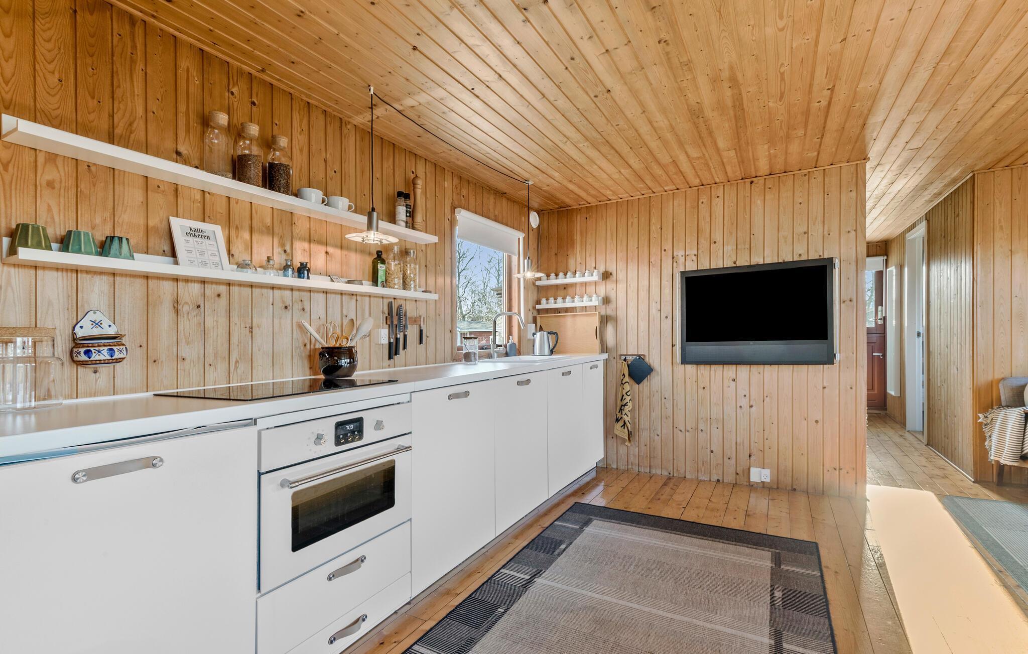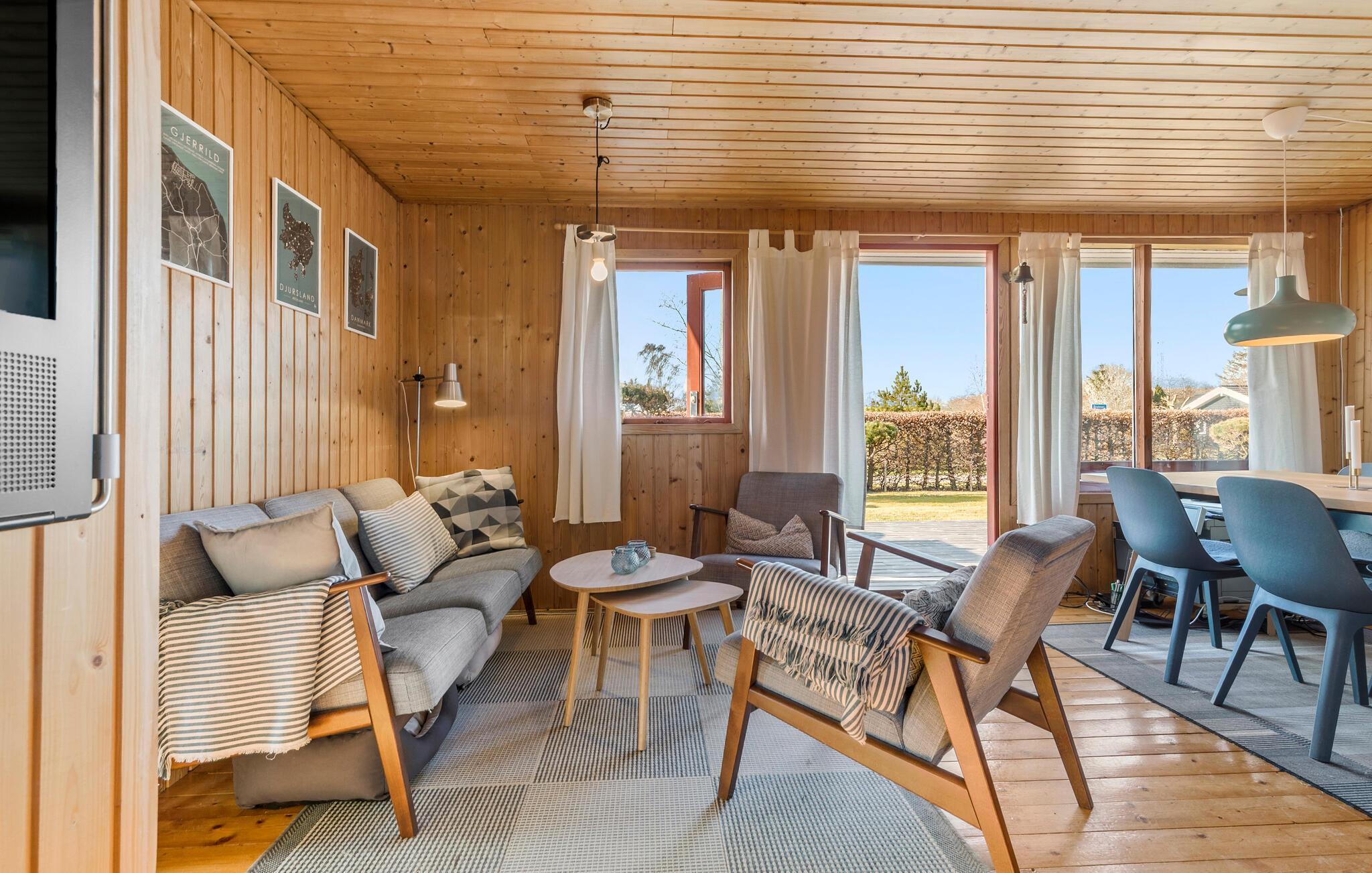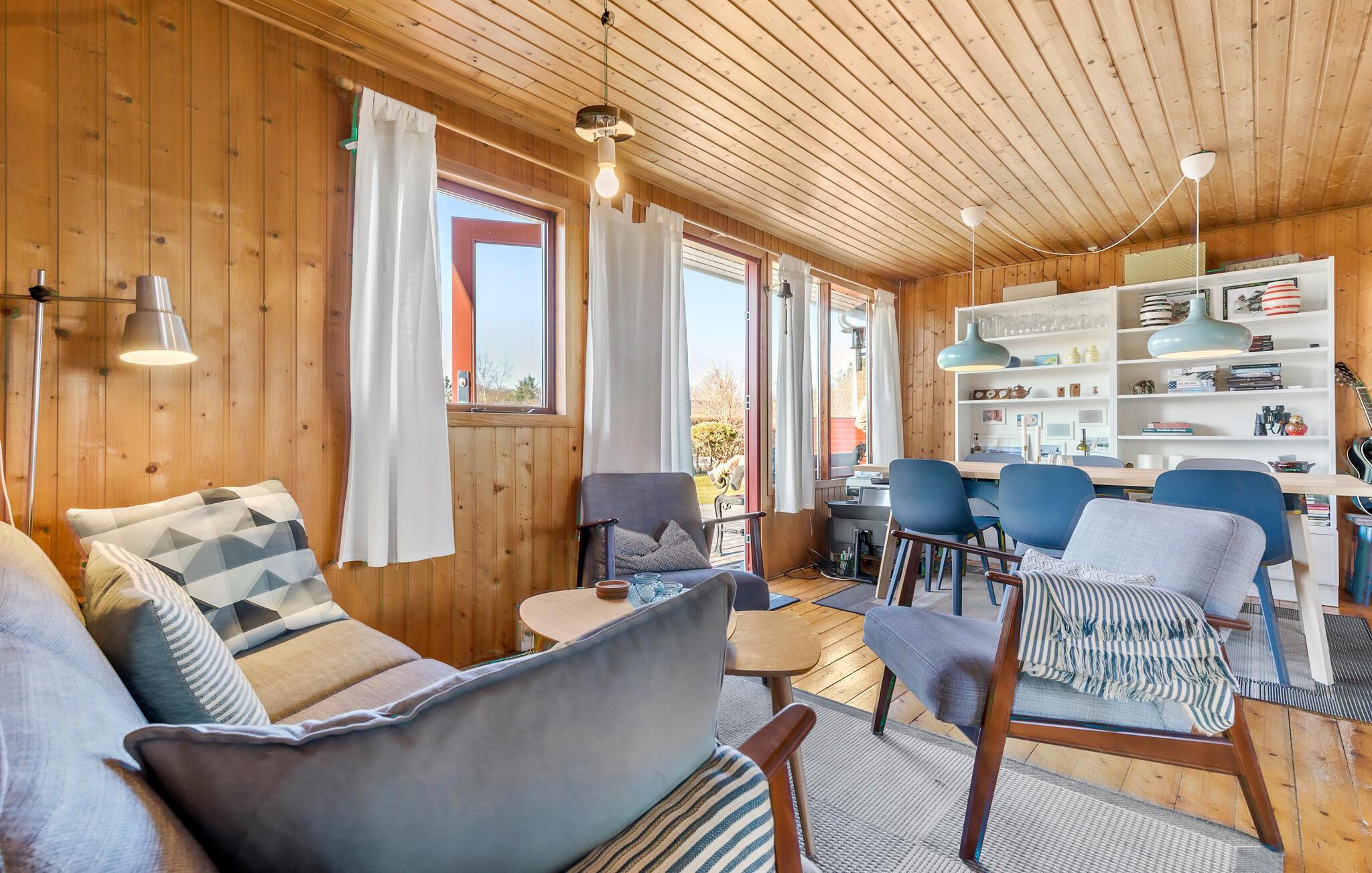 Velkommen til dette sommerhus, som kun er en kort gåtur fra den nærmeste strand. Tilbring afslappende stunder i den hyggelige opholdsstue med komfortable siddepladser og direkte adgang til terrassen. Det åbne køkken er praktisk indrettet og lægger op til hyggestunder med fælles madlavning. Der er et dejligt lys ud mod haven ved spisebordet, så her får I gode rammer om måltiderne og rolige aftener med brætspil. Husets varme træfarver skaber i sig selv en særlig ro, som gør, at alle kommer ned i gear.