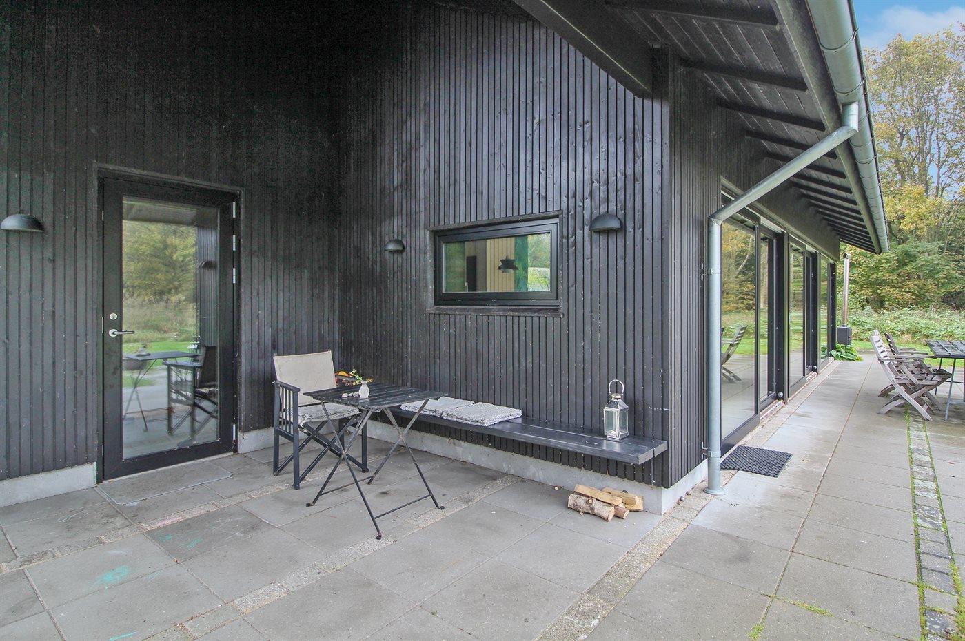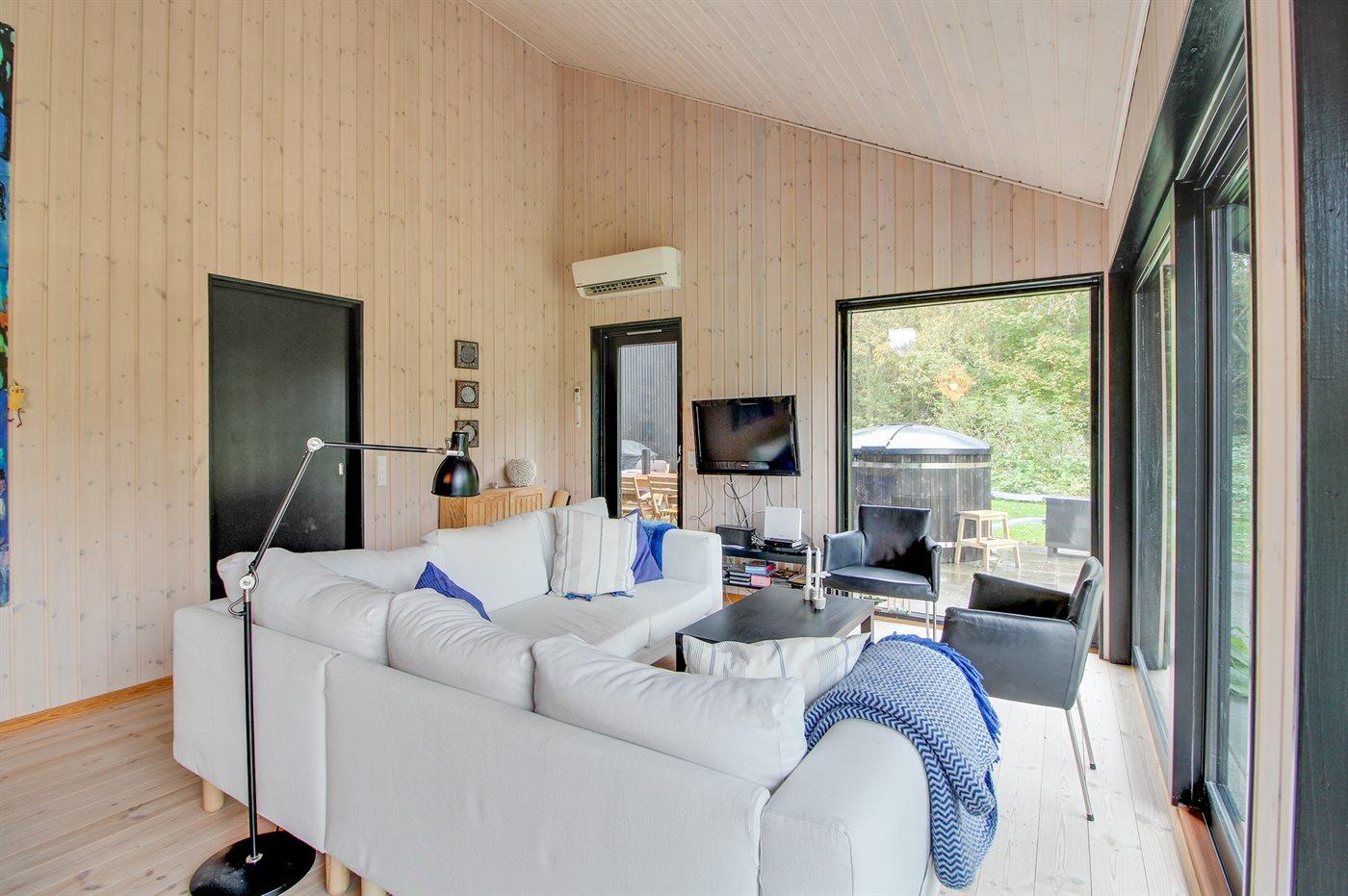 Nyt sommerhus i Gjerrild nær havet med store vinduespartier og vildmarkskar til afslapning.