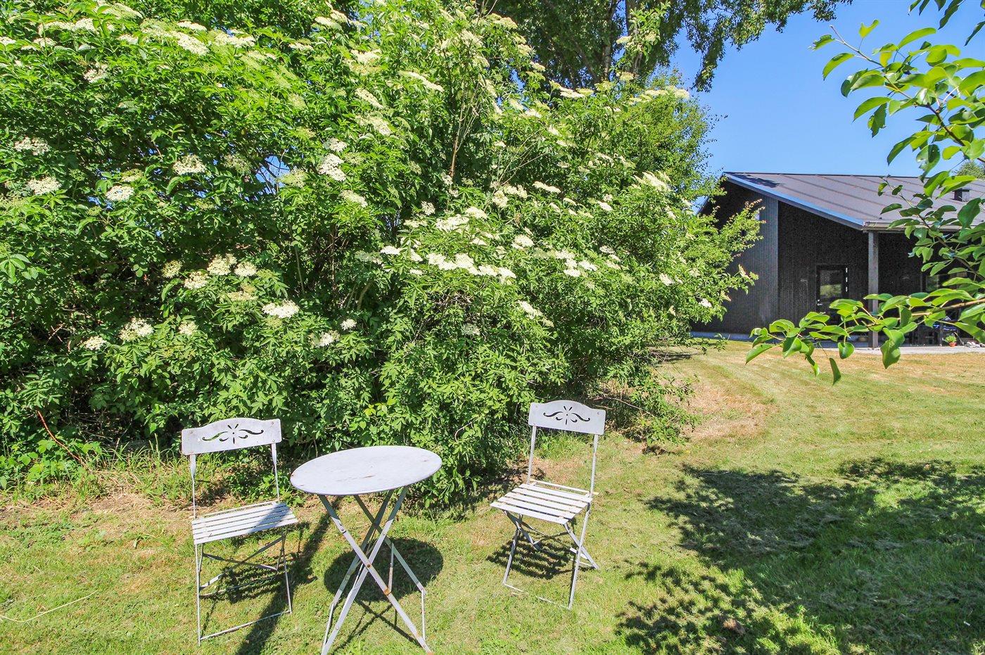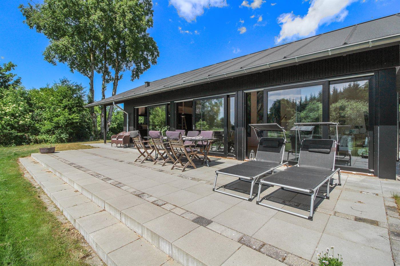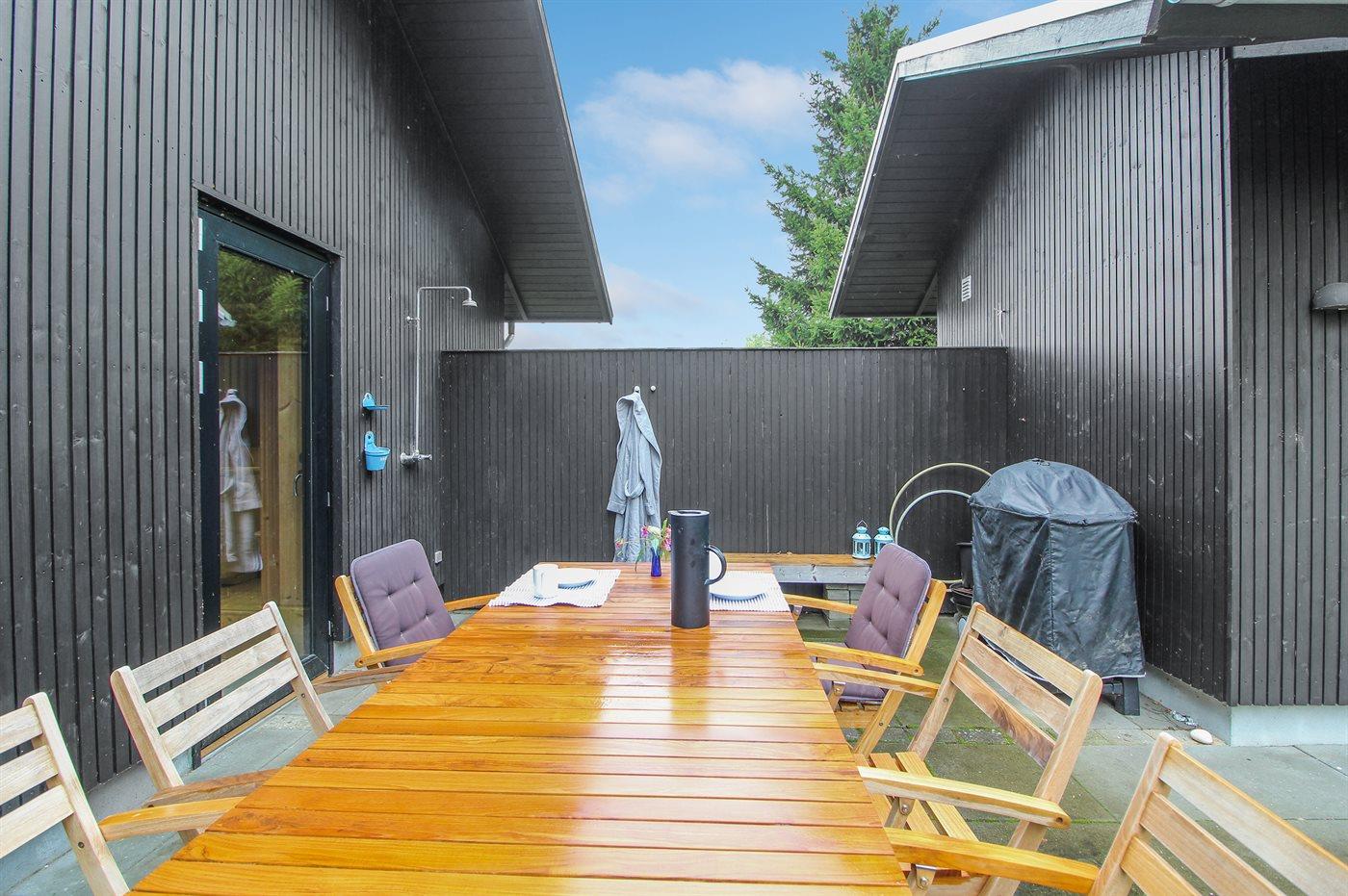 Ferieboligen er beliggende på en 1650 m² stor naturgrund. Der er 850 m til havet. Nærmeste forretning er beliggende i en afstand af 500 m. Der er en golfbane i en afstand af 15000 m. Til ferieboligen hører 100 m² terrasseareal. Desuden er der 10 m² overdækket terrasse. Udendørs bruser. Der er installeret stik til opladning af elbil. Parkering ved ferieboligen.