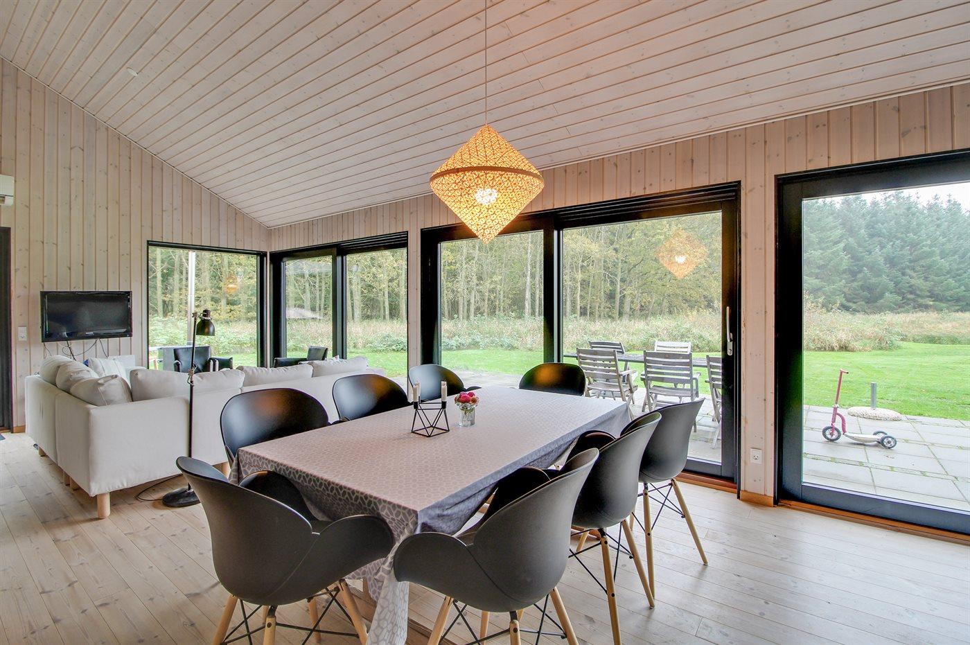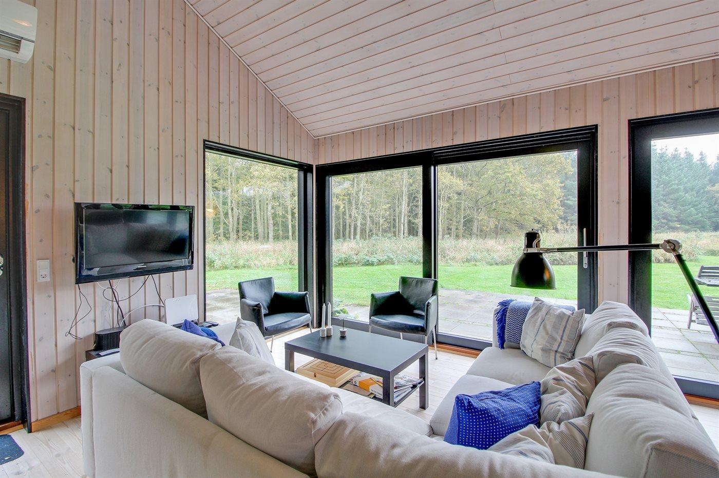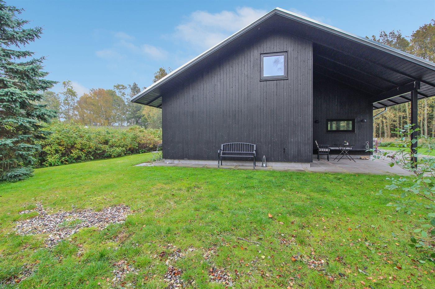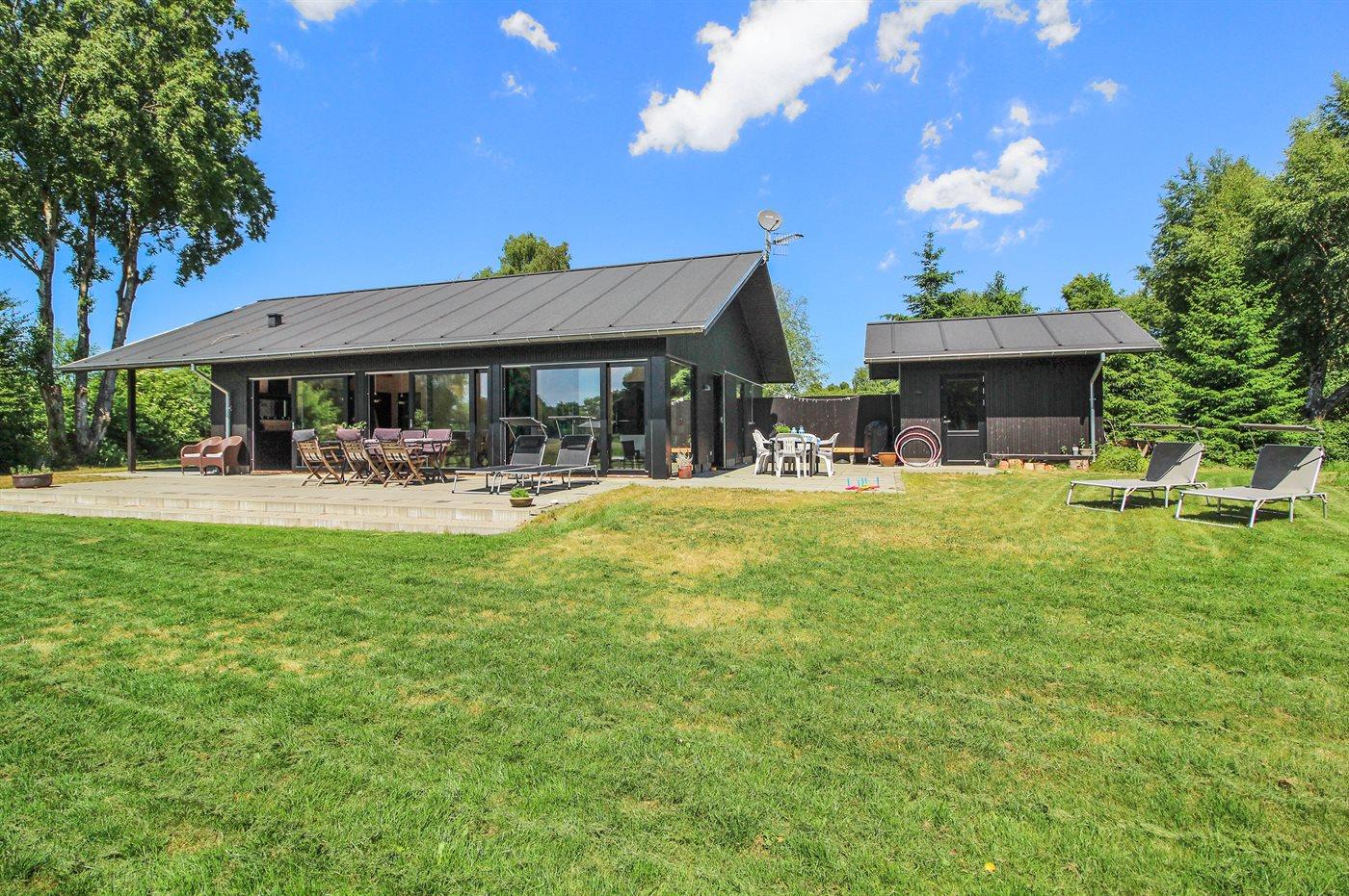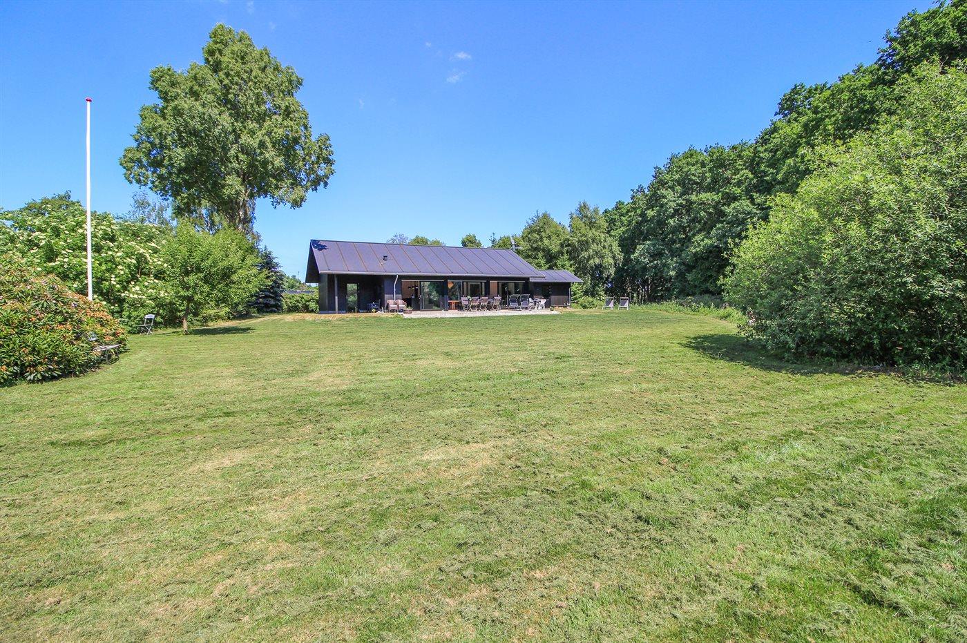 Nyt sommerhus beliggende ugenert for enden af lukket vej i udkanten af et roligt og naturskønt sommerhusområde nær havet og skøn badestrand. Den ene side af det flotte og velindrettede hus er ene store vinduespartier, som gør at man føler sig i ét med naturen, og kan nyde den flotte udsigt over grunden og det omkringliggende landskab. Huset byder på god plads samt en hems, hvor 2 af sovepladserne befinder sig.