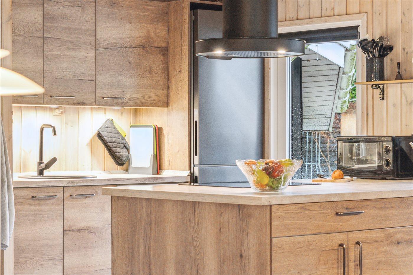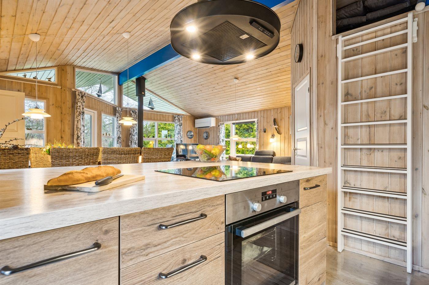 Køkkenet er udstyret med 1 køleskab. Der er 4 induktionskogeplader, varmluftovn, mikrobølgeovn samt opvaskemaskine.