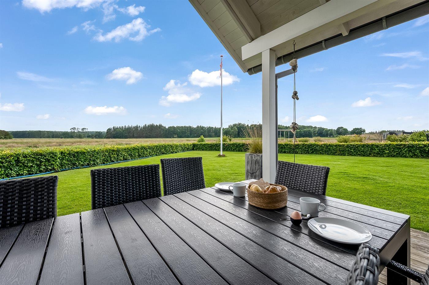 Huset ligger i et forholdsvist nyt kvarter for enden af en blind vej. Her har man fra stuen udsigt til en smuk eng, hvor man være heldig at se alt lige fra musvåge til kronvildt.