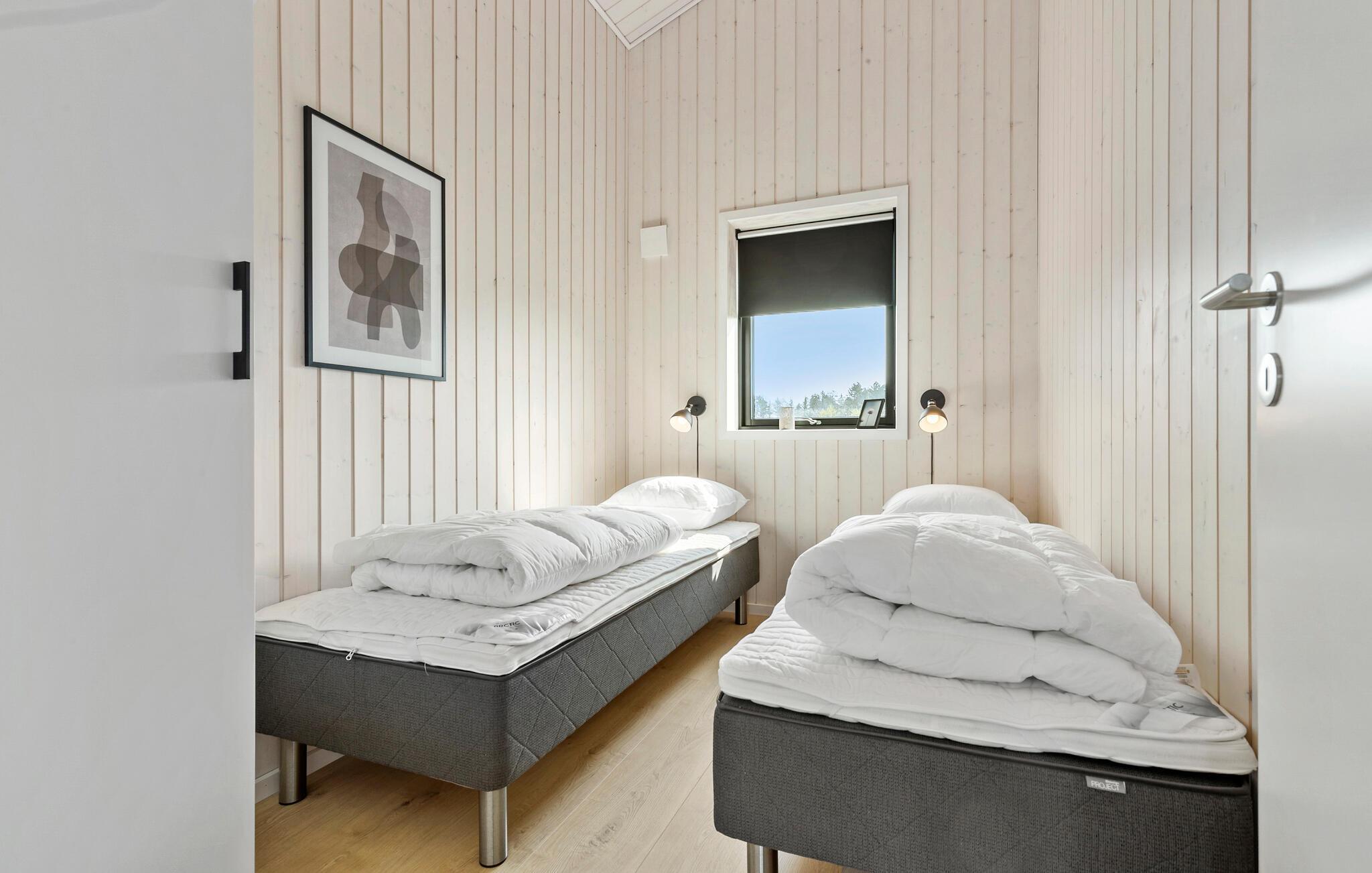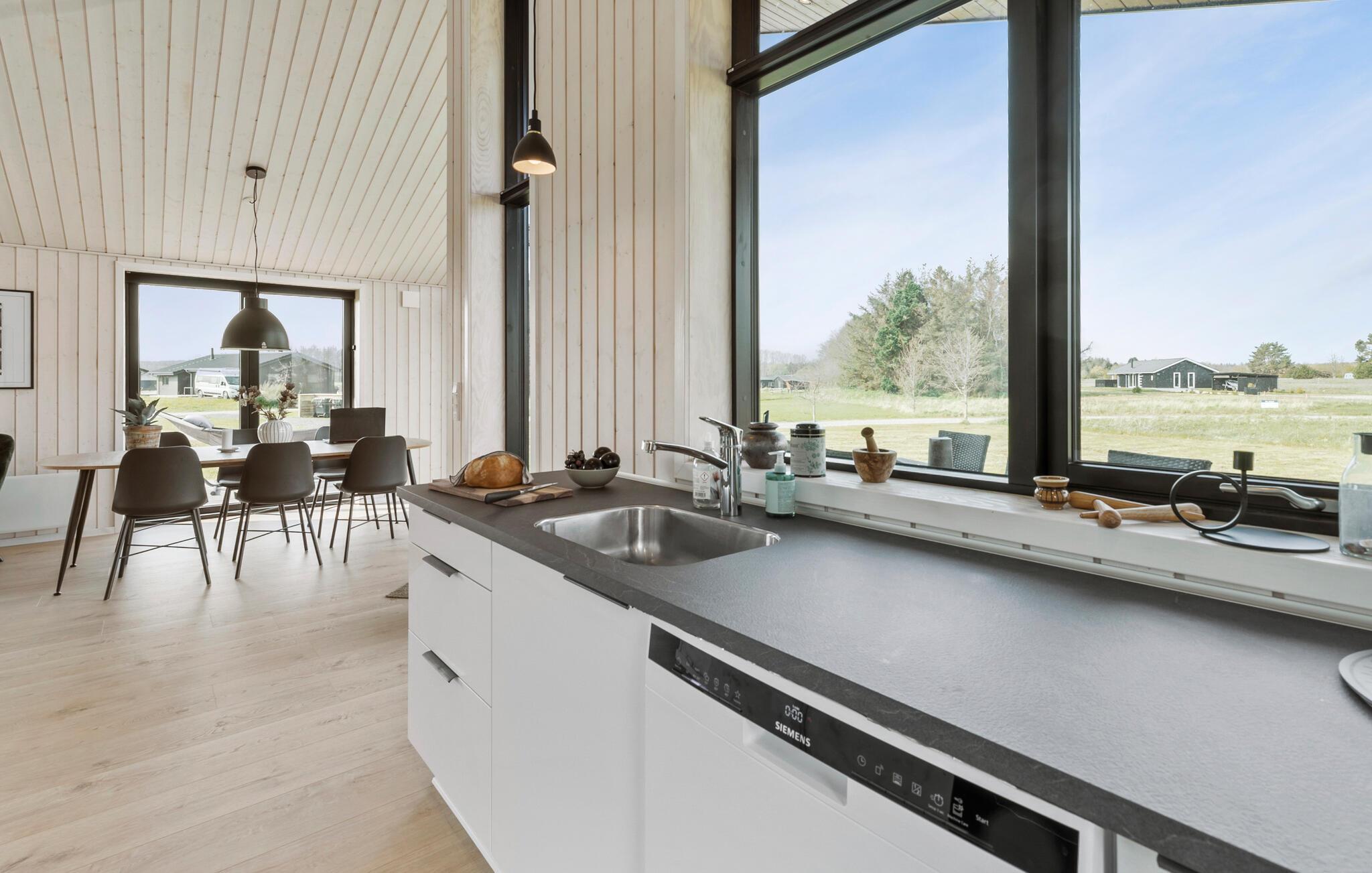 På det yderste af Jyllands næse ligger dette flotte hus, der byder på god plads og lækre faciliteter til en ferie med den udvidede familie. Indretningen fremtræder moderne og enkelt på den elegante måde, og med de komfortable møbler får I en lille oase, hvor I kan hvile stængerne efter dagens udflugter. Gennem de store vinduer får I en dejlig udsigt til omgivelserne, som I kan nyde under jeres måltider.