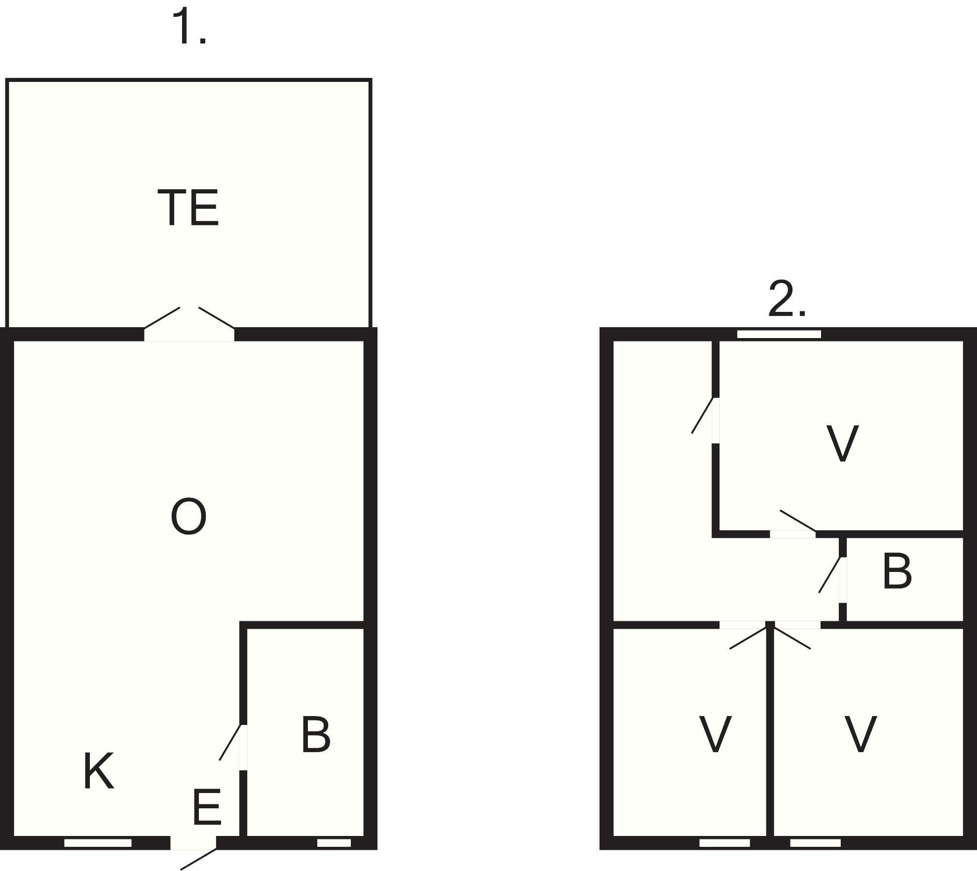 Fra køkken/alrum er der direkte udgang til terrassen. Badeværelset har bruseniche, toilet og håndvask. På første sal ligger soveafdelingen med gæstetoilet og tre dejlige, lyse soveværelser, alle indrettet med dobbeltsenge (to 90 x 200 cm senge skubbet sammen som dobbeltseng). Pejsen i stuen skaber den helt rigtige stemning, når mørket falder på.