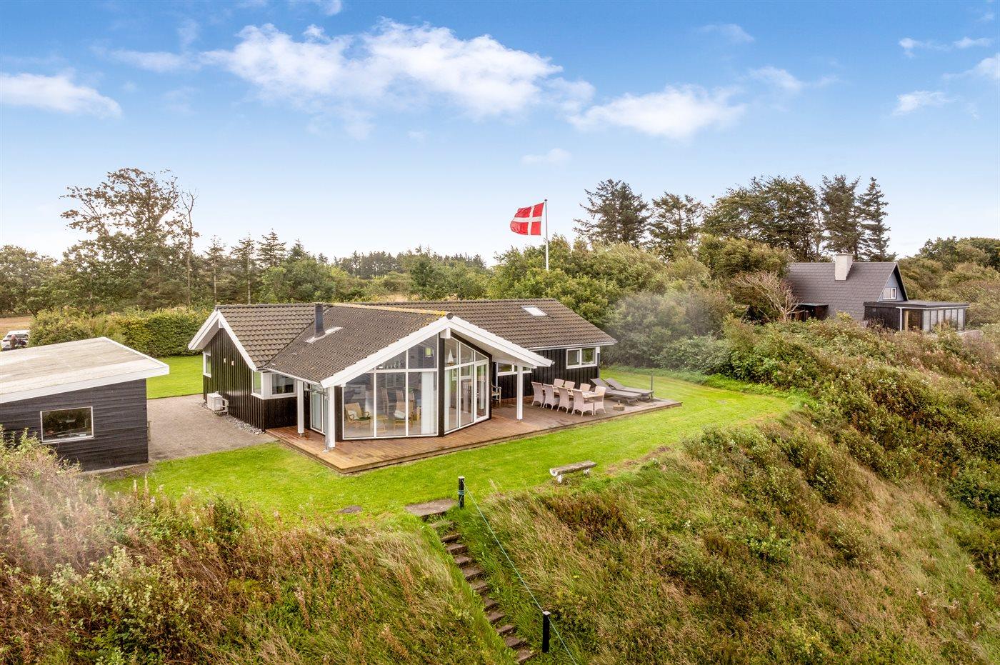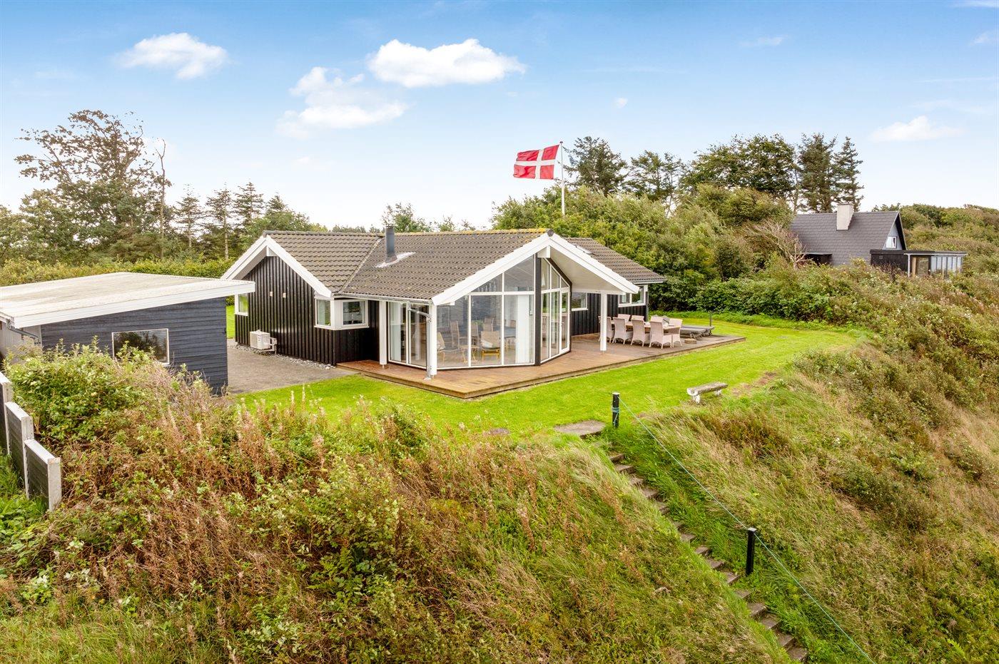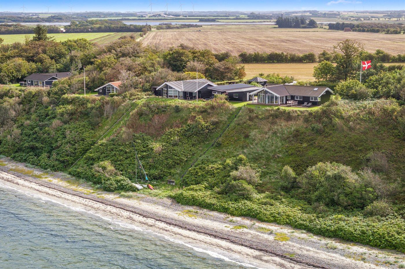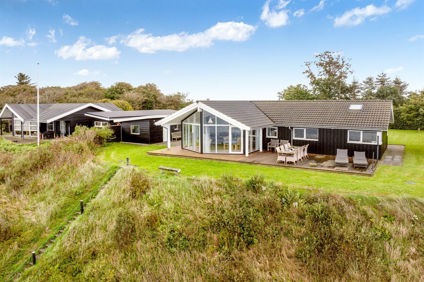 Højt beliggende og med smuk panoramaudsigt over Limfjorden finder du dette sommerhus, som ligger ud til en skrænt, hvor en trappe fører direkte ned til vandet.