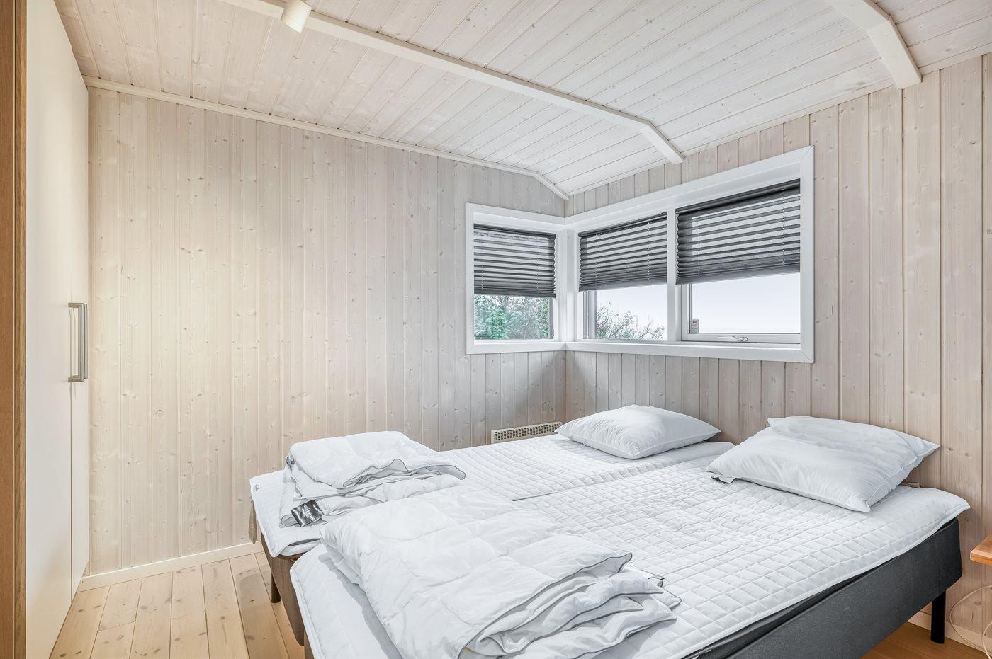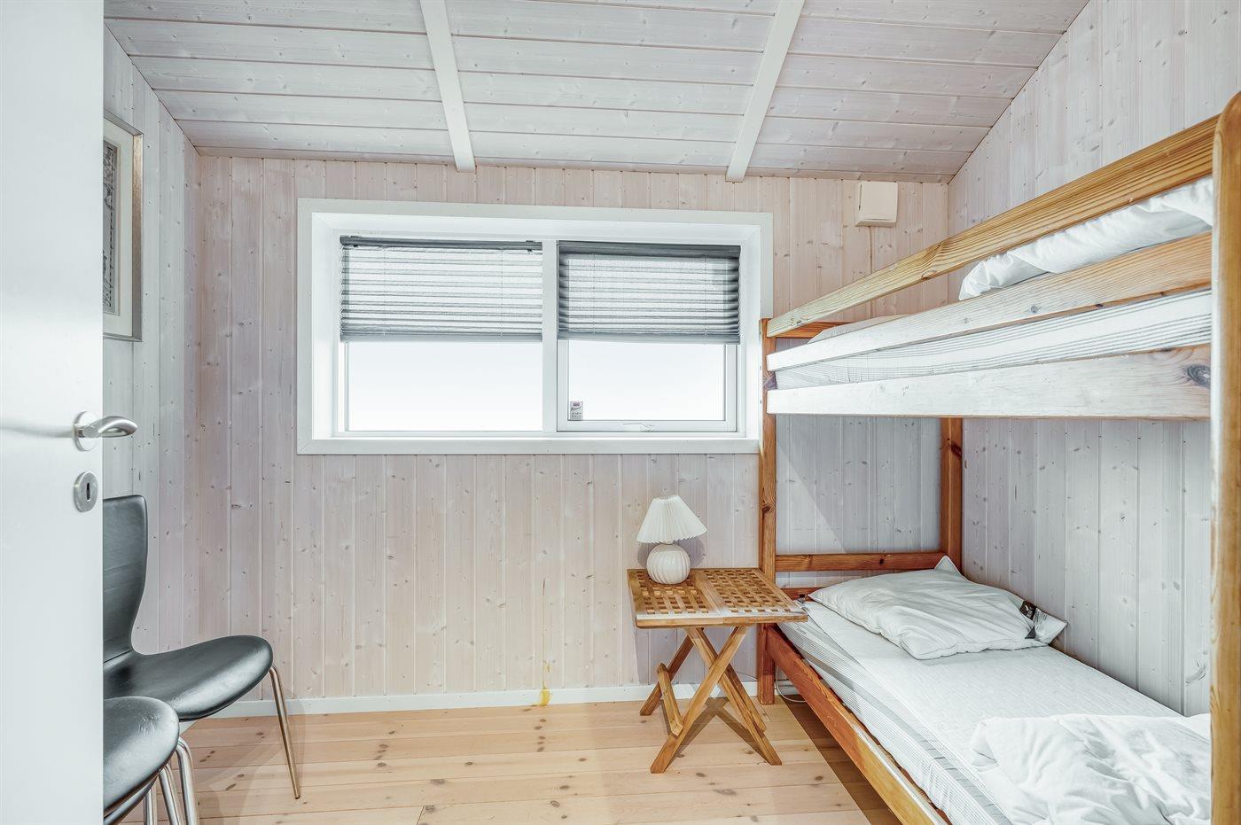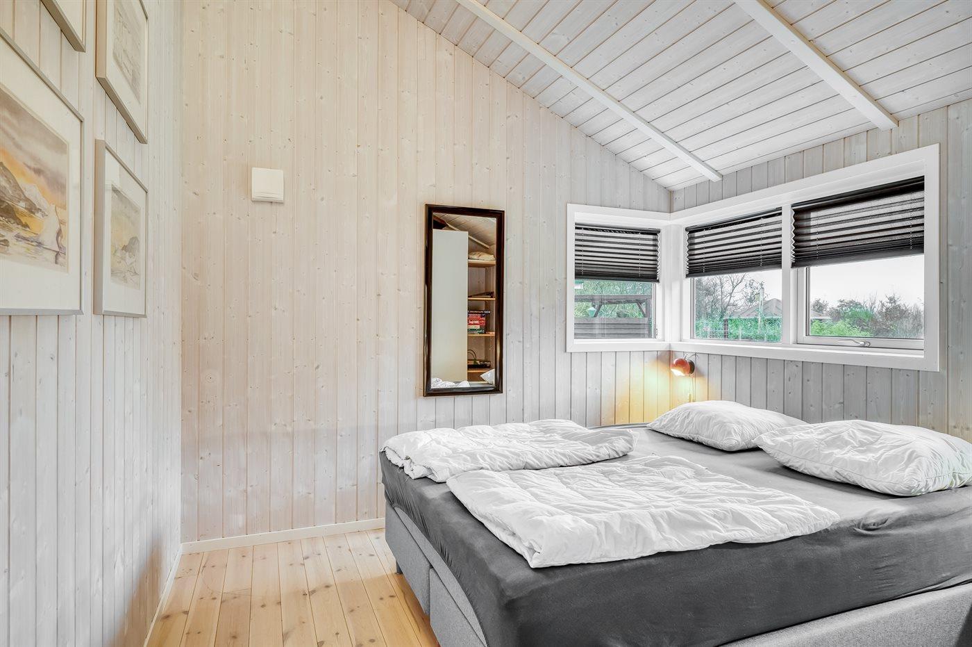 Der er i alt 3 soveværelser. Sovepladserne fordeler sig på: 2 sovepladser i dobbeltseng. 2 sovepladser i enkeltsenge. 2 sovepladser i køjeseng. 2 sovepladser på madrasser. 2 af disse sovepladser befinder sig på husets hems.