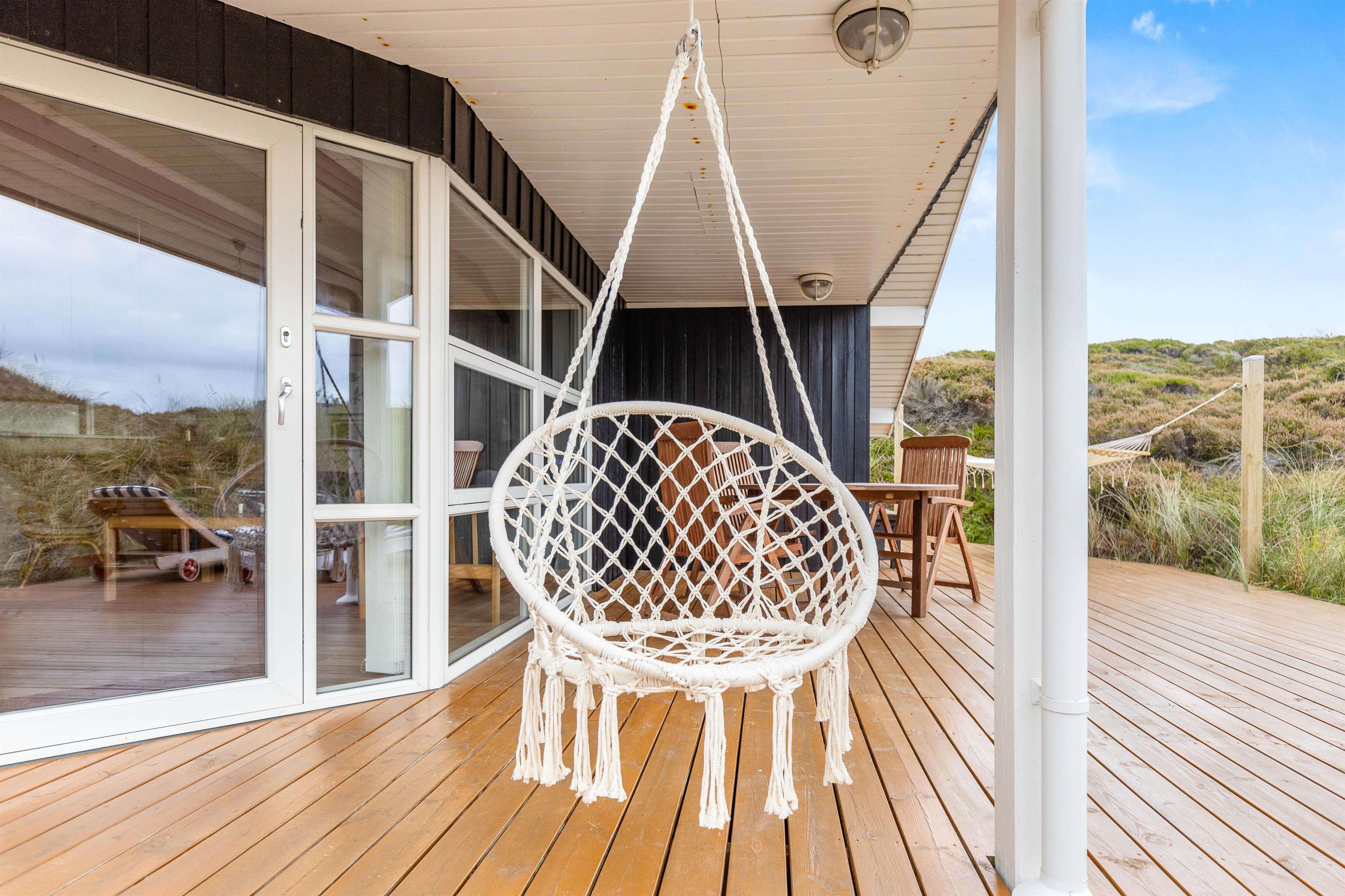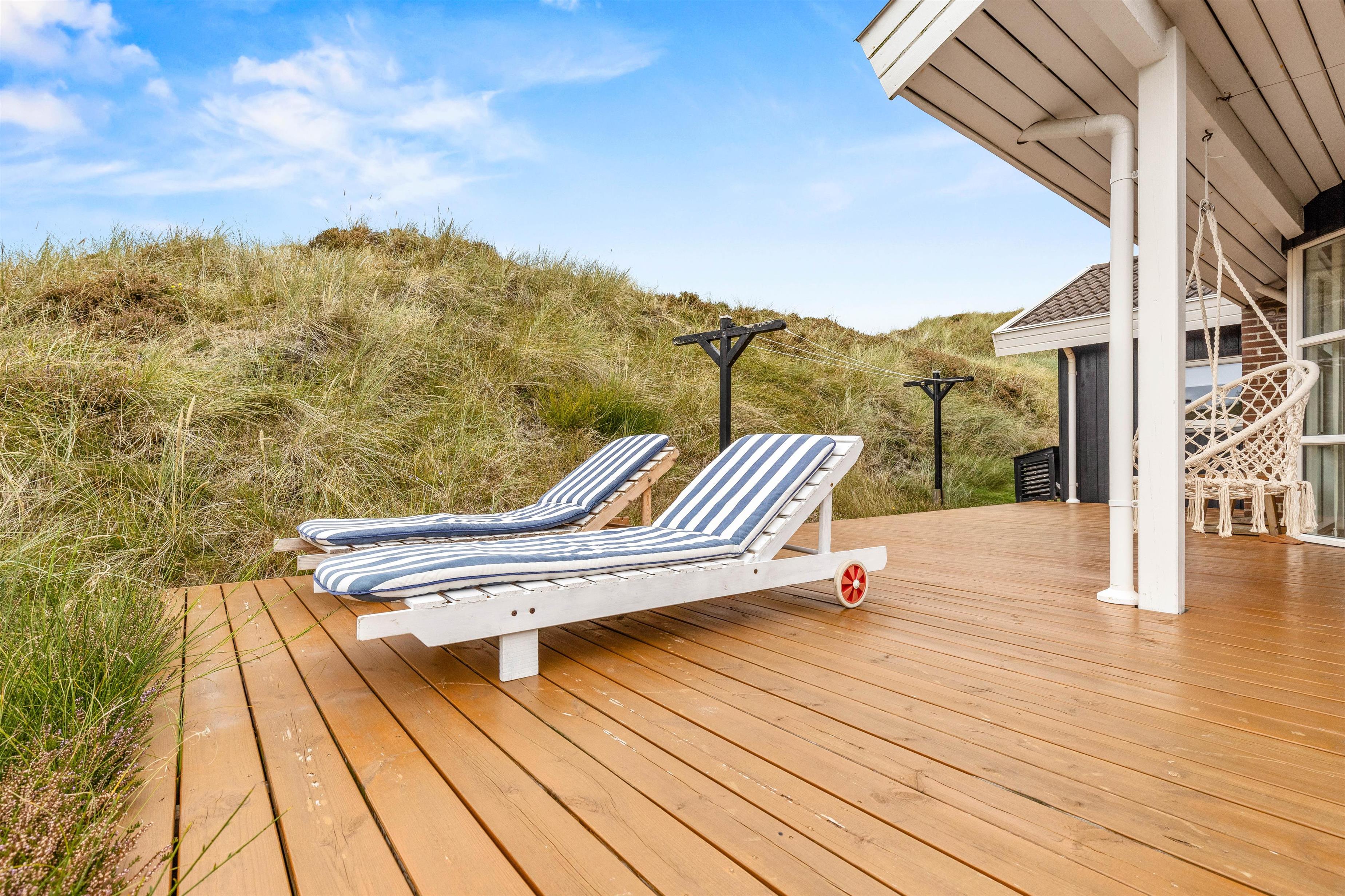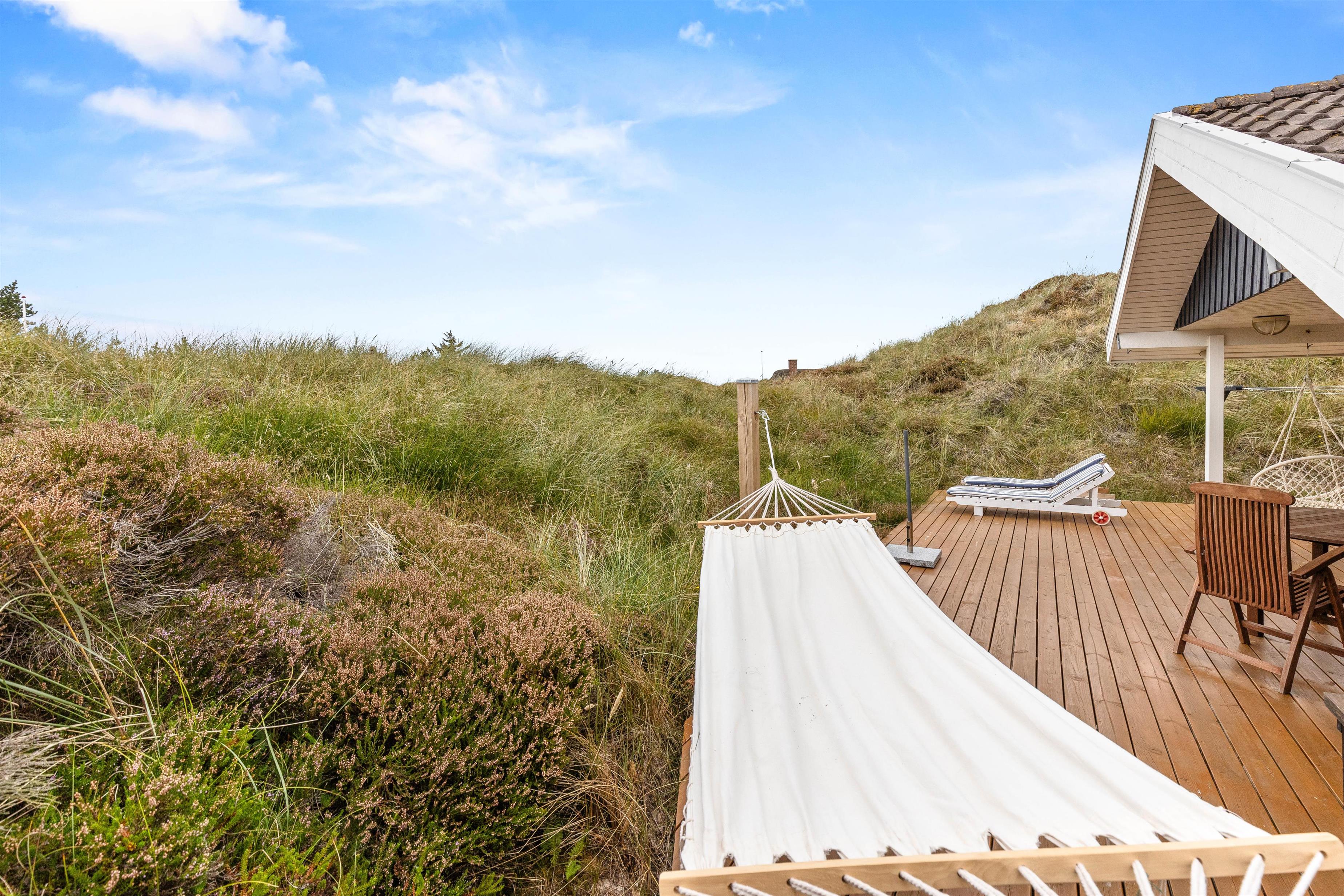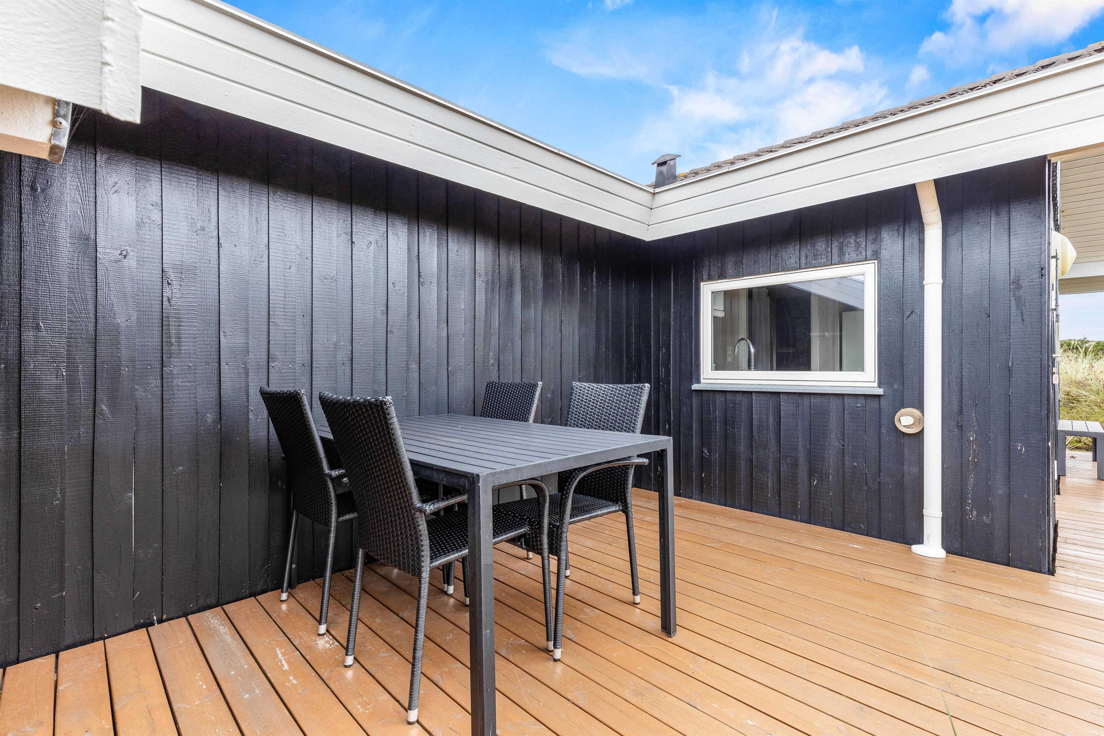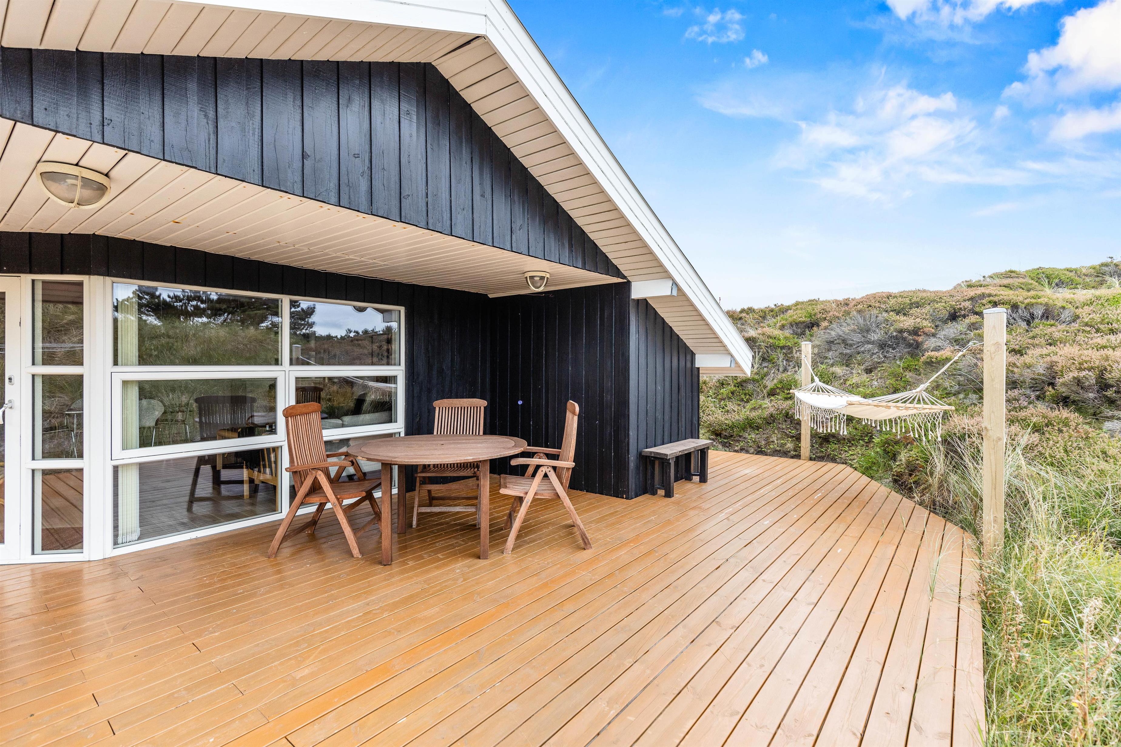 Fra alrummet kan I træde ud på sommerhusets træterrasse, der er det helt oplagte sted at tilbringe feriens solrige dage. På terrassen kan I sætte jer godt til rette i havemøbler og liggestole, mens I bare nyder ferie, sol og afslapning. Terrassen er delvist overdækket, og derfor har I også mulighed for at sidde i skyggen, skulle solens stråler blive for skrappe.