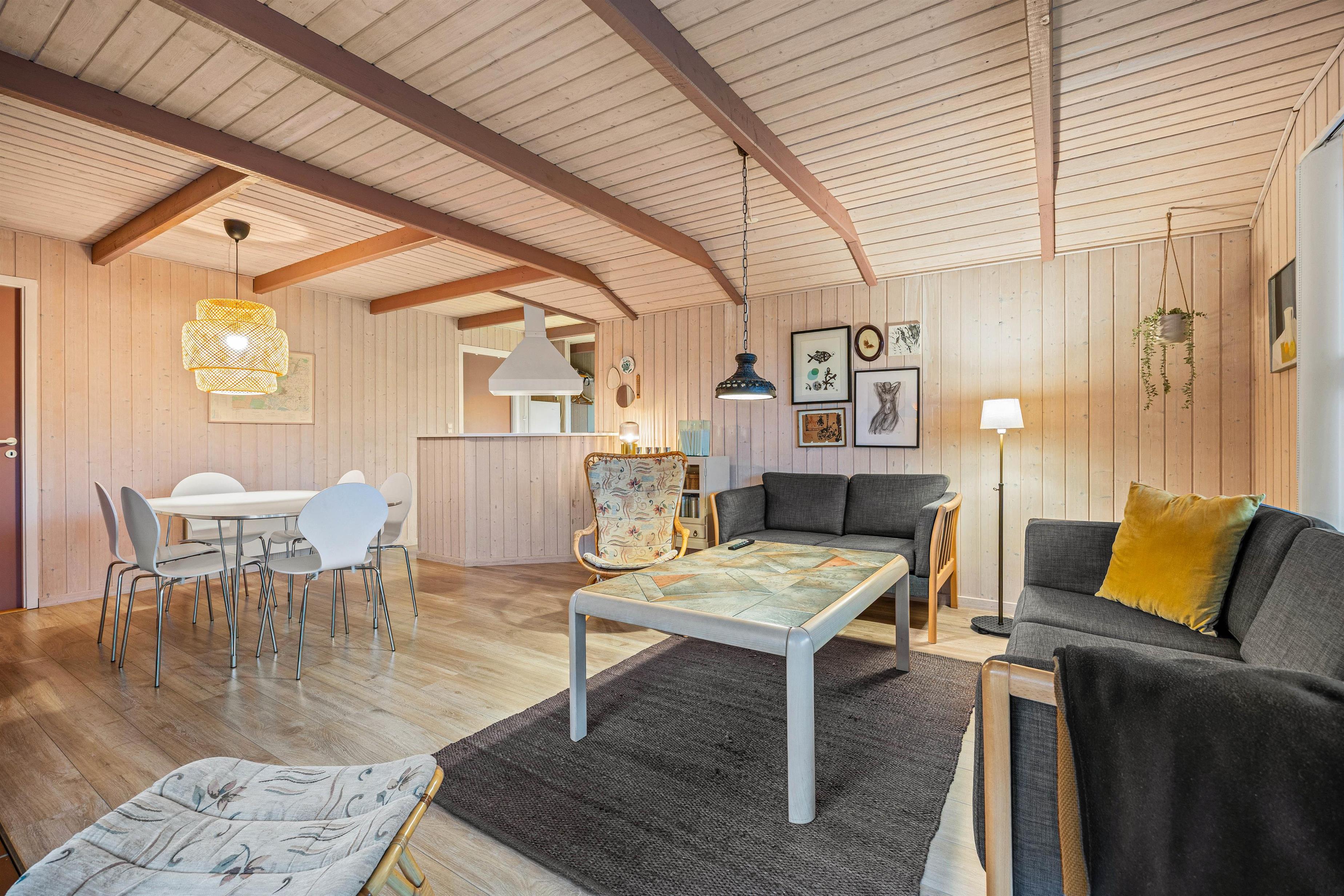 Allerede når I træder ind i det nyrenoverede (2022) sommerhus på Bjørnedalen 11 i Grærup Strand, vil I hurtigt komme til at føle jer hjemme. Her bliver I nemlig mødt af den lyse, hyggelige indretning med synlige bjælker og et dejligt lysindfald.