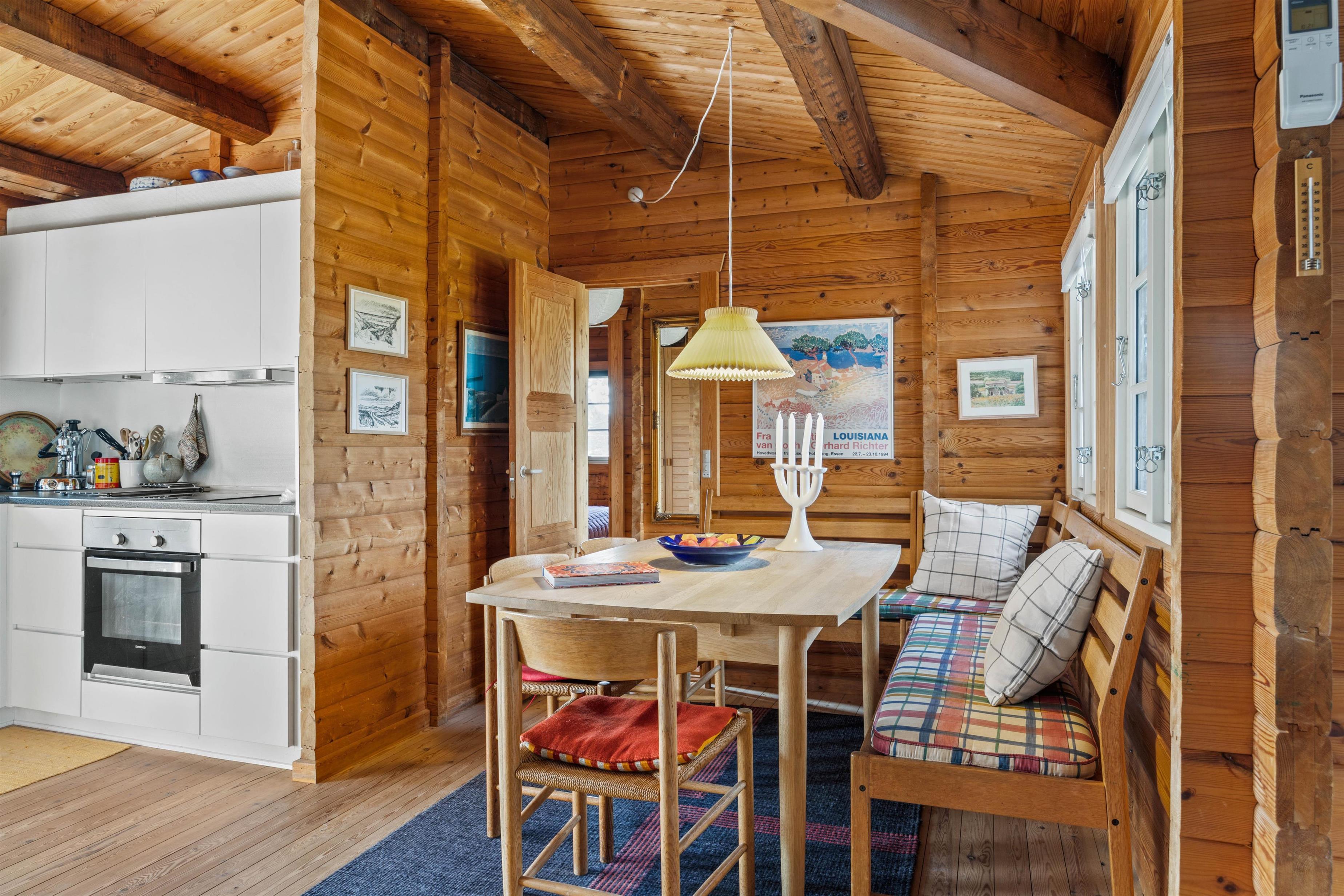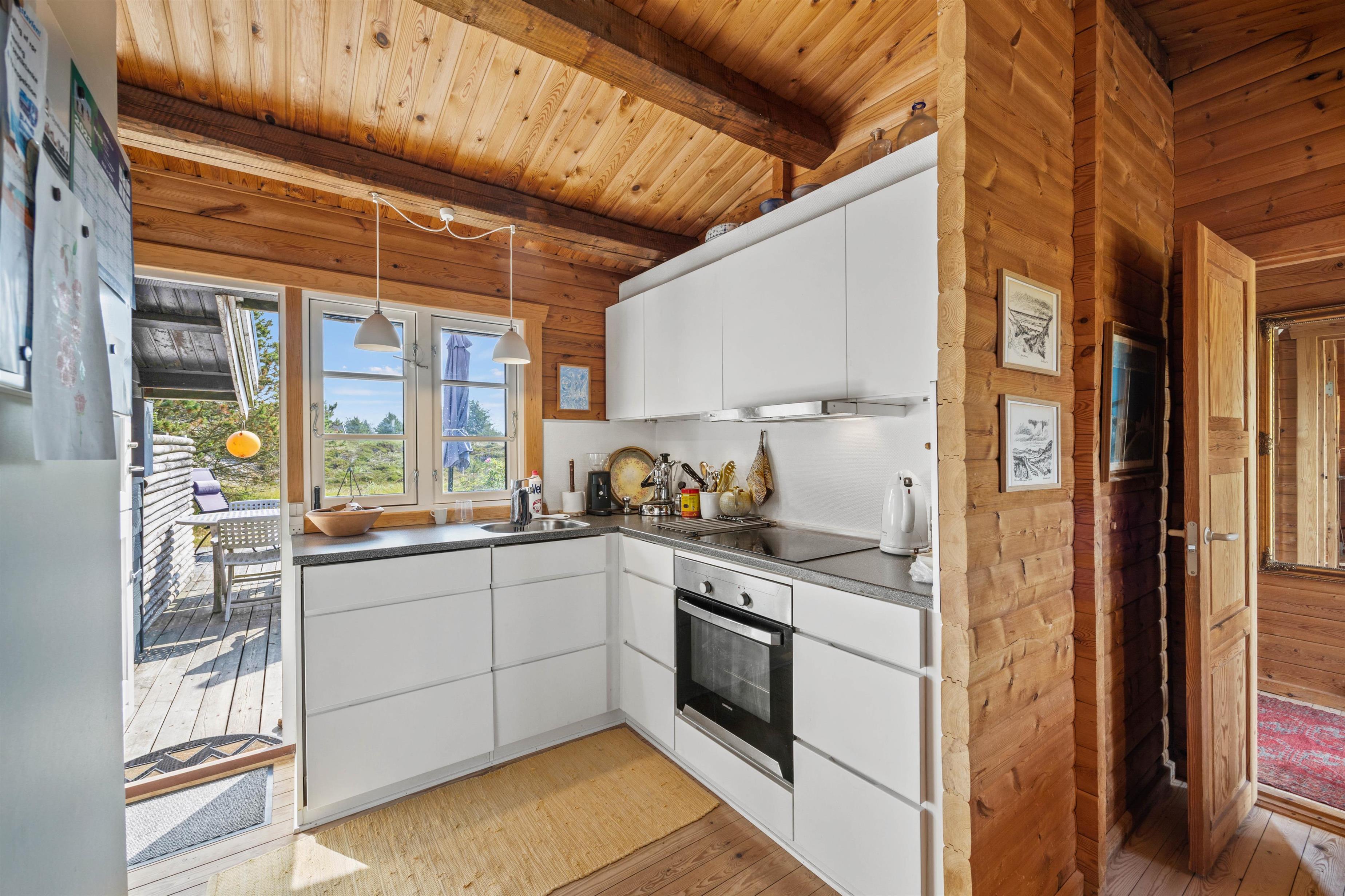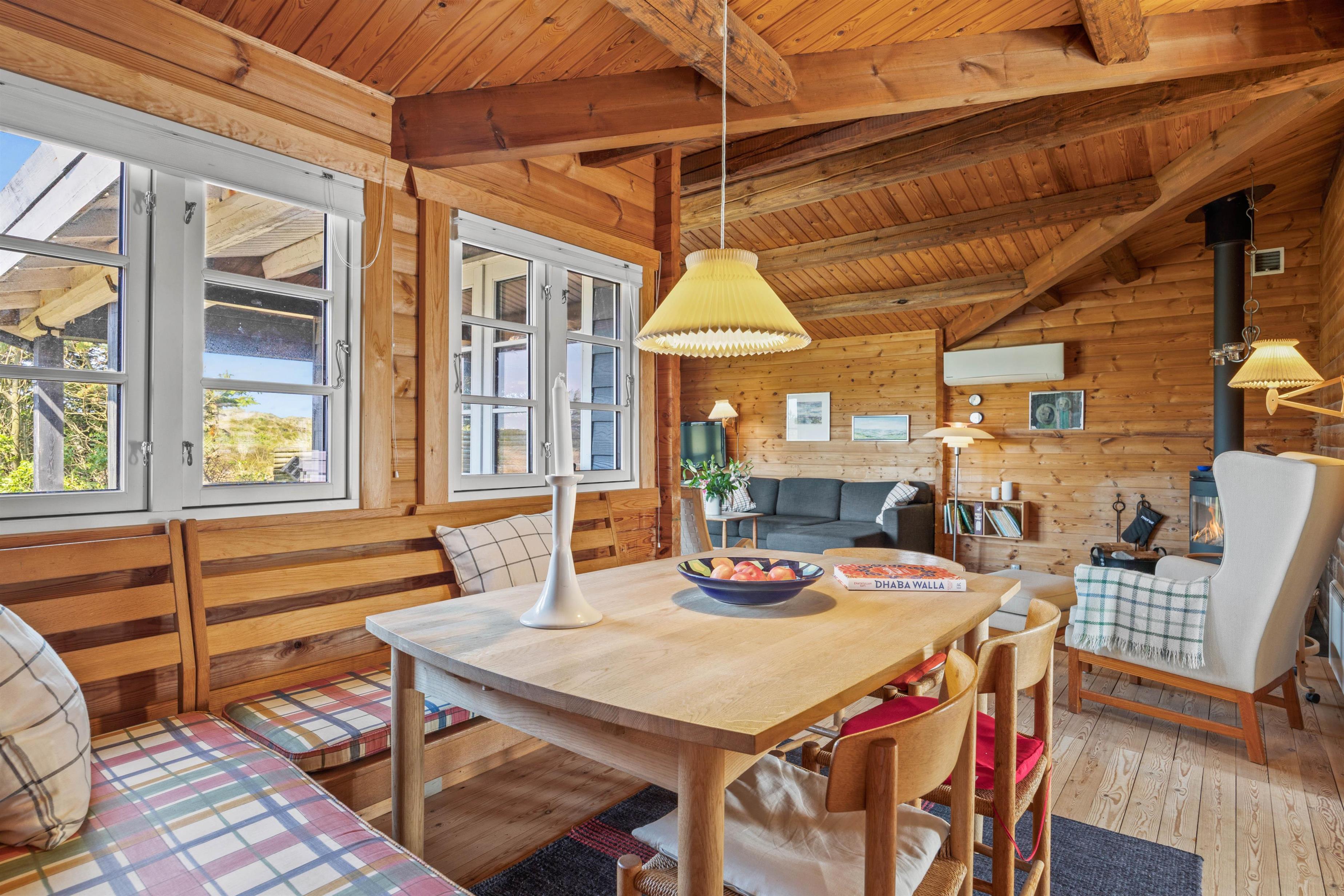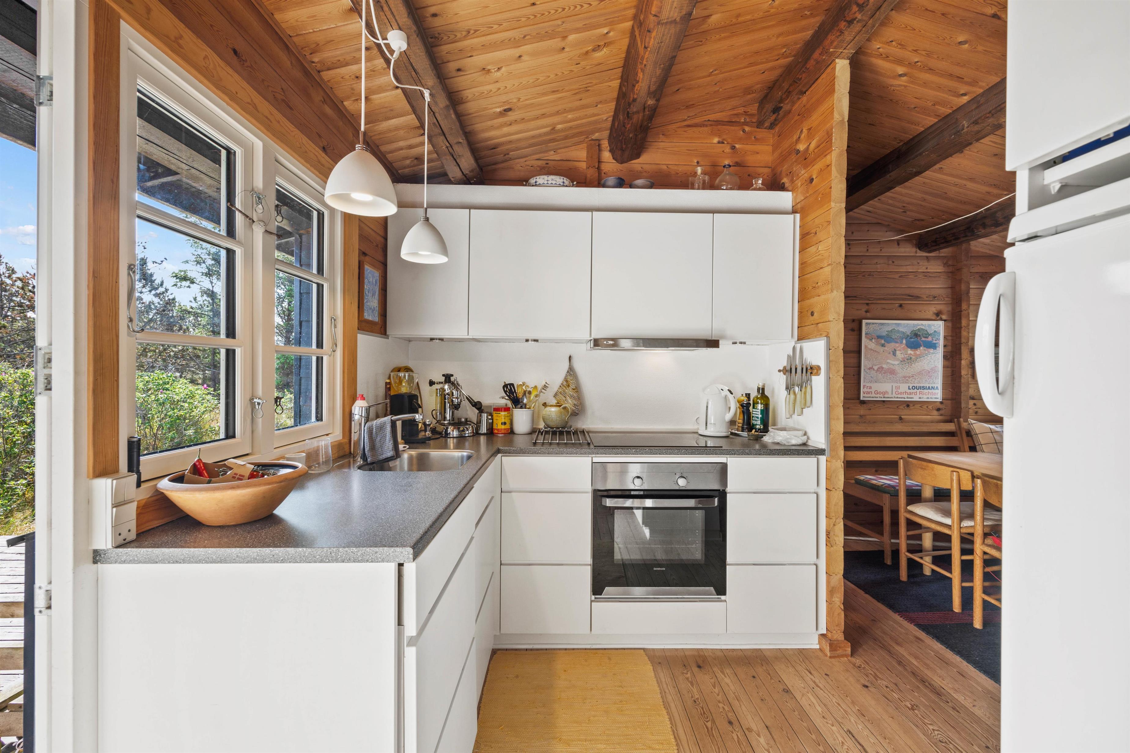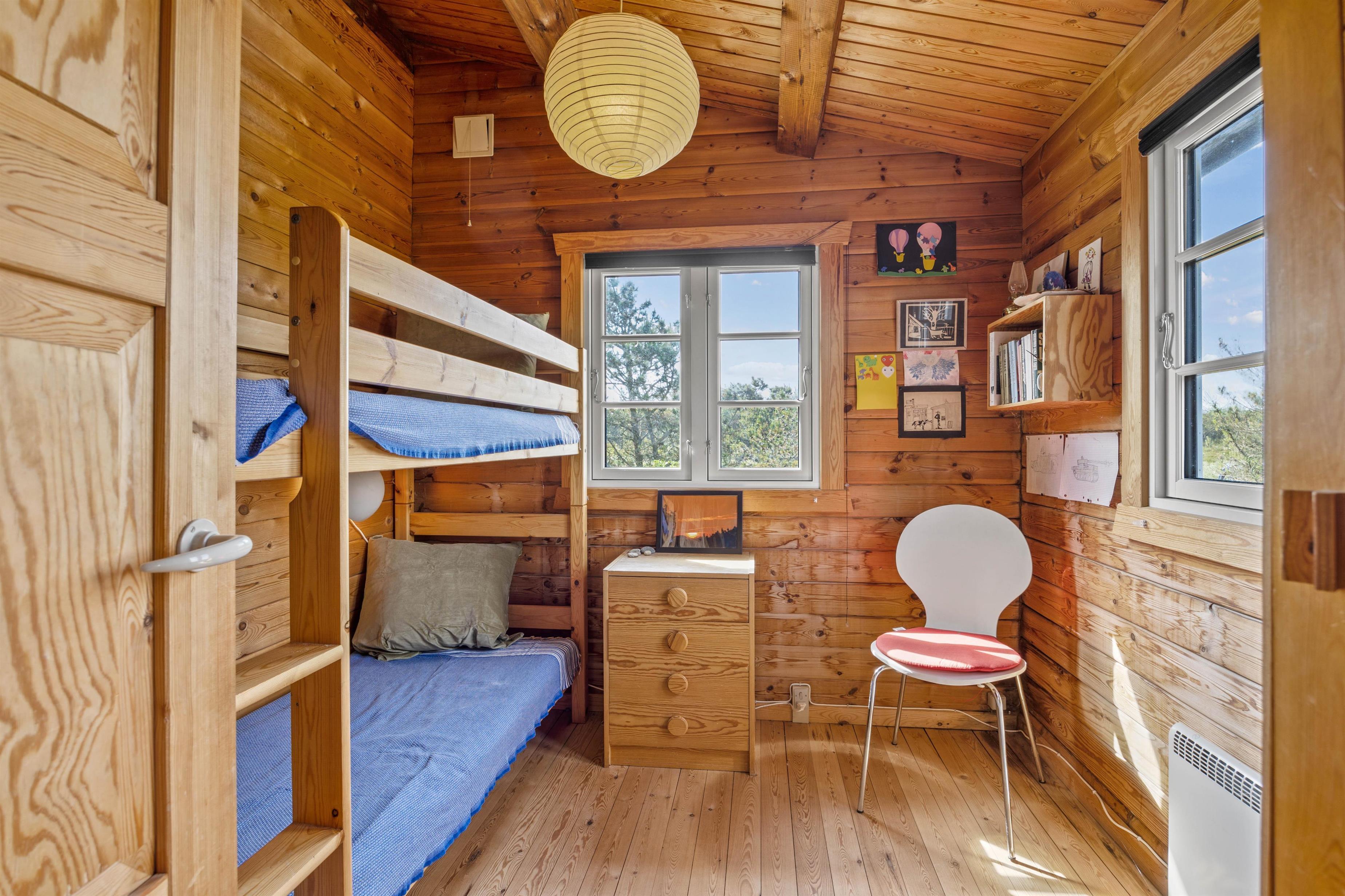 I det klassiske træbeklædte sommerhus kan der bo seks gæster fordelt på tre soveværelser, hvoraf det ene værelse er et ideelt børneværelse med køjesengen – det vil børnene helt sikkert se frem til. Sommerhusets samlingspunkt og hjerterum er det hyggelige køkken-opholdsrum, hvor der er højt til loftet og smukke spær i loftet. Gennem de store vinduer i stuen skinner det naturlige lys smukt ind, mens den bløde hjørnesofa venter på jer. Her kan I samles om et spil, læse den medbragte ferielæsning i den behagelige lænestol foran den knitrende brændeovn.