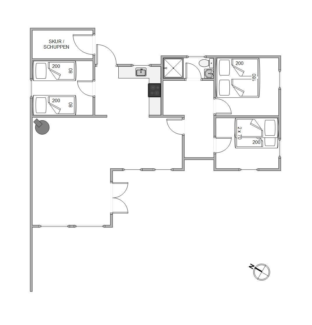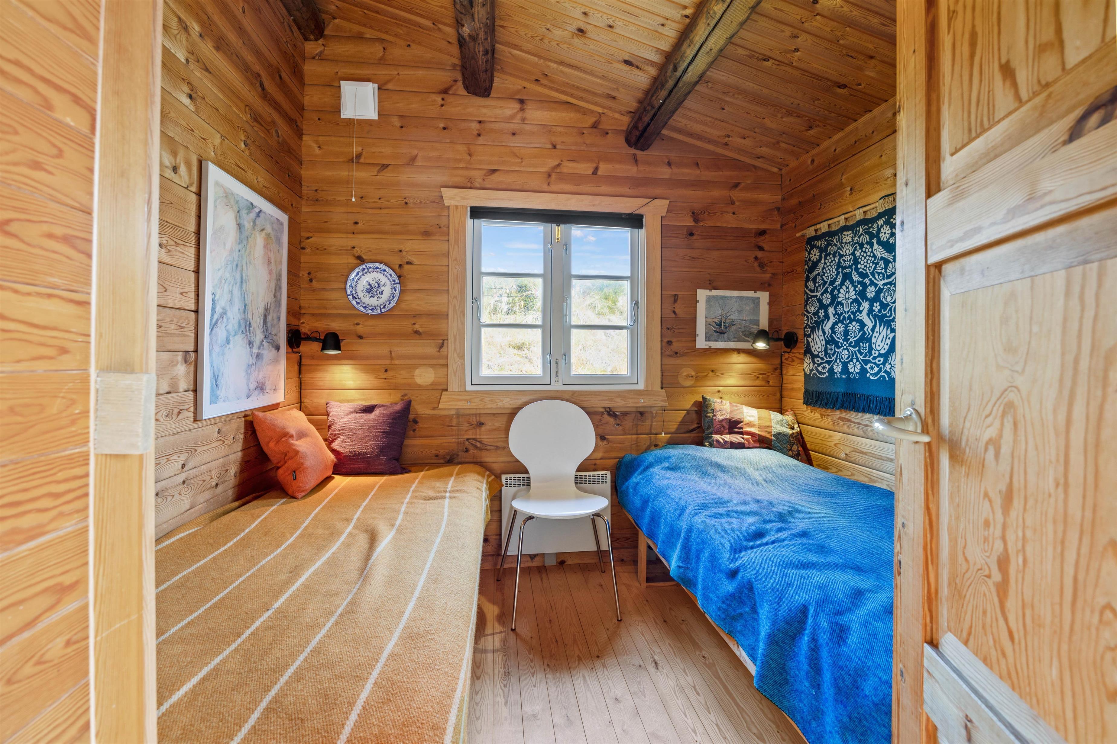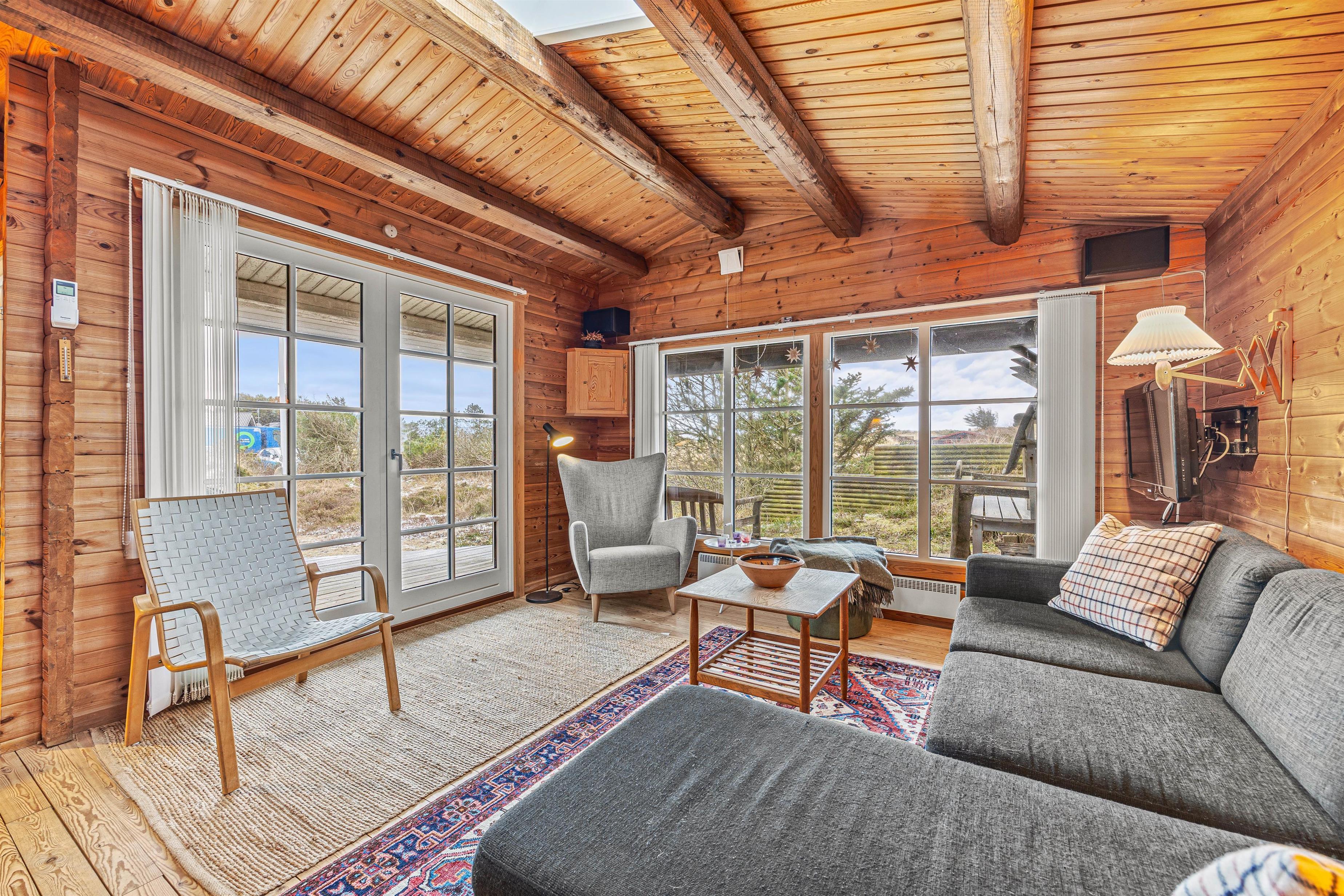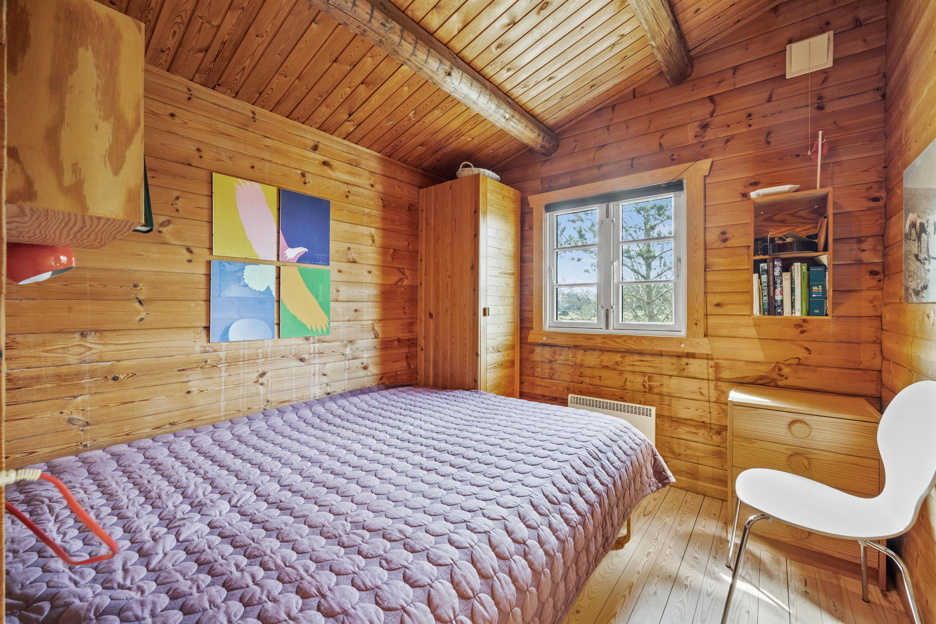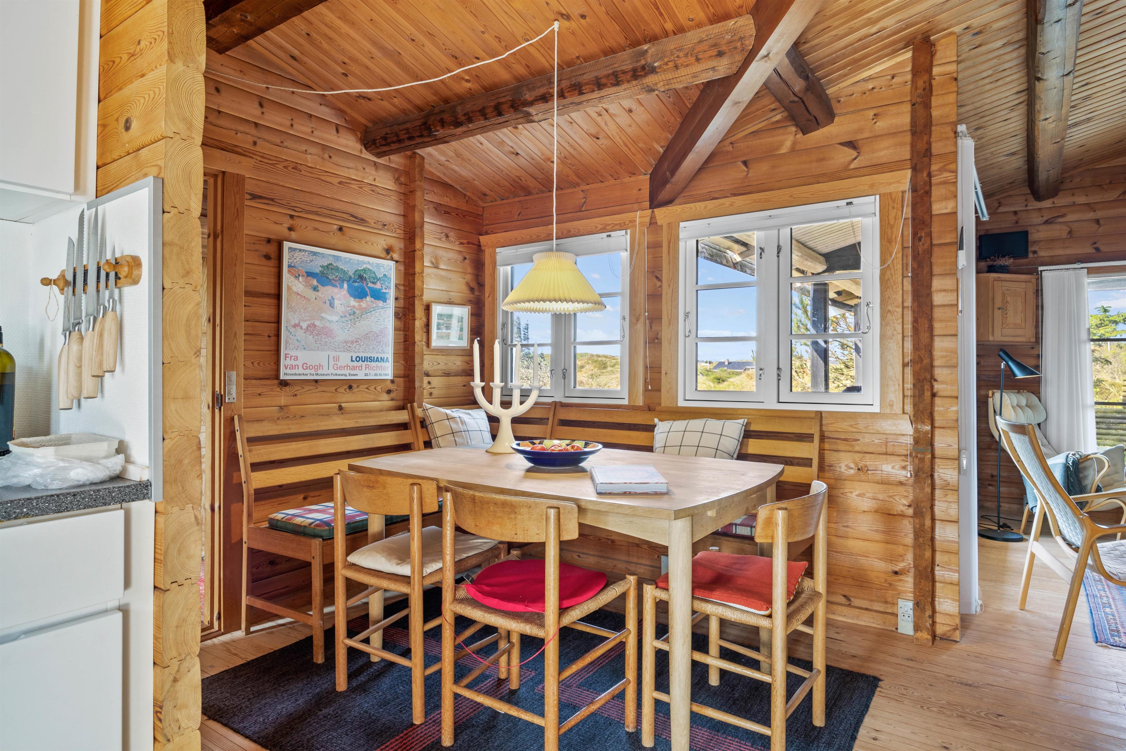 I det klassiske træbeklædte sommerhus kan der bo seks gæster fordelt på tre soveværelser, hvoraf det ene værelse er et ideelt børneværelse med køjesengen – det vil børnene helt sikkert se frem til. Sommerhusets samlingspunkt og hjerterum er det hyggelige køkken-opholdsrum, hvor der er højt til loftet og smukke spær i loftet. Gennem de store vinduer i stuen skinner det naturlige lys smukt ind, mens den bløde hjørnesofa venter på jer. Her kan I samles om et spil, læse den medbragte ferielæsning i den behagelige lænestol foran den knitrende brændeovn.