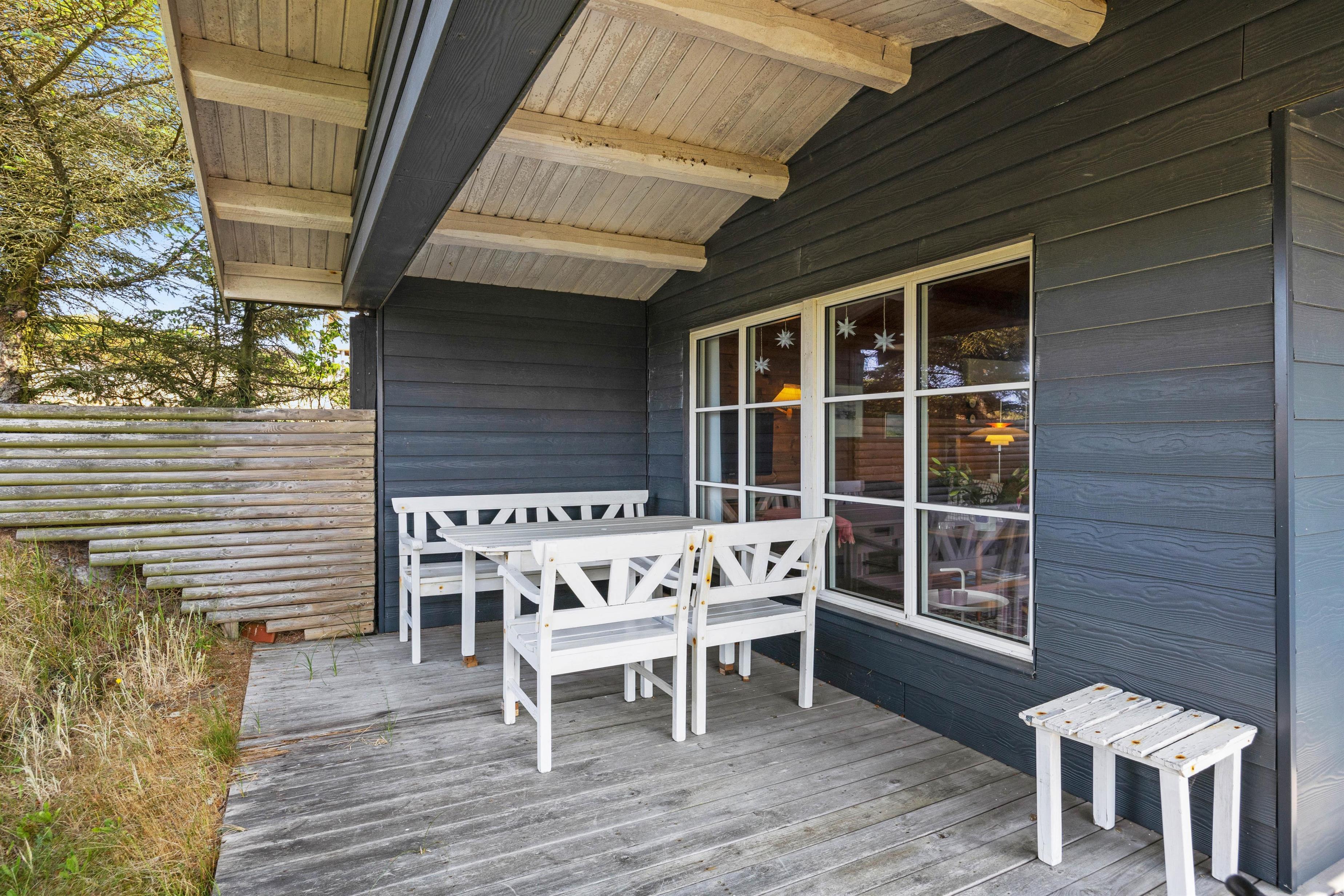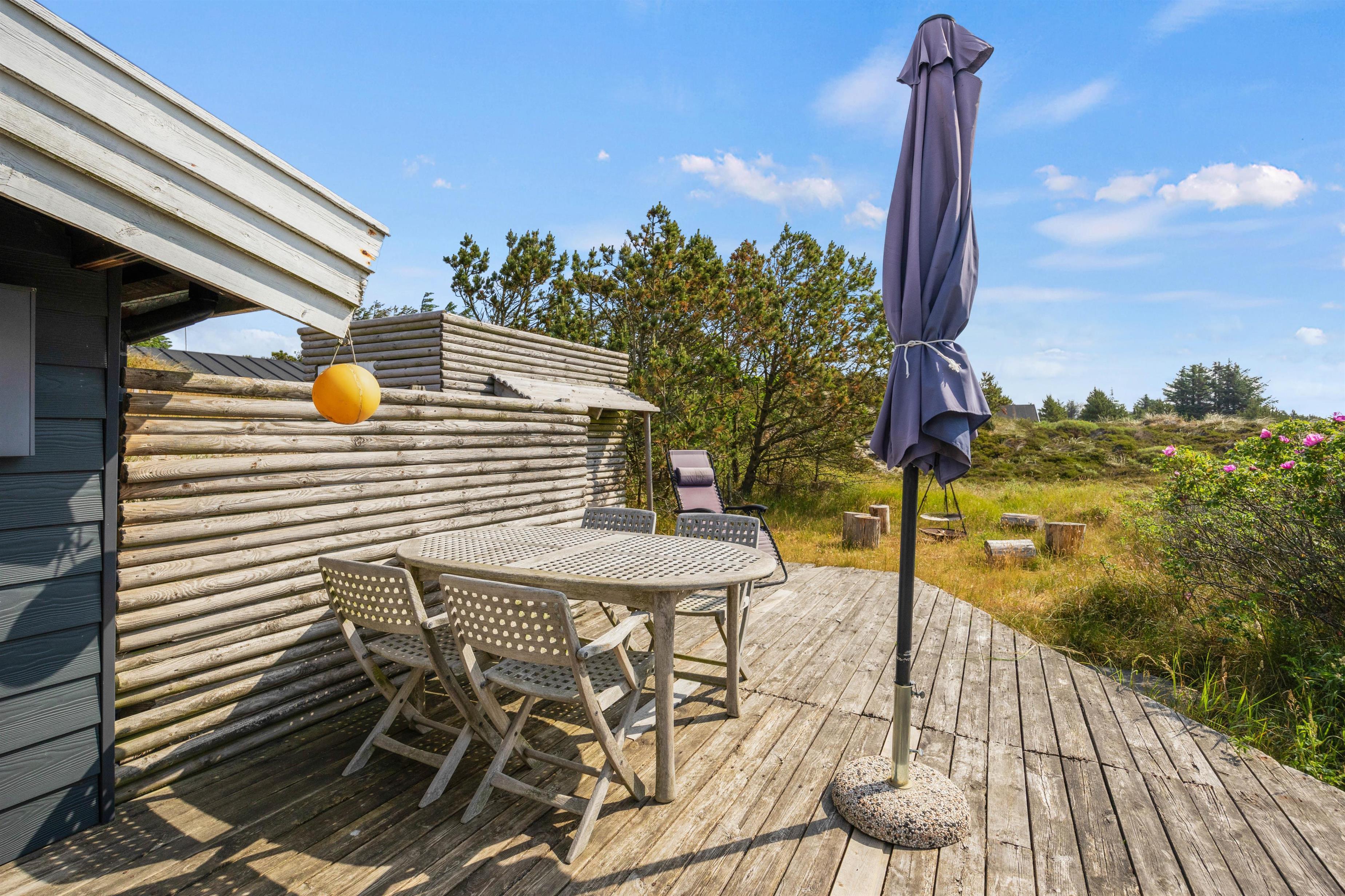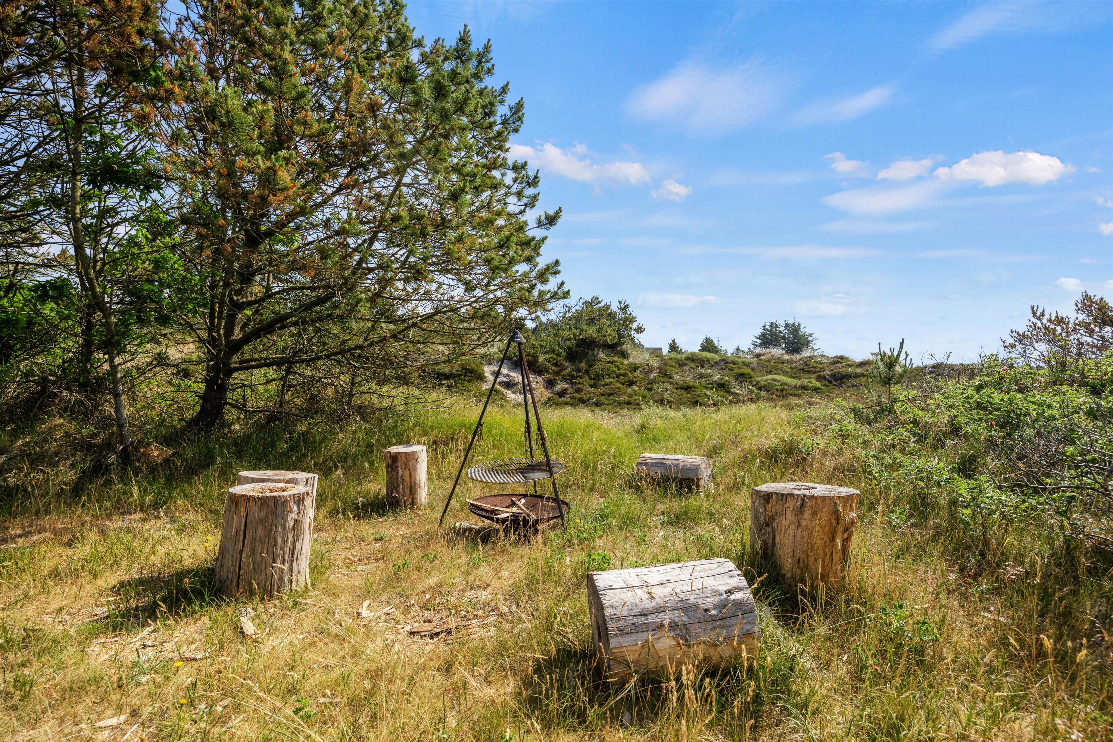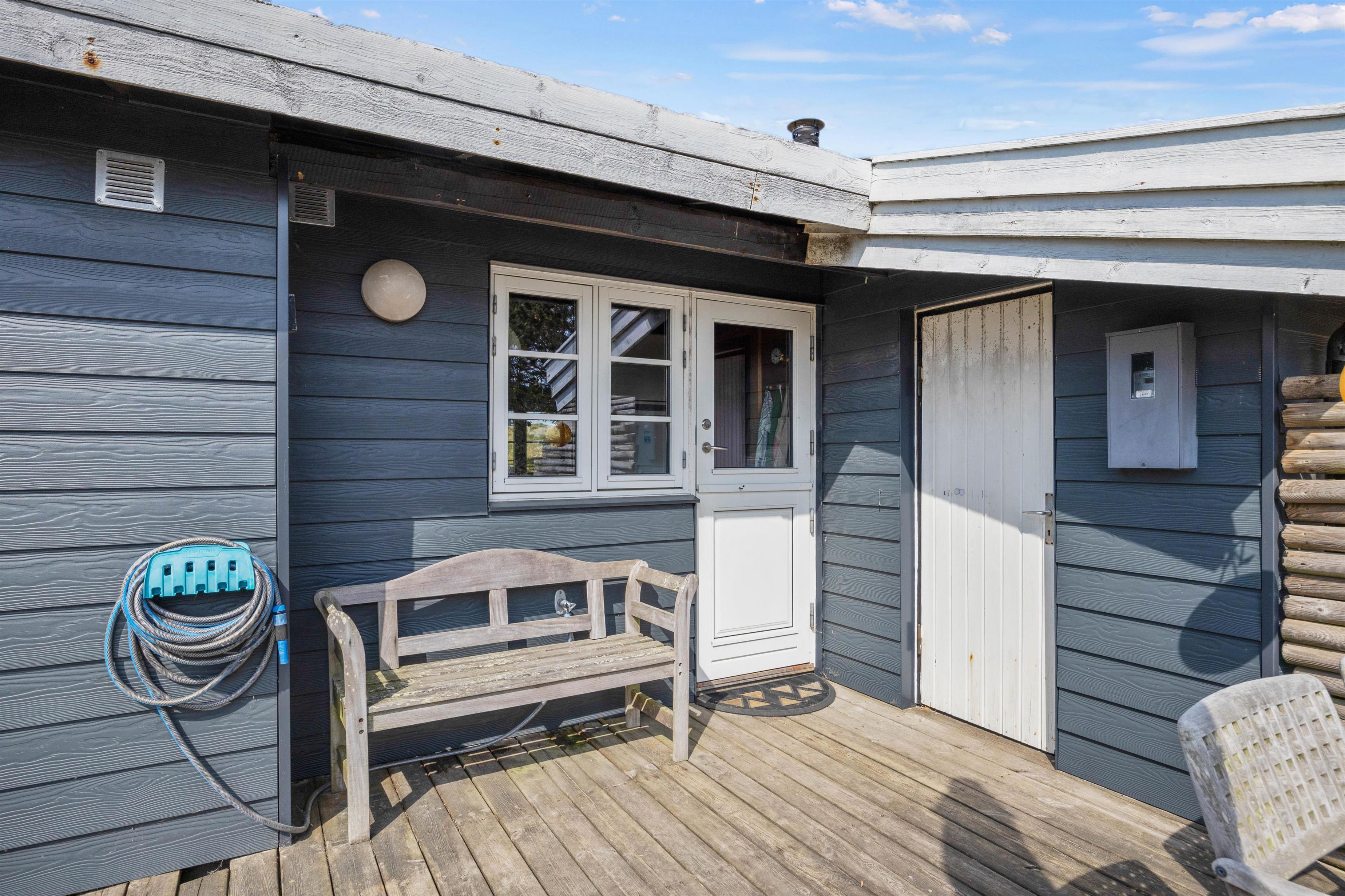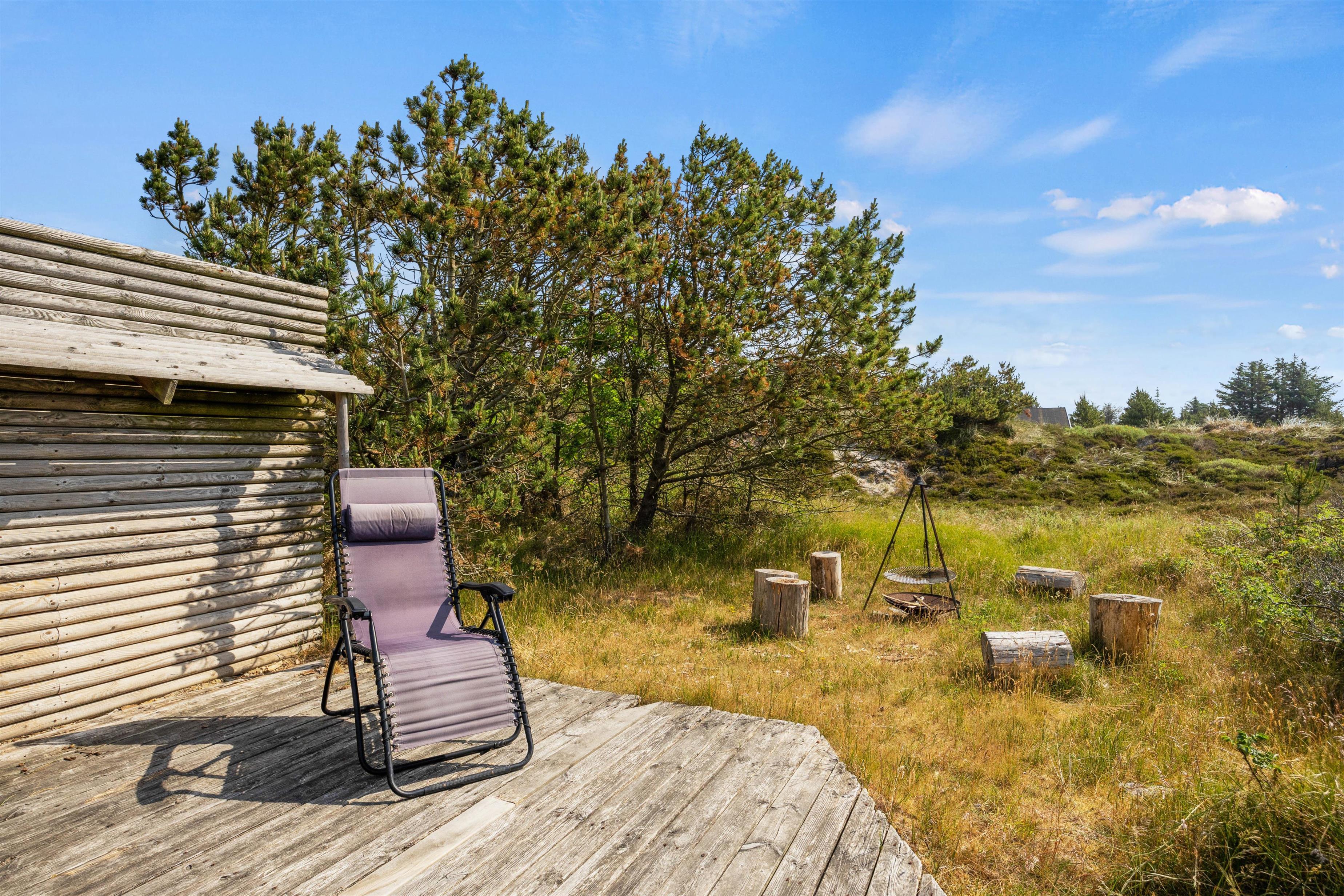 På de varme solskinsdage kan I rykke ud på den afskærmede træterrasse, hvor der er sørget for både havemøbler og liggestole, så hver eneste solstråle kan blive udnyttet til fulde. Selv på de lidt køligere sommerdage, kan I finde ly under den overdækkede del af terrassen og nyde aftensmaden fra grillen. Efterfølgende kan I tænde op i bålet og hygge jer med at bage snobrød eller måske riste skumfiduser over ilden?