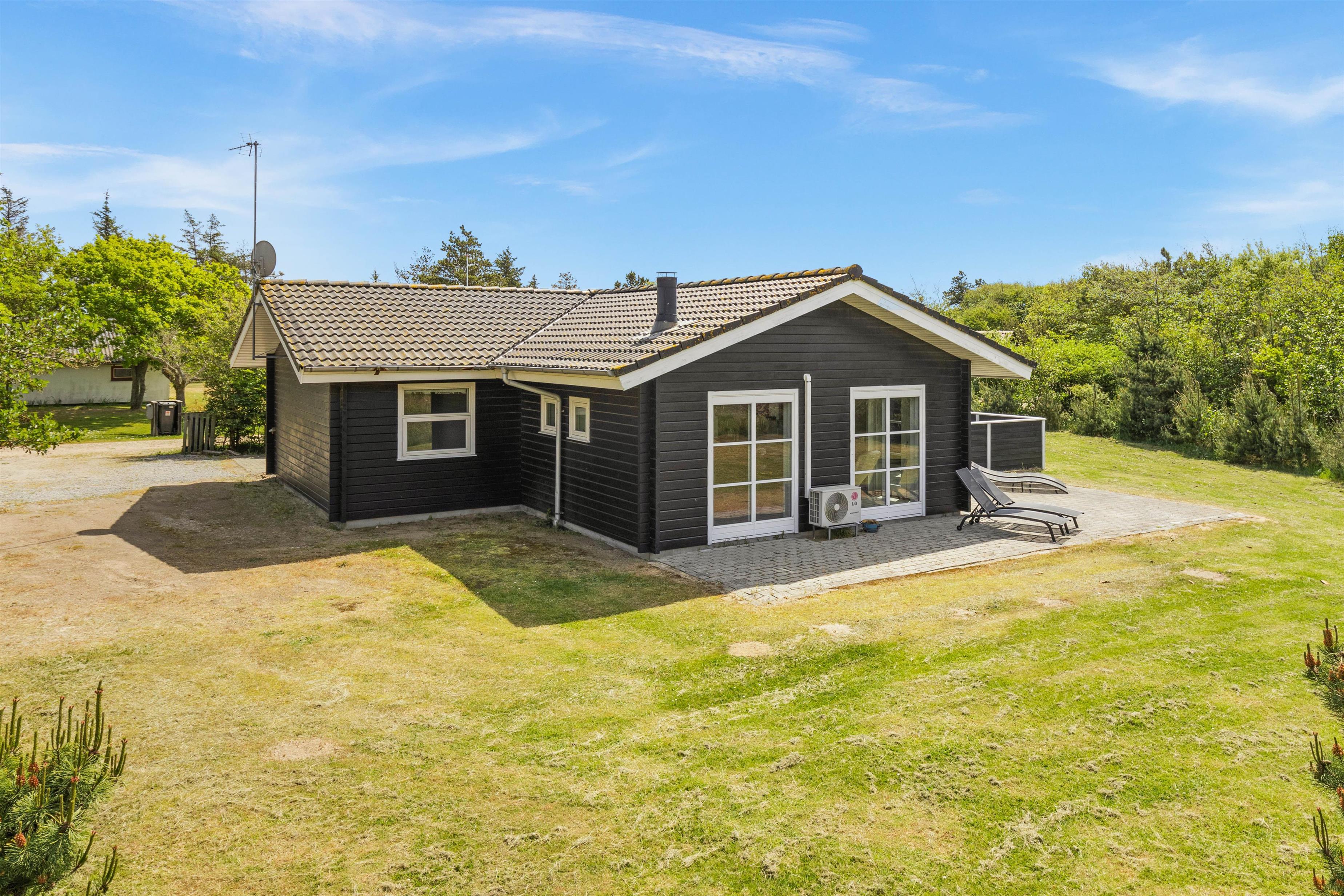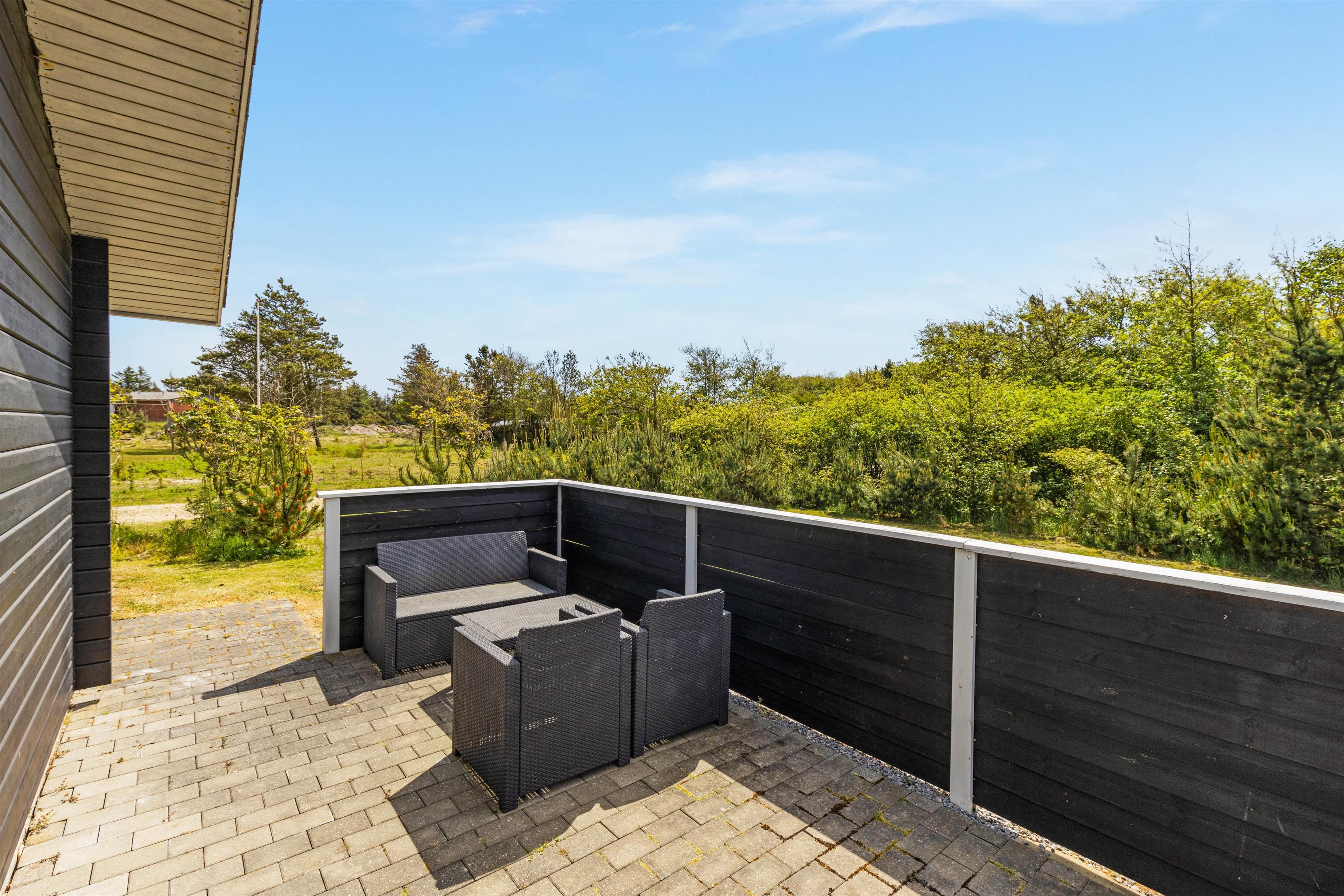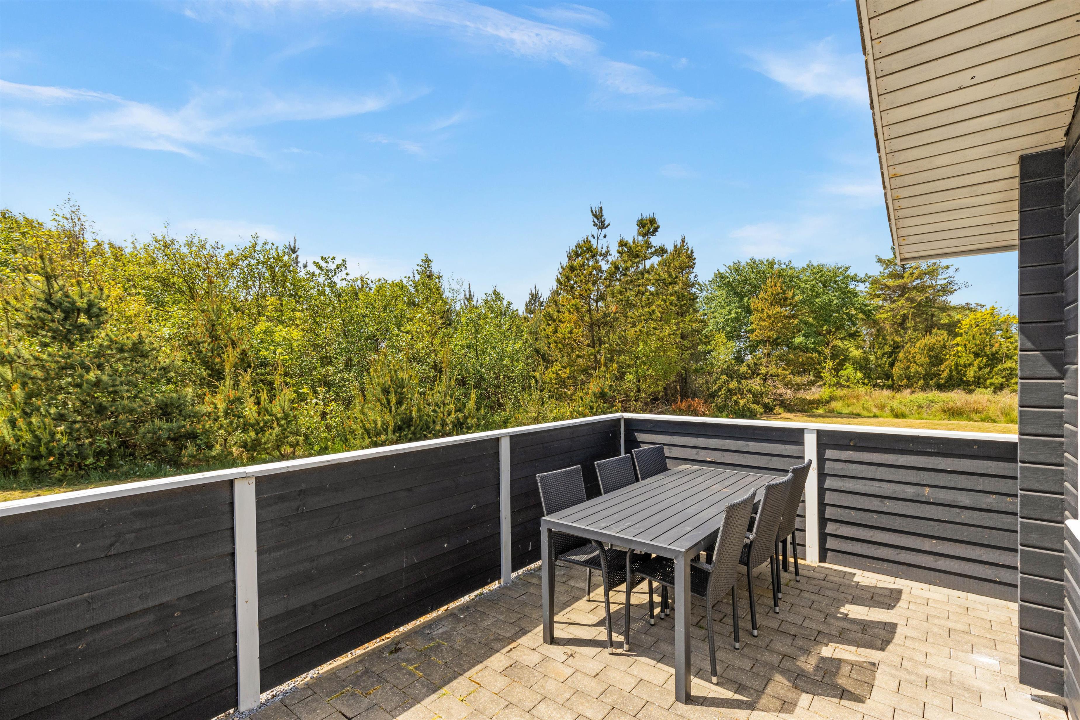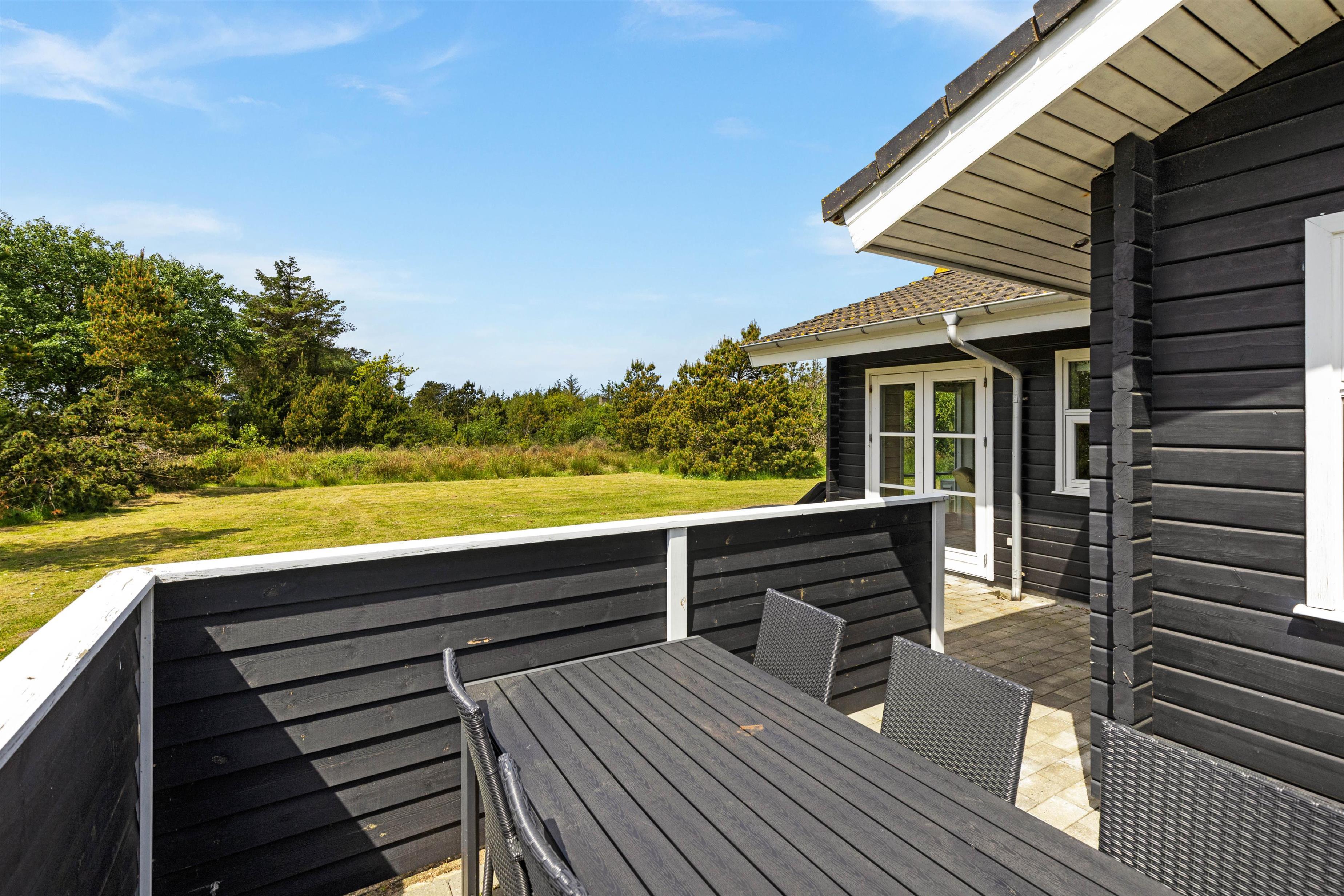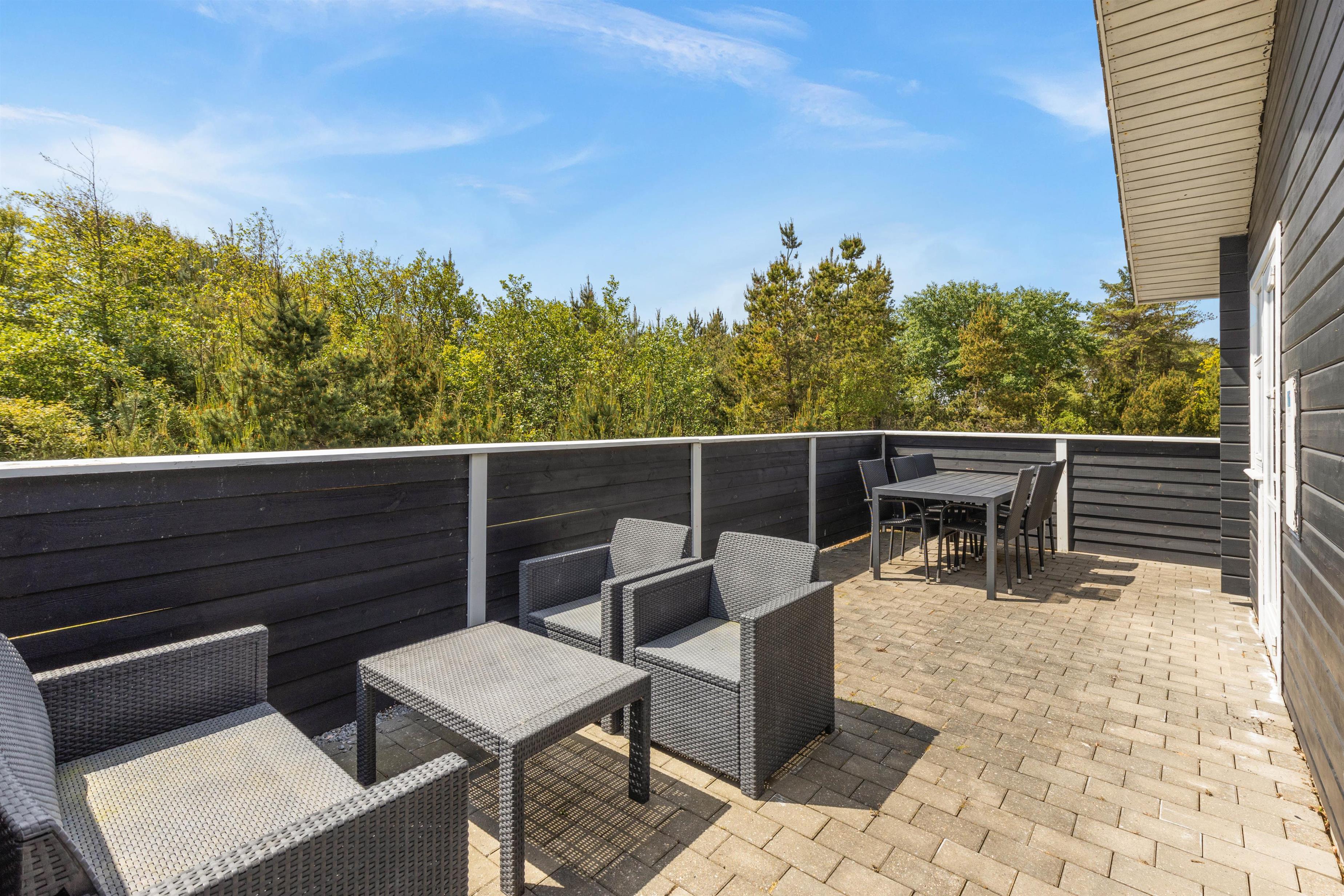 En skøn, stor fliseterrasse går næsten hele vejen rundt om feriehuset og sørger for, at der altid er en solrig og læfyldt krog at finde. Læn jer tilbage i havemøblerne og nyd den friske luft, mens børnene tumler med hundene på græsplænen.