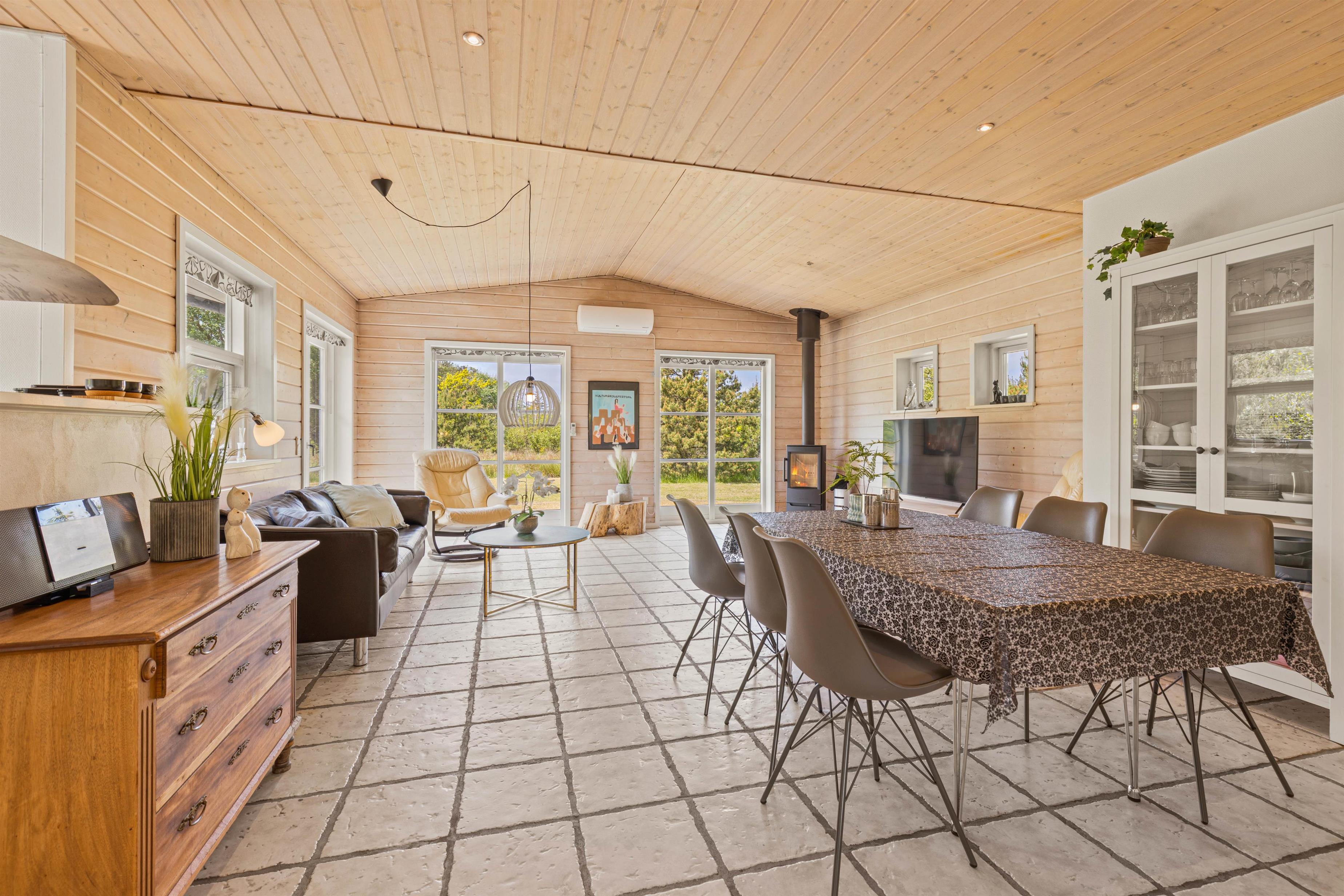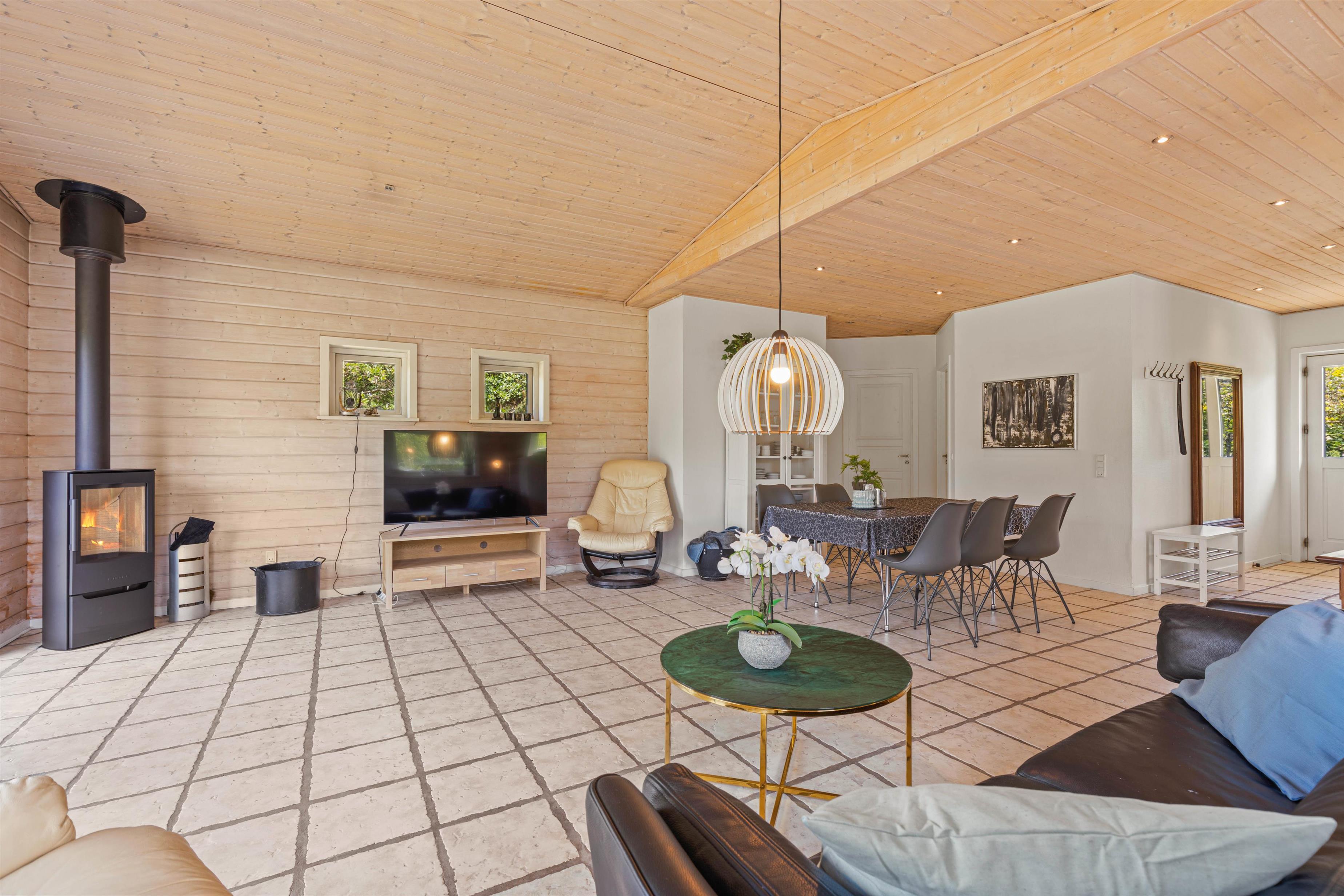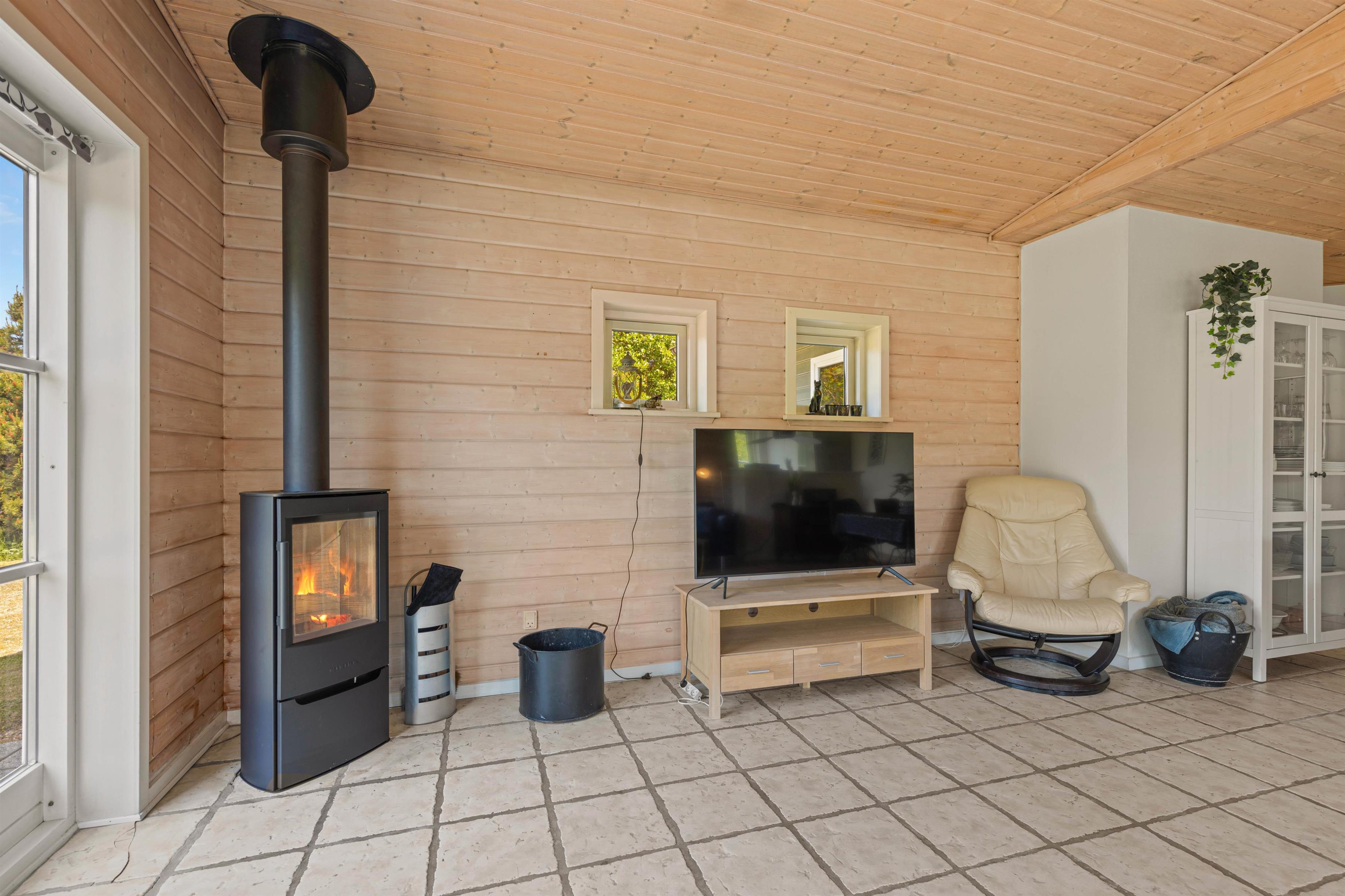 Både det åbne opholdsrum og badeværelset er udstyret med gulvvarme, så I ikke kommer til at fryse fødderne om morgenen, og en energivenlig varmepumpe holder omkostningerne og sikrer samtidig et behageligt rumklima hele året rundt. Når der skal skrues ekstra op for varmen og feriehyggen, kan I passende tænde op i brændeovnen, som altid er en garanti for god stemning.