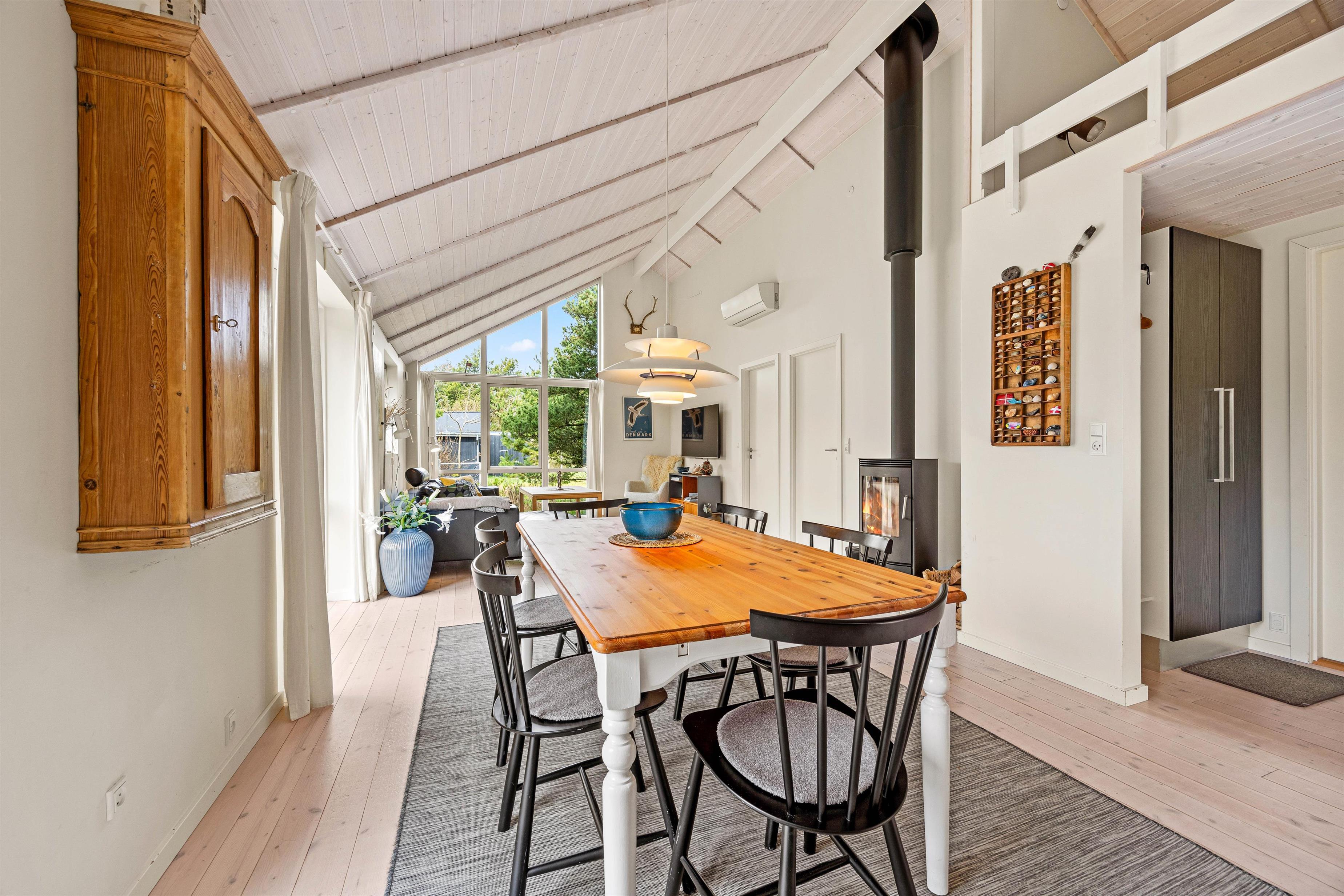 Alrummet, der forener køkken, spiseplads og stue, udgør sommerhusets hjerte, hvor I kan samles til hyggelige feriestunder med mad, spil og film. Imens sørger brændeovnen for god varme og for at fuldende feriestemningen. Desuden har I en energivenlig varmepumpe, der sørger for et godt indeklima.