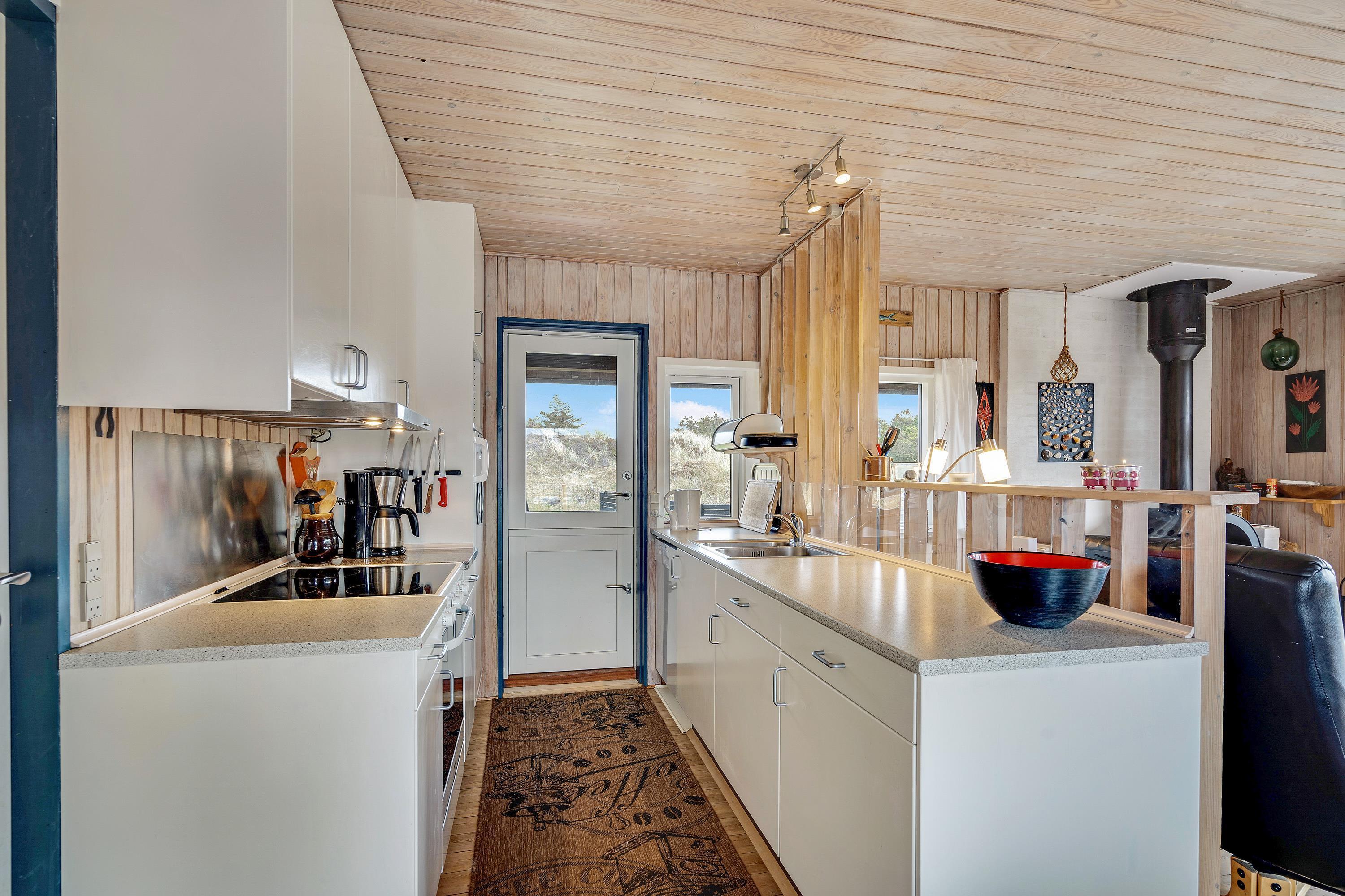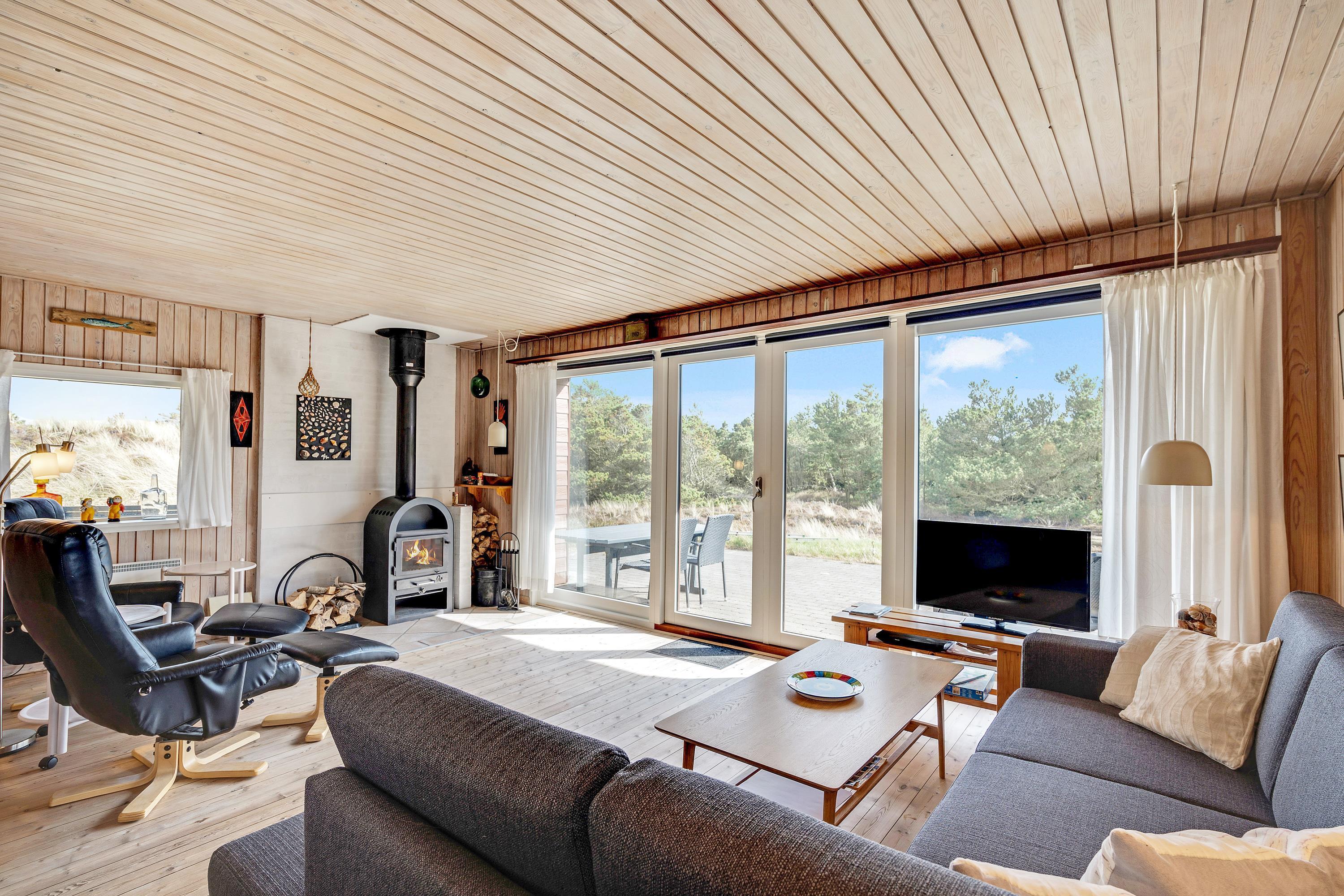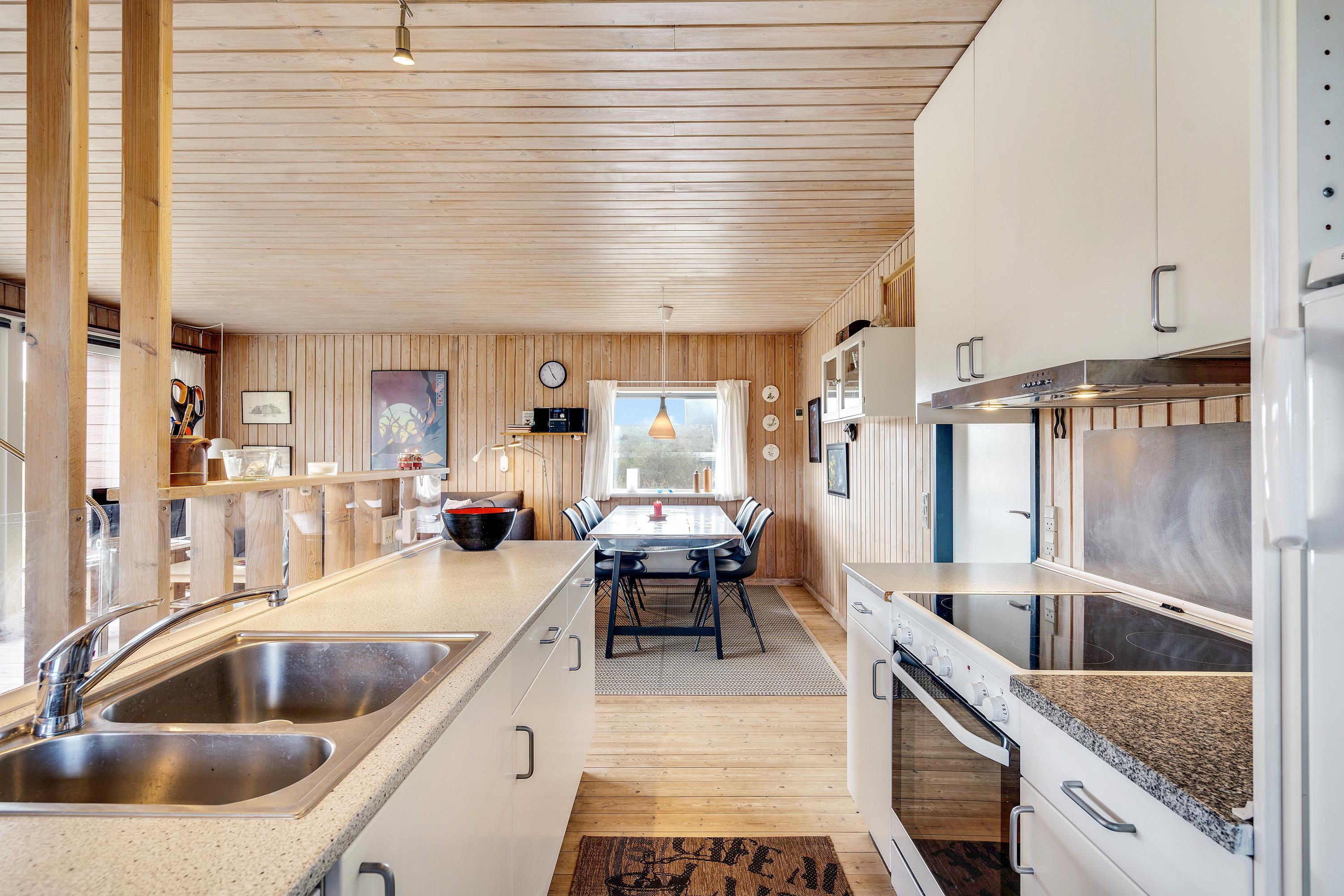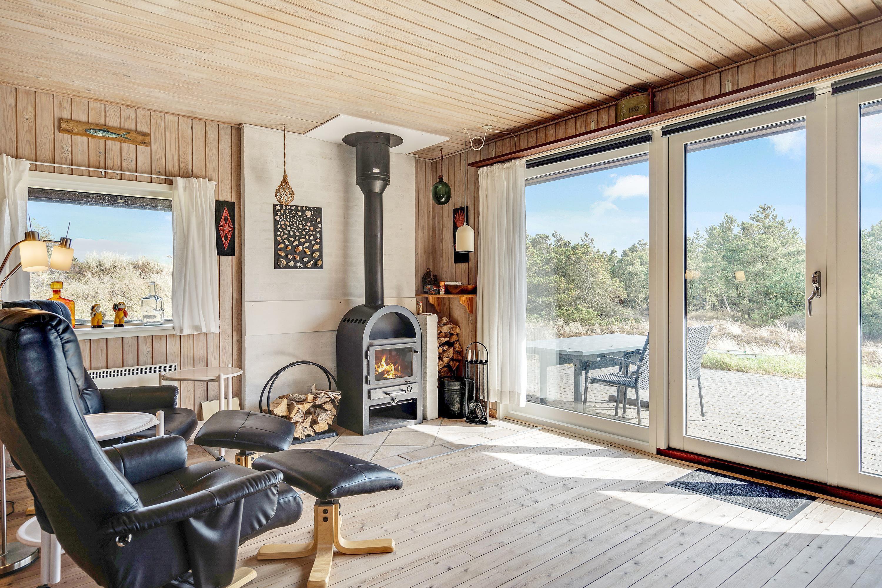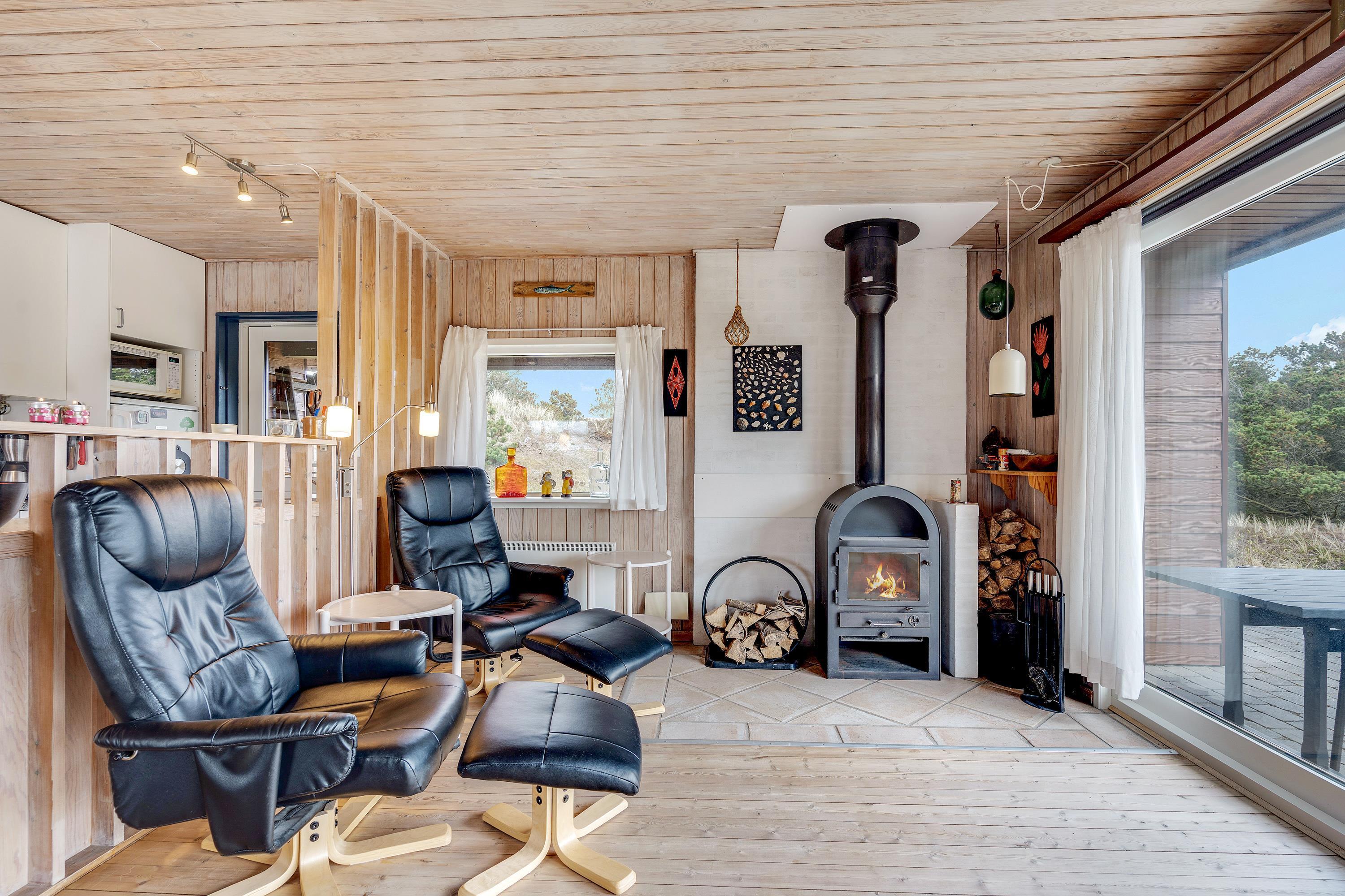 I den kombinerede stue-, spise- og køkkenafdeling er der lagt op til ægte hygge, og her er masser af kroge, hvor der kan læses bøger og drikkes friskbrygget kaffe på de kolde feriedage. Der kan også tændes op i brændeovnen, hvis der er brug for lidt ekstra varme og god stemning.