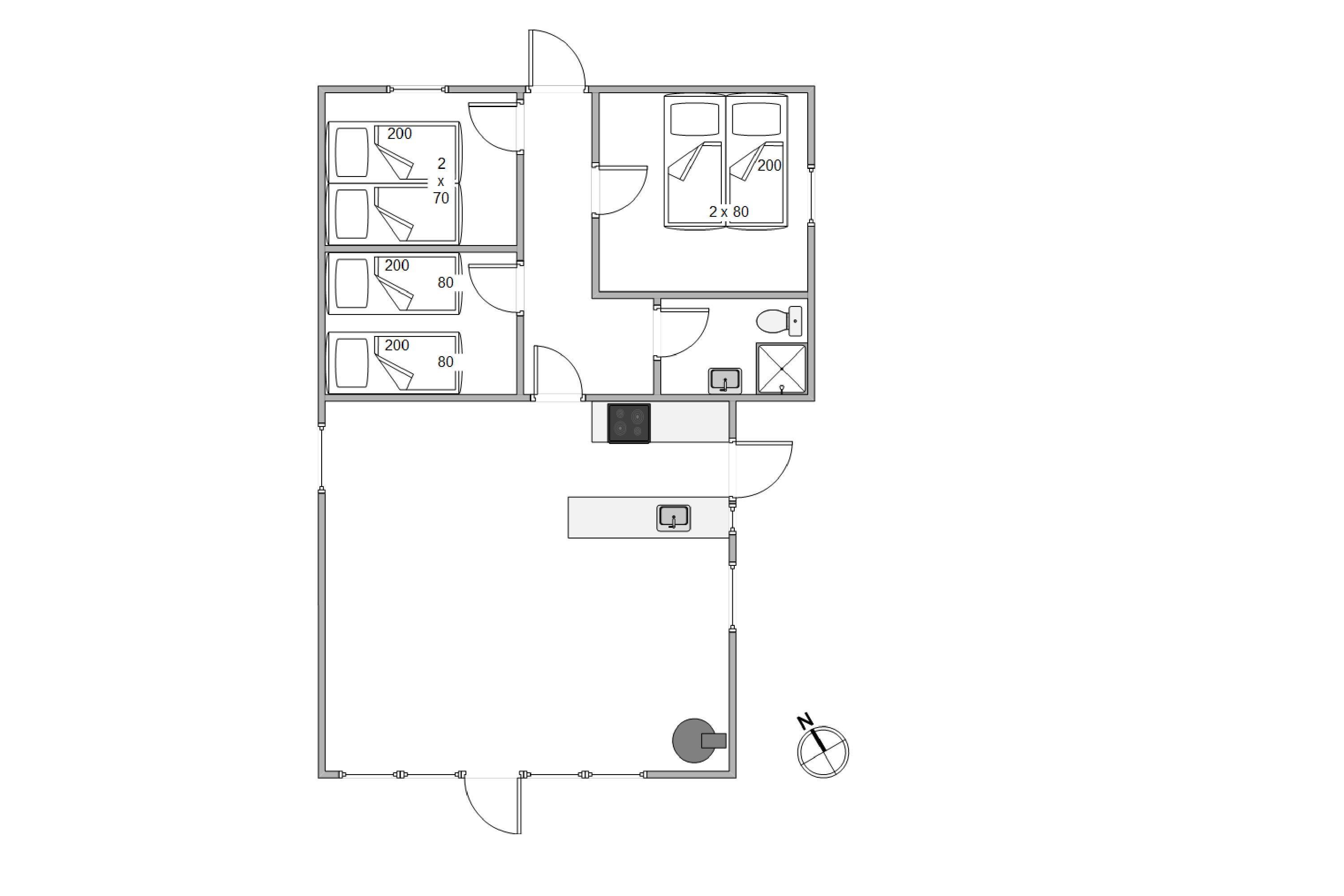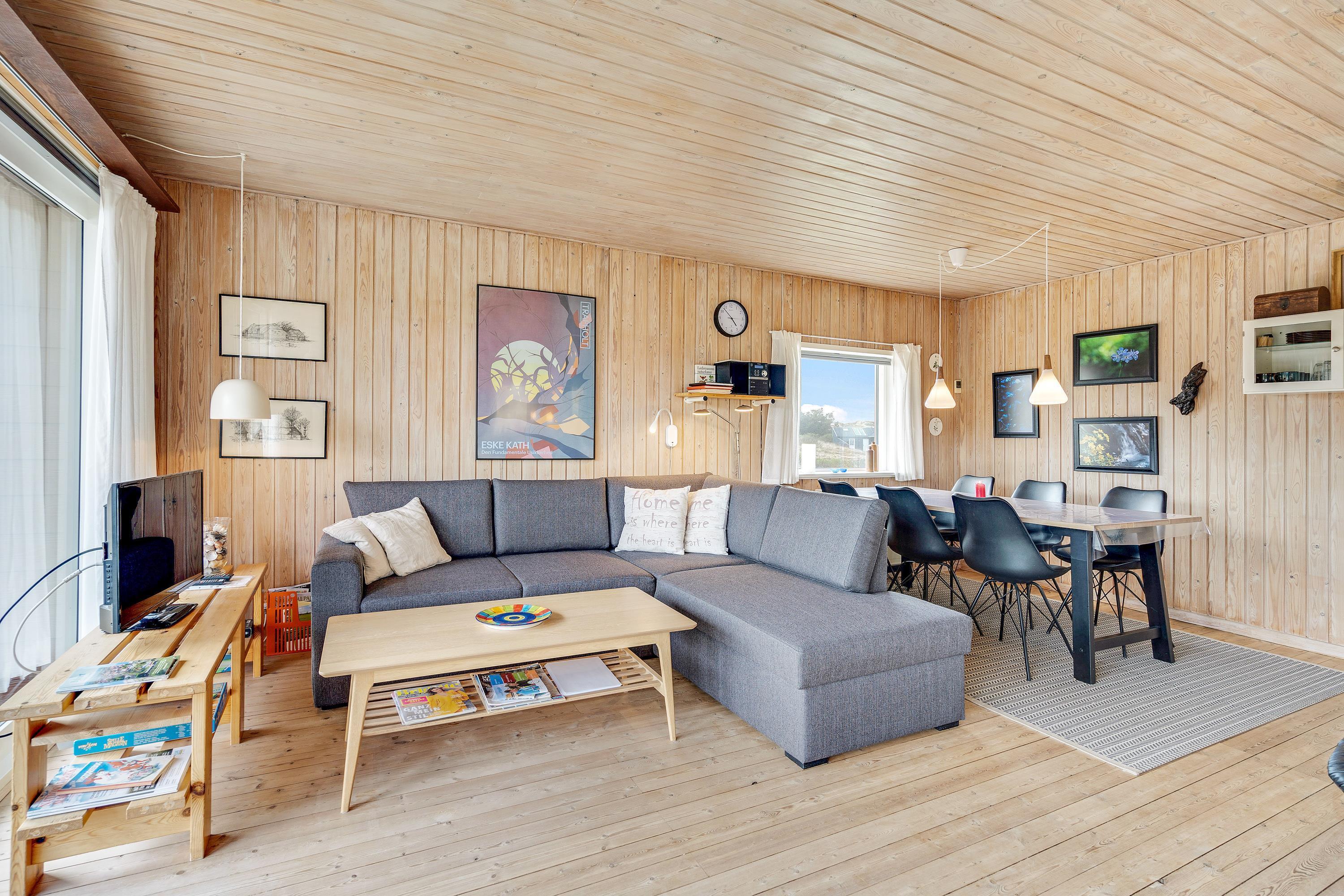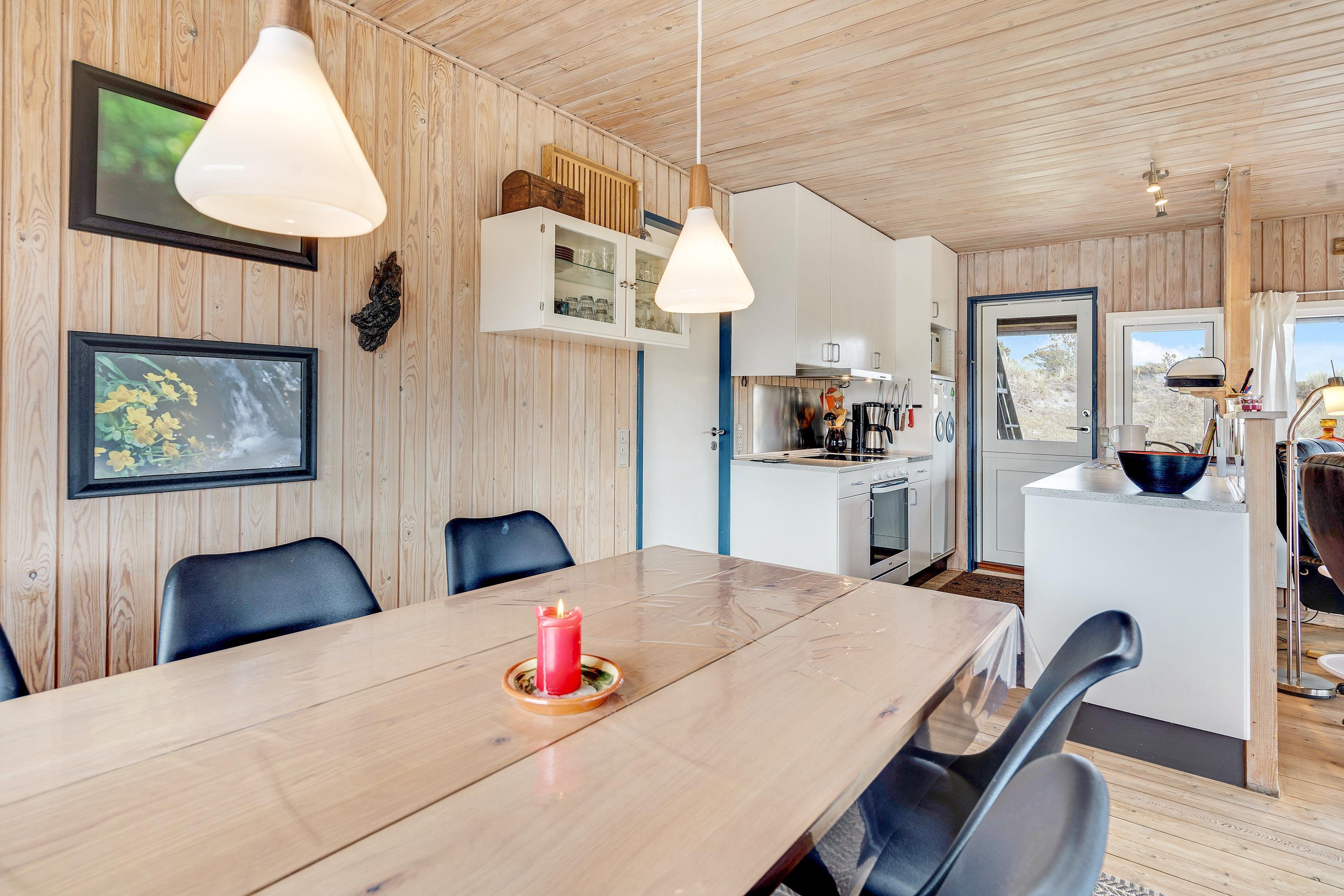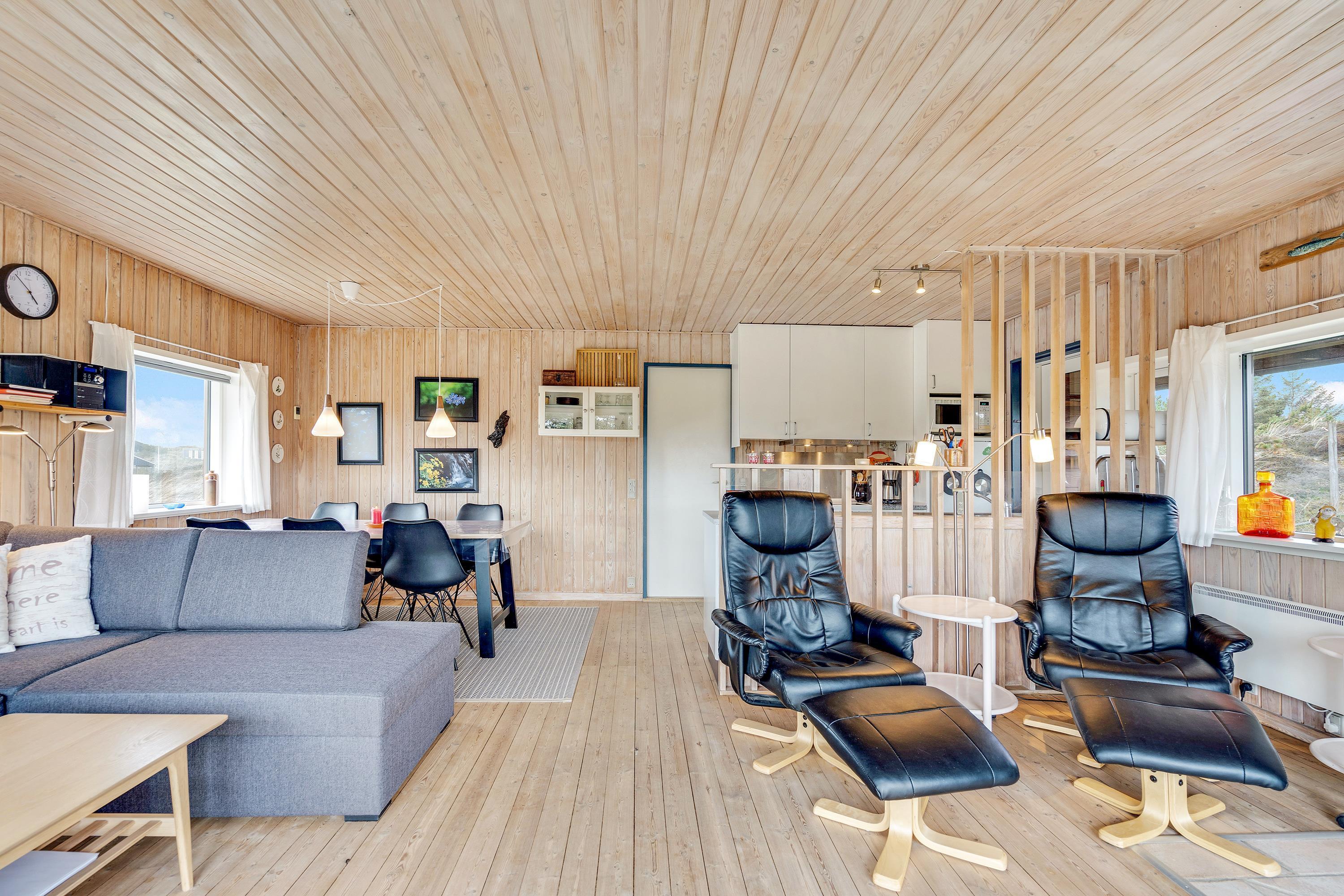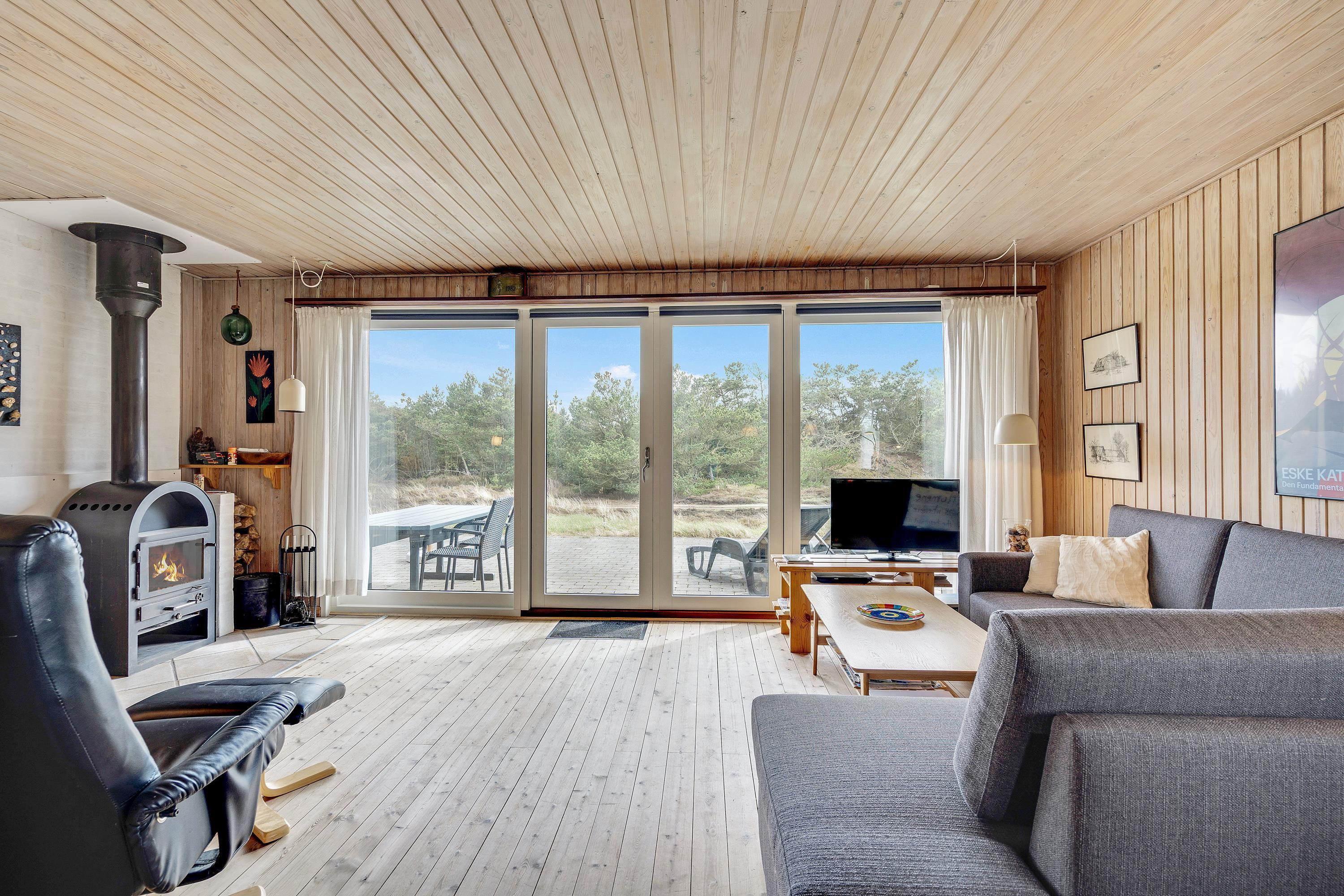 I den kombinerede stue-, spise- og køkkenafdeling er der lagt op til ægte hygge, og her er masser af kroge, hvor der kan læses bøger og drikkes friskbrygget kaffe på de kolde feriedage. Der kan også tændes op i brændeovnen, hvis der er brug for lidt ekstra varme og god stemning.