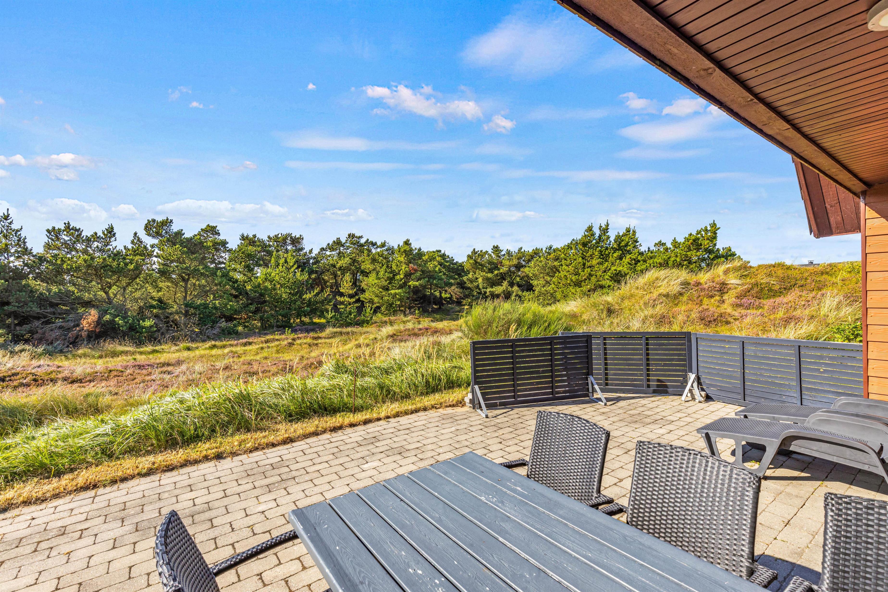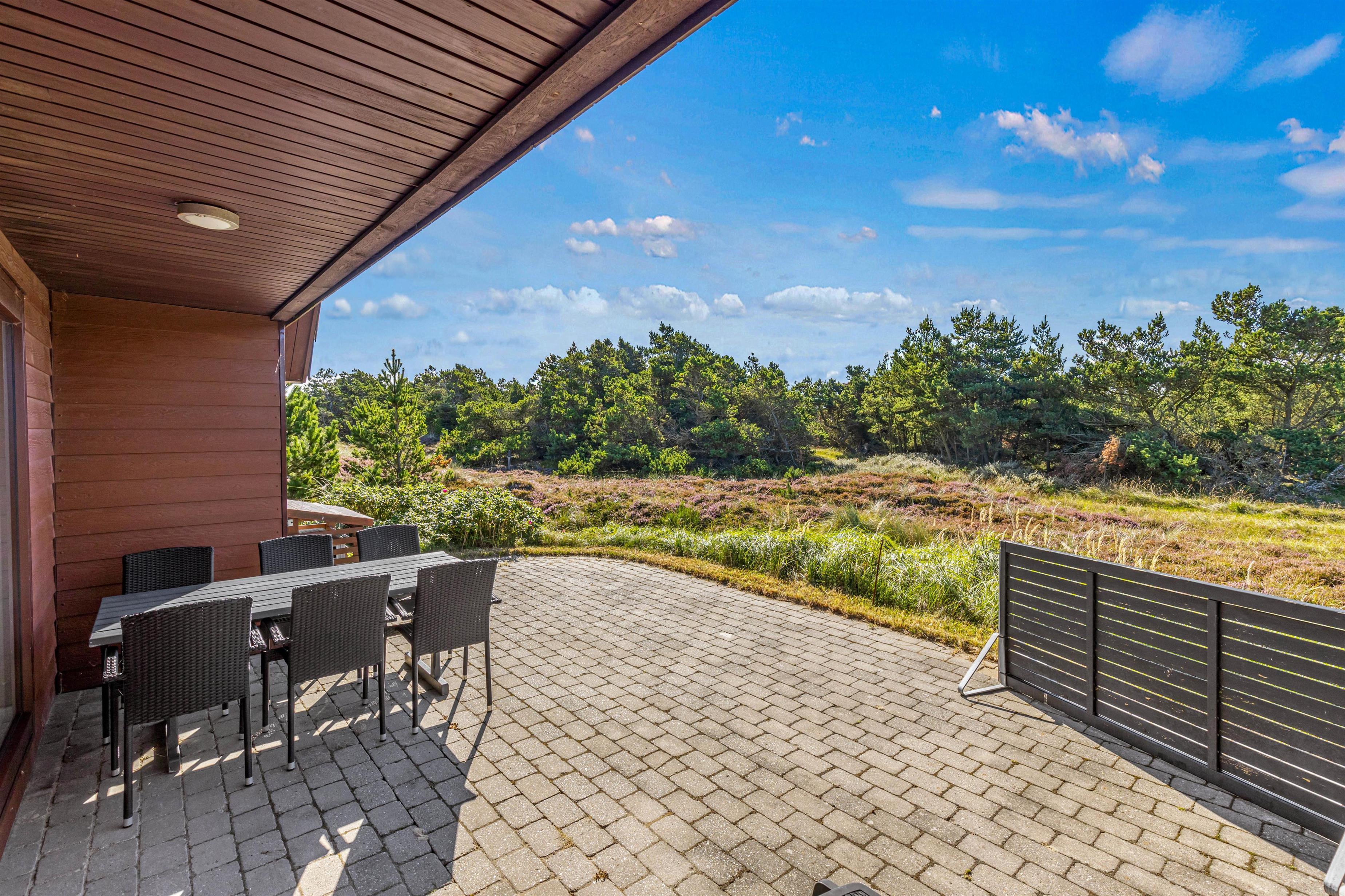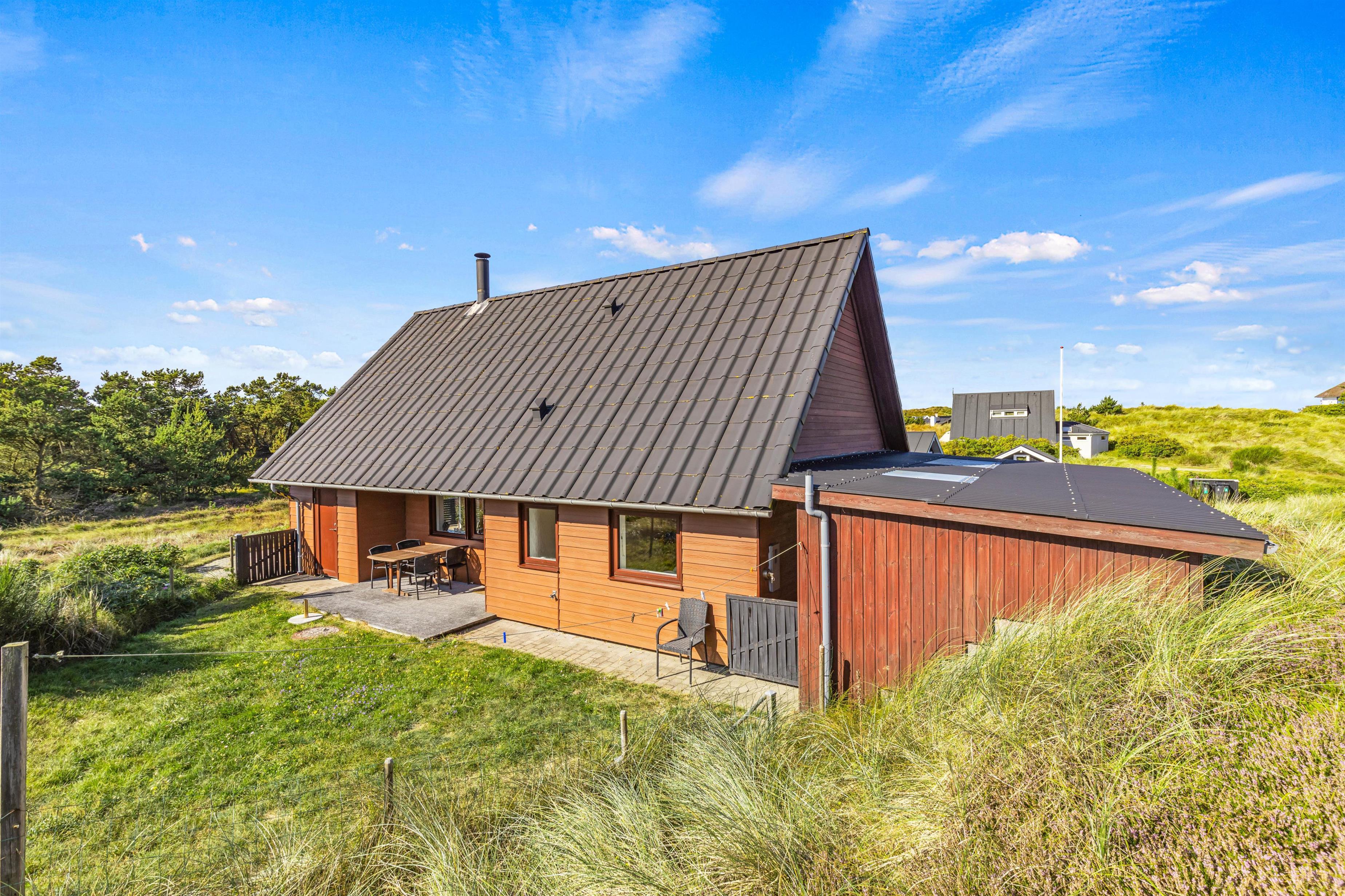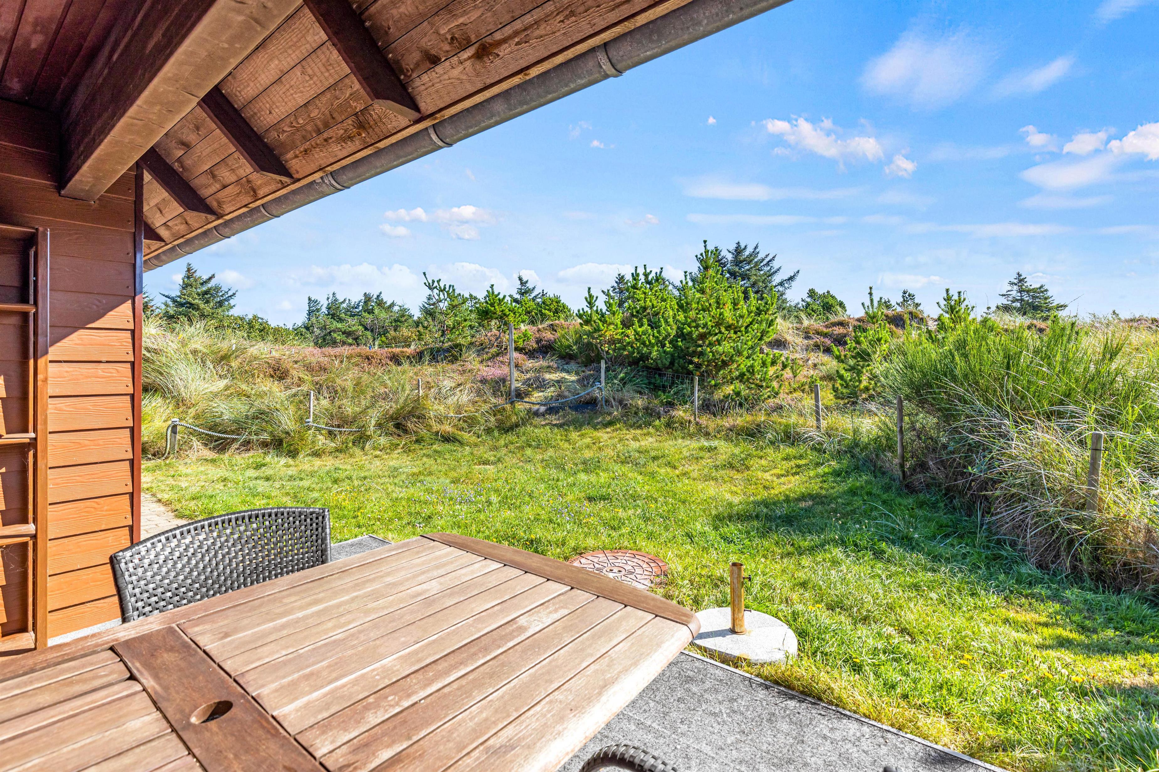 Det klassiske feriehus ligger midt i det klitbeklædte landskab, og på den åbne terrasse har I smuk natur til alle sider. Læn jer tilbage i liggestolene med noget koldt at drikke eller spis en lækker frokost i solen - i det gode vejr er udendørsmulighederne uendeligt mange!