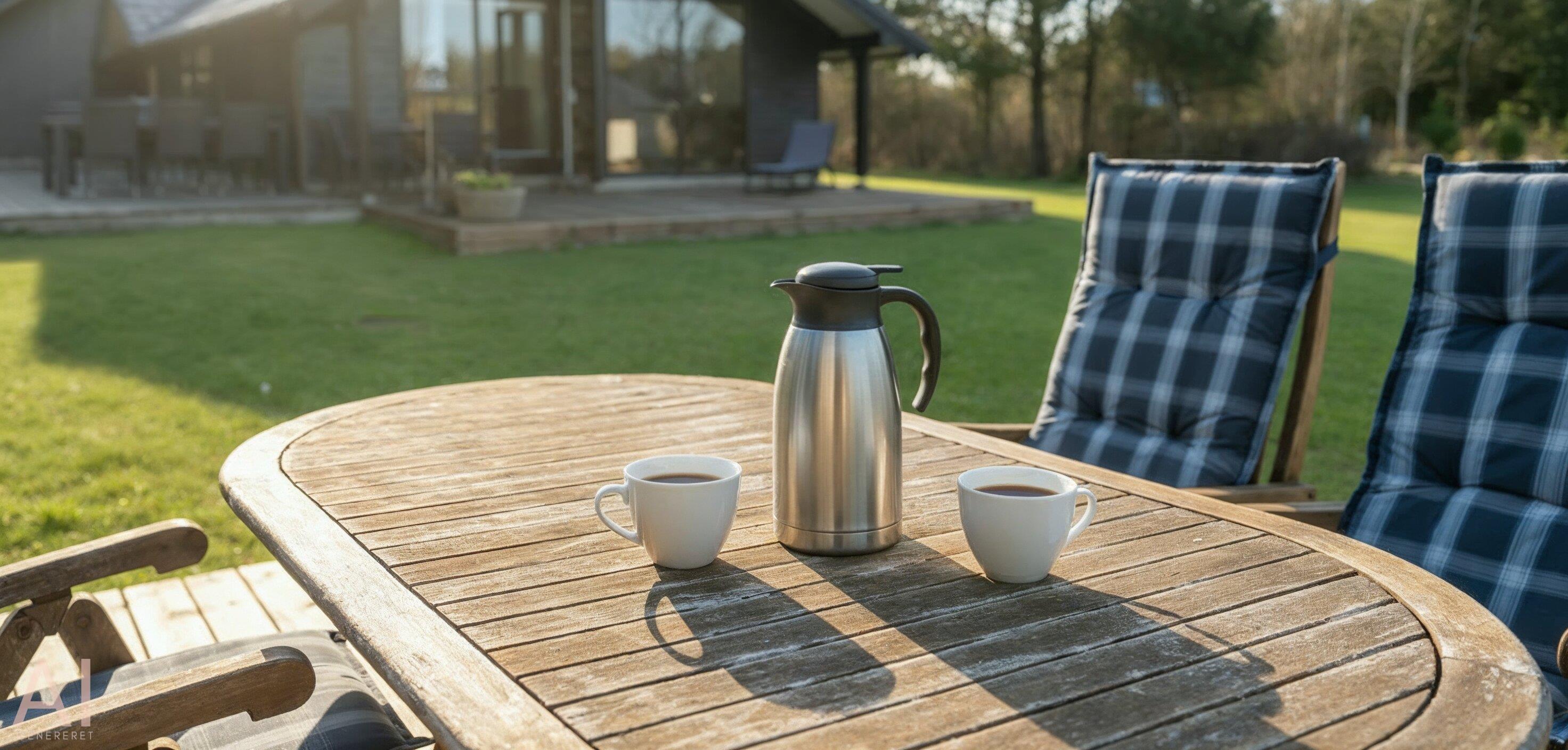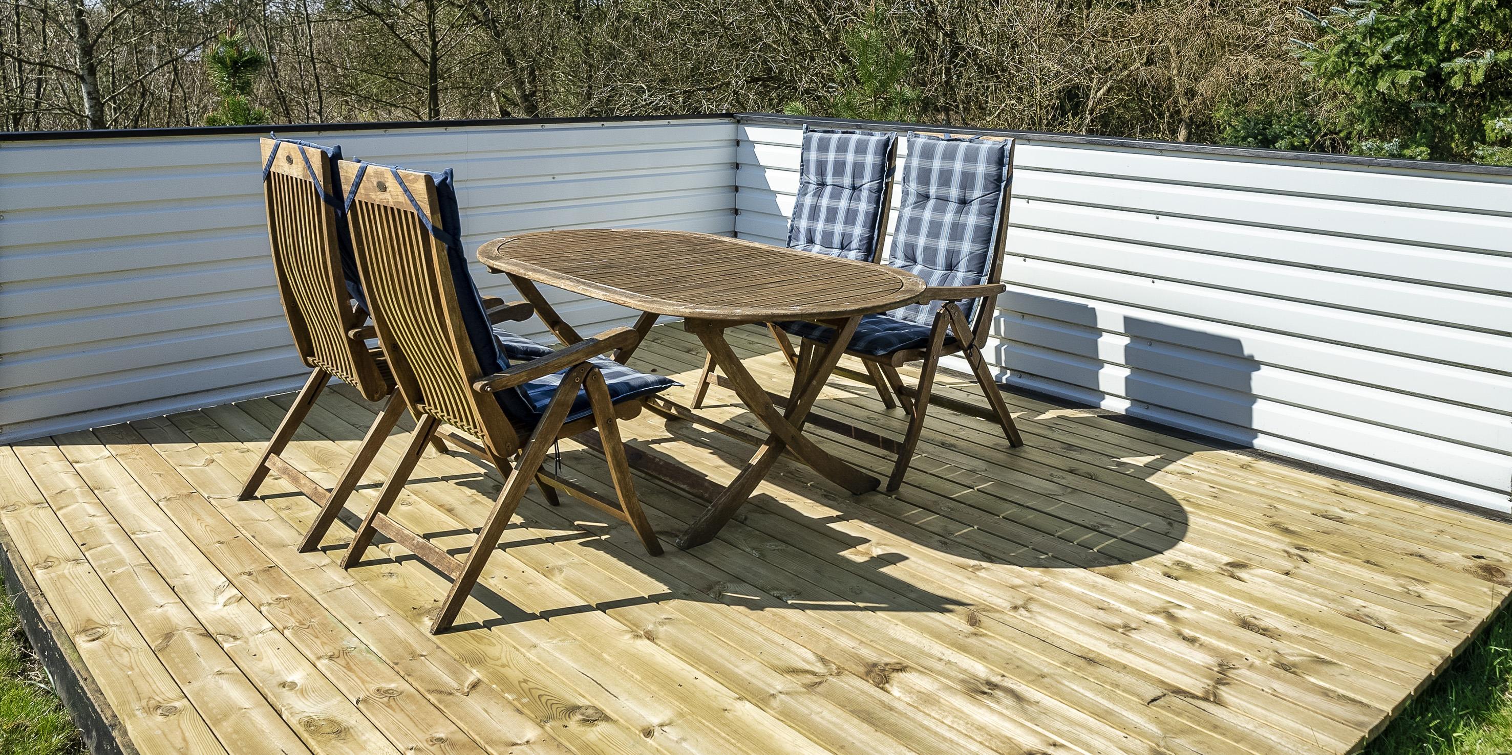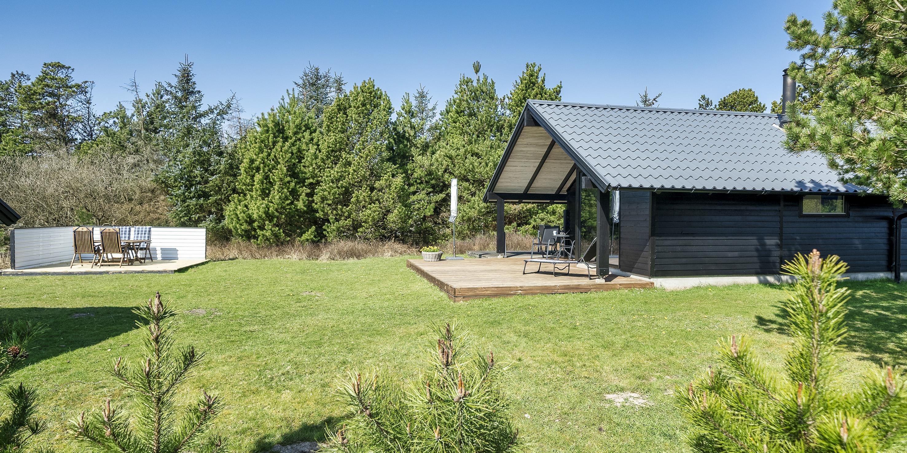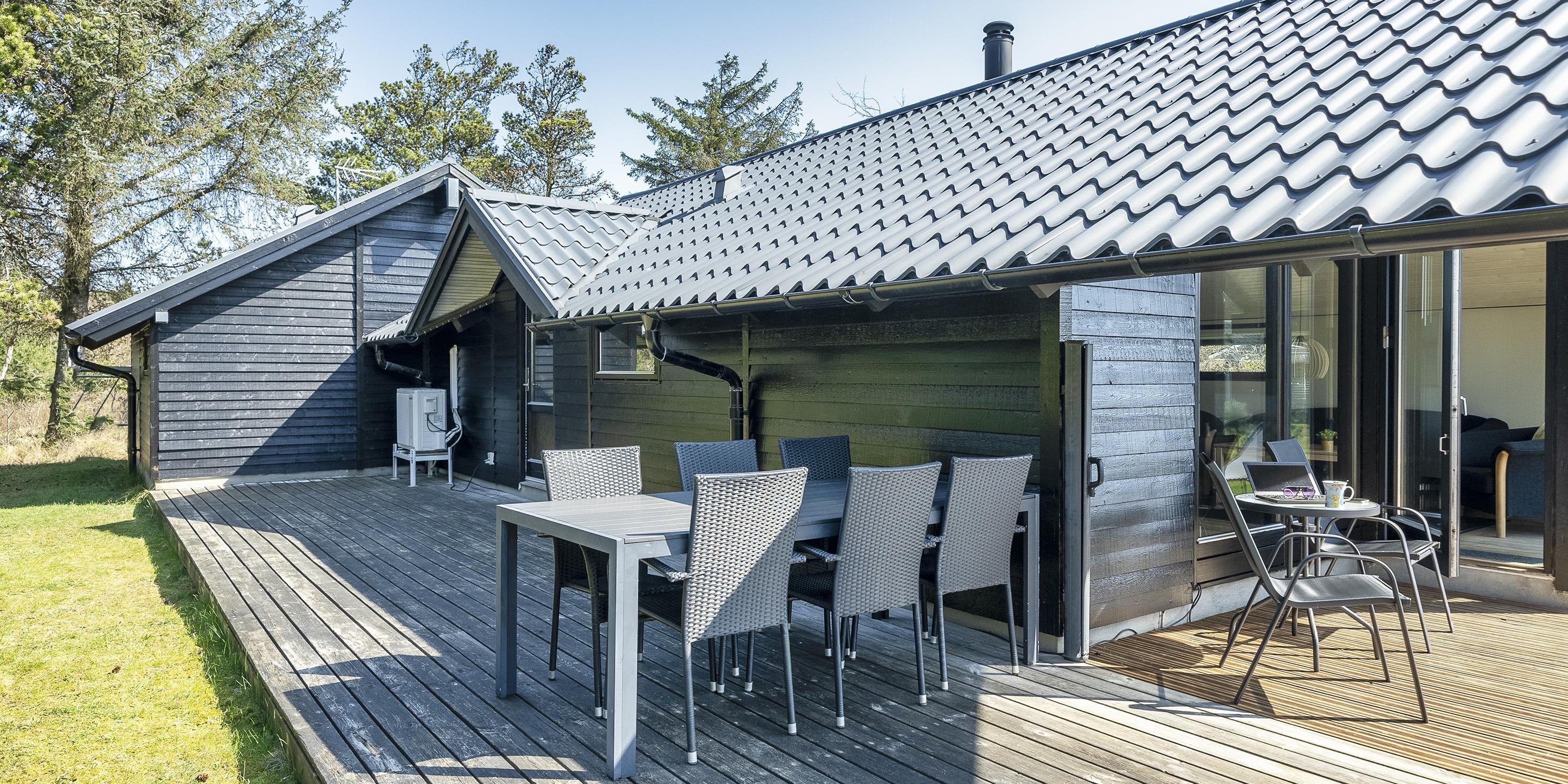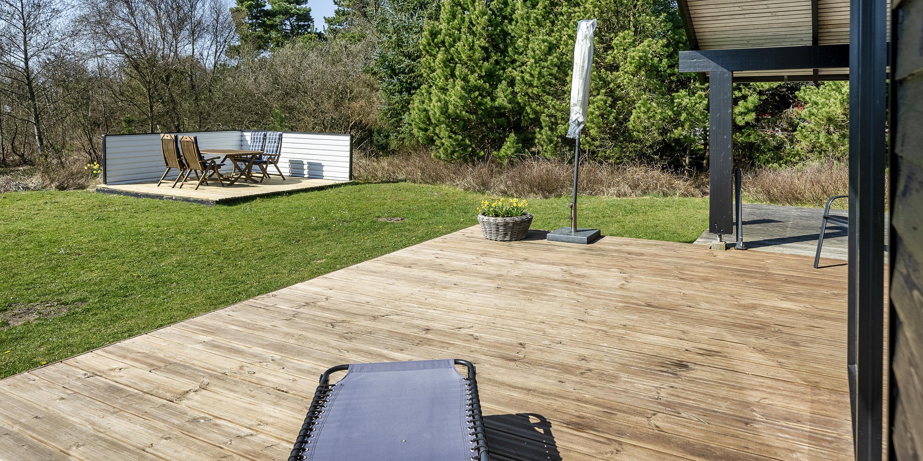 Huset er omgivet af flere træterrasser, hvor der året rundt er mulighed for at finde en læ krog, hvorfra naturen og solen kan nydes i fulde drag. En af træterrasserne er overdækket.