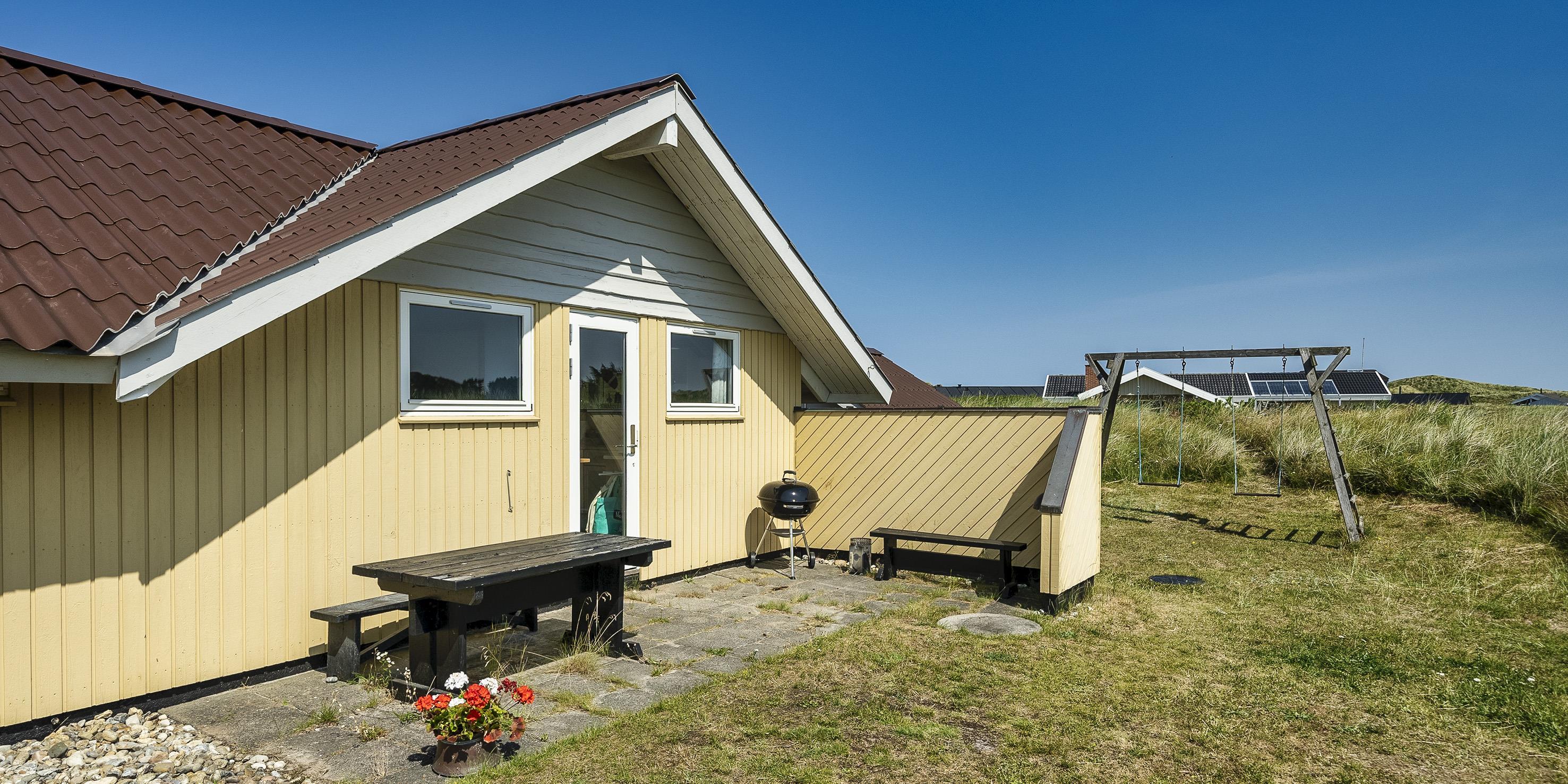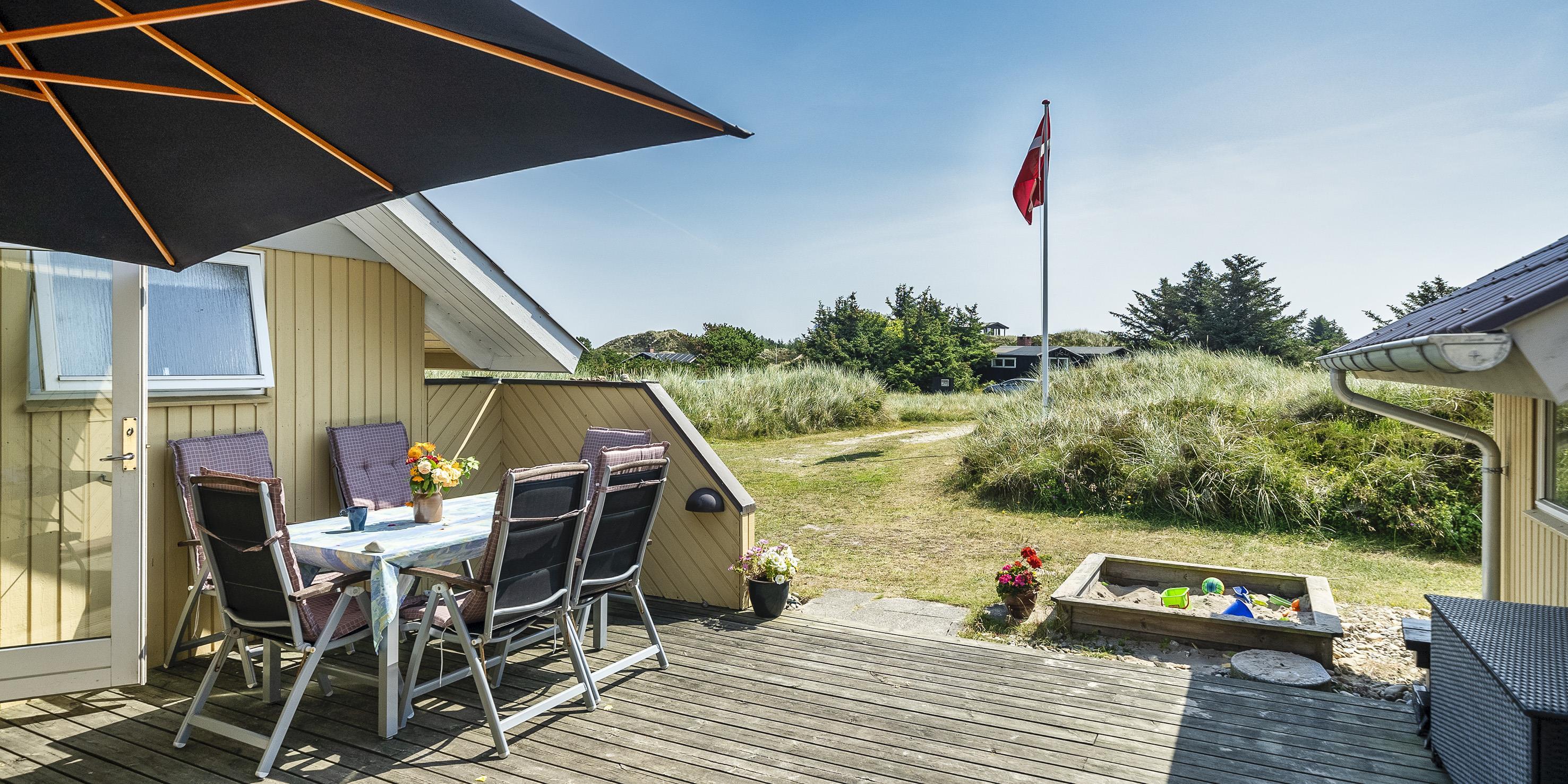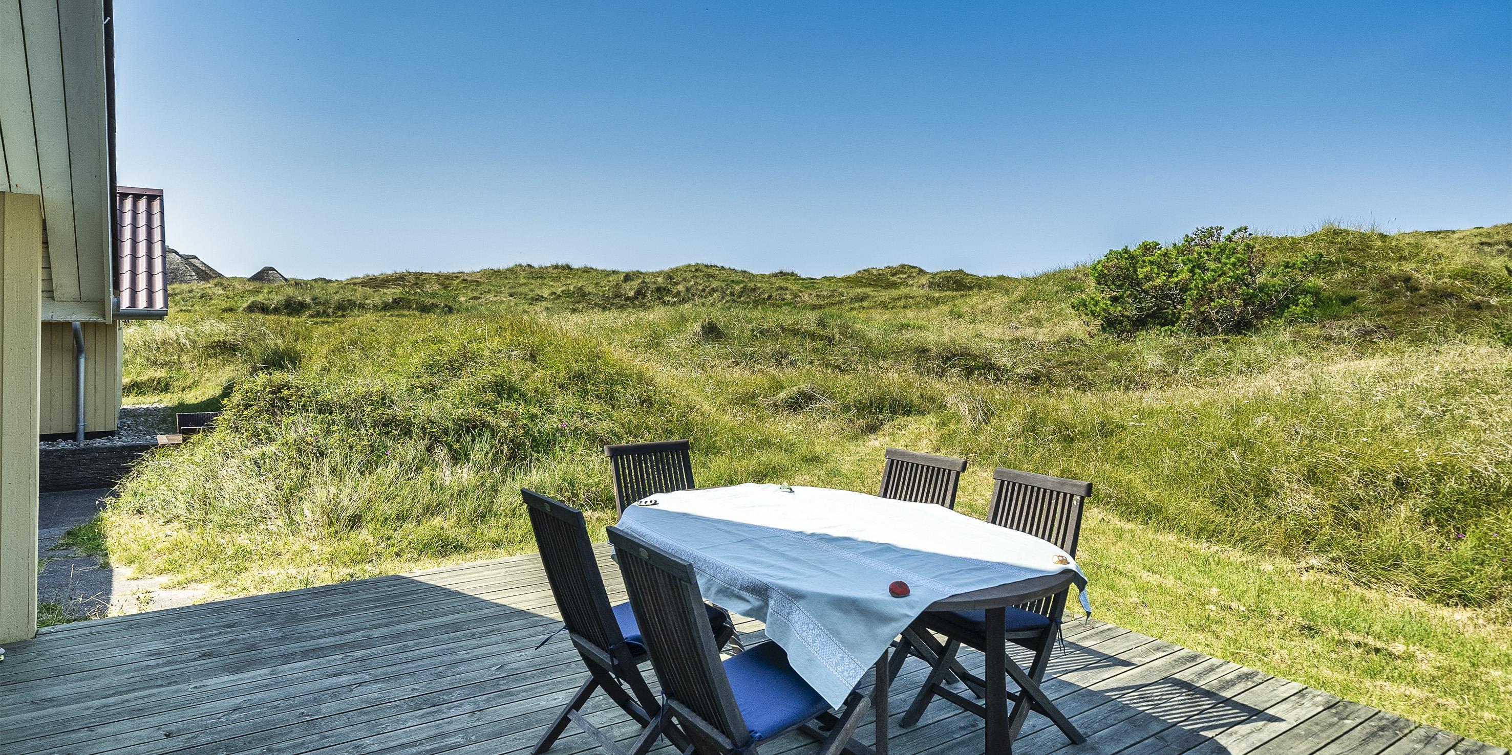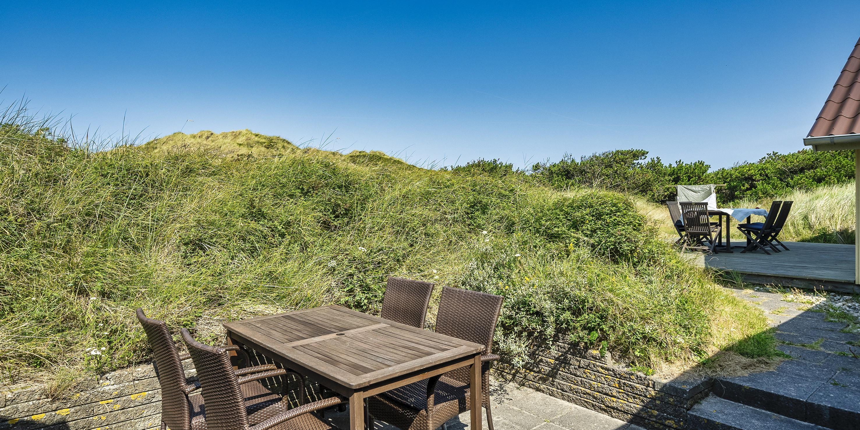 Huset er omgivet flere terrasser hvor der året rundt er mulighed for at finde en læ kroge hvorfra naturen kan nydes i fulde drag. Grunden er en stor naturlig klitgrund med god plads. Der forefindes et gyngestativ og en sandkasse til de små børn. Det er tilladt at tage 1 hund med. Rygning er ikke tilladt! Ungdomsgrupper er ikke tilladt. Der er TV-pakke fra BOXER med danske, tyske, norske og svenske kanaler, og trådløst bredbånd i hele huset.