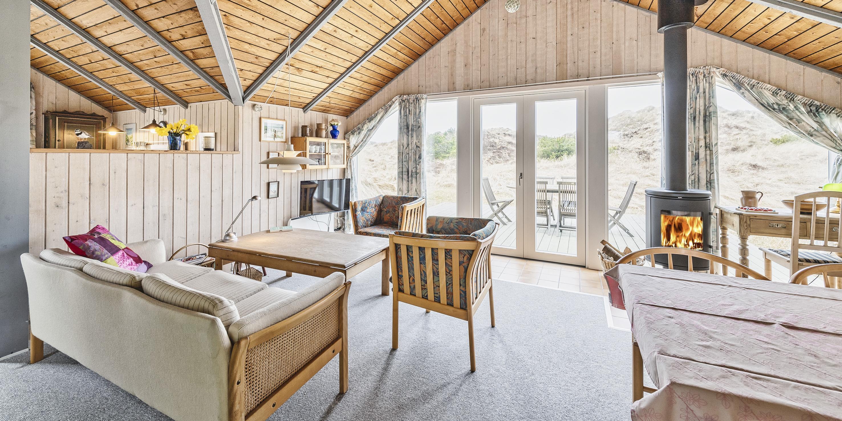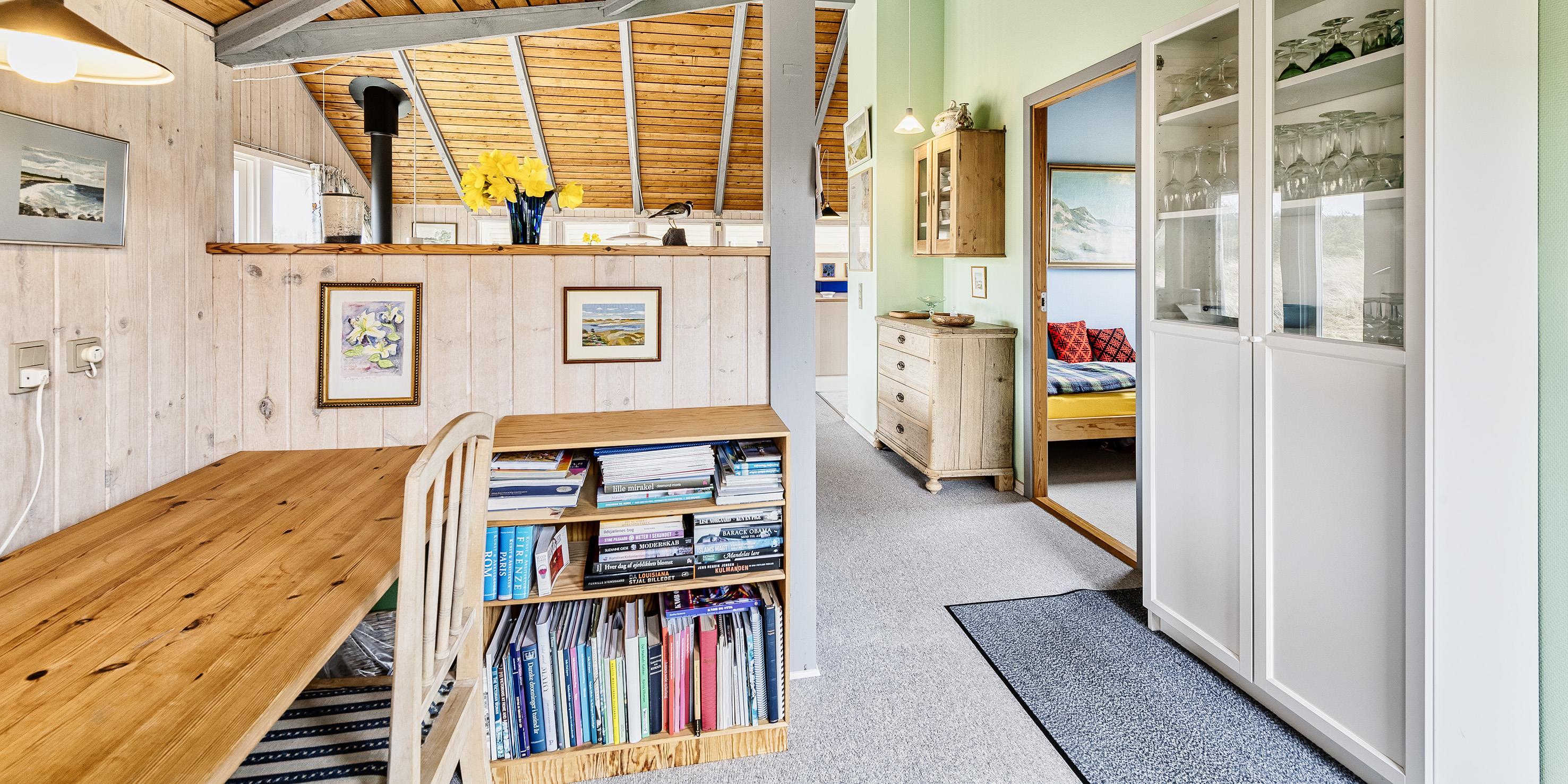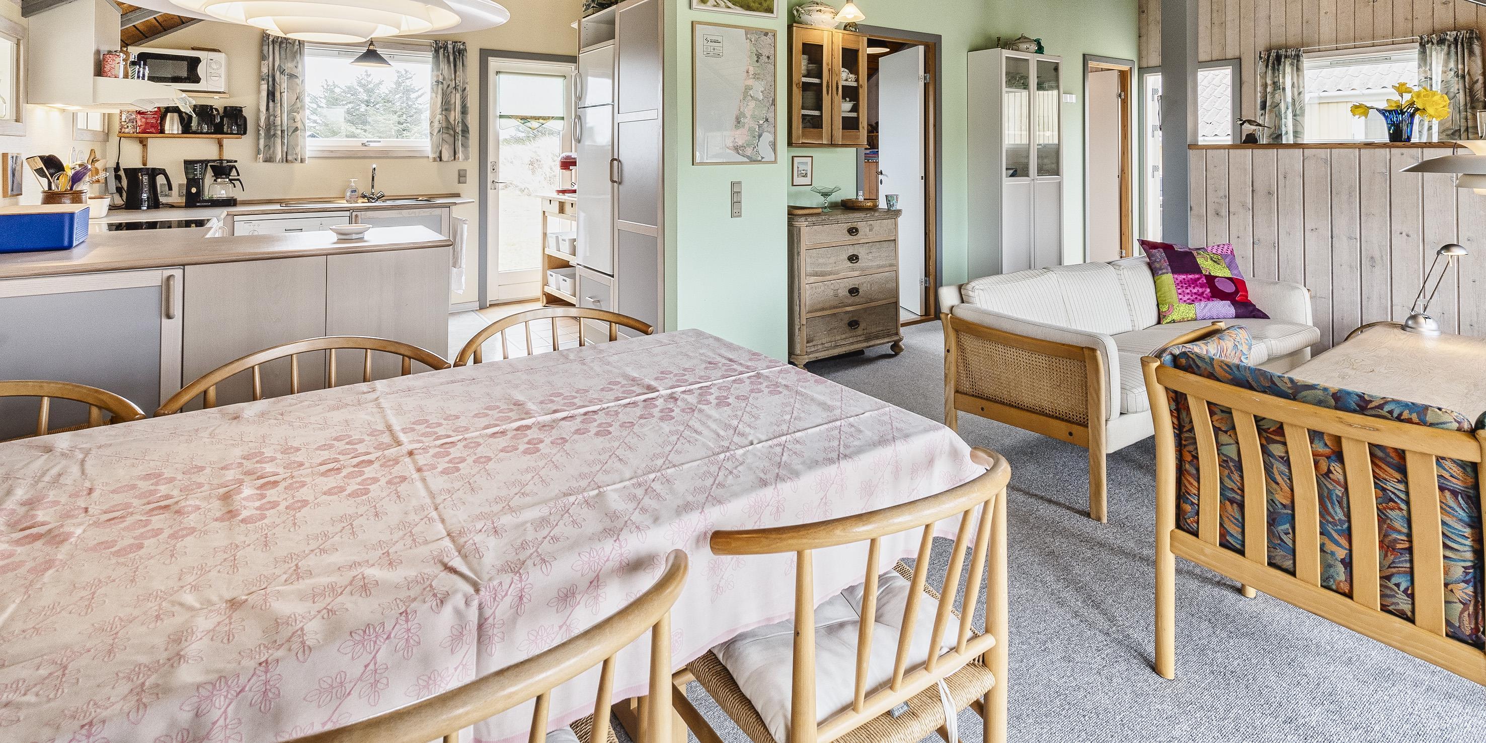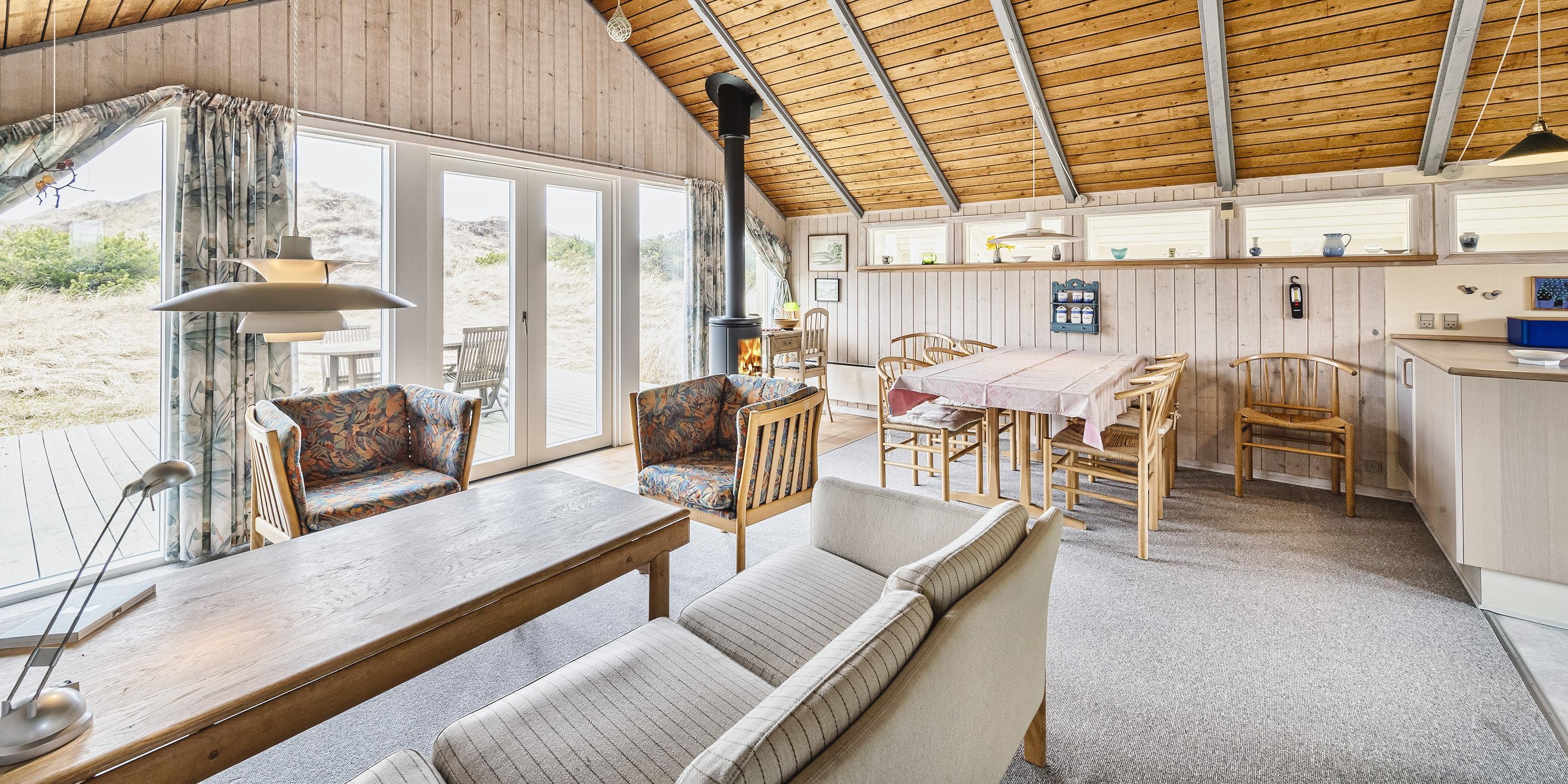 Hovedhuset indeholder: indgangspartiet er i direkte forbindelse med husets opholdsrum. Den hyggelige stue er indrettet med en god spiseplads med langbord hvorfra der er udsyn til brændeovnen og terrassen. Sofahjørne med udsyn til brændeovnen, fjernsyn (BOXER) og kig til klitlandskabet. Lille kontor hjørne med trådløs internetadgang og en printer. Køkken med opvaskemaskine, mikroovn, komfur med keramisk kogeplade og varmluftovn samt en køle-/frysekombination. En ekstra kæl- og fryseskab stå i gæstehus i gang. Fra køkkenet er der udgang til en østvendt terrasse hvor morgenmaden kan nydes til solopgang. Fra stuen er der indgang til 1 soveværelse med 2 enkeltsenge. Gæstetoilet med wc, vask og en vaskemaskine. Over den delvise lukkede træterrasse kommer man over i tilbygningen. Her forefindes der 2 store soveværelser, den ene er med en dobbeltseng, garderobeskab og et skrivebord med kig til terrassen. 1 Soveværelse med tre enkeltsenge samt garderobeskab. Masterbadeværelse med gulvvarme, bruseniche, vaskearrangement, wc, hjørnespa og en sauna. Mellemgang med ekstra køle-/fryseskab. Træterrassen ligger i læ og med adgang til den vestvendte terrasse. Fra den hævede træterrasse mod vest og hvor der adgang fra stuen, kan solnedgangen nydes ved en solrig sommerdag. 3 soveværelser: DS + 2S + DS/1S
