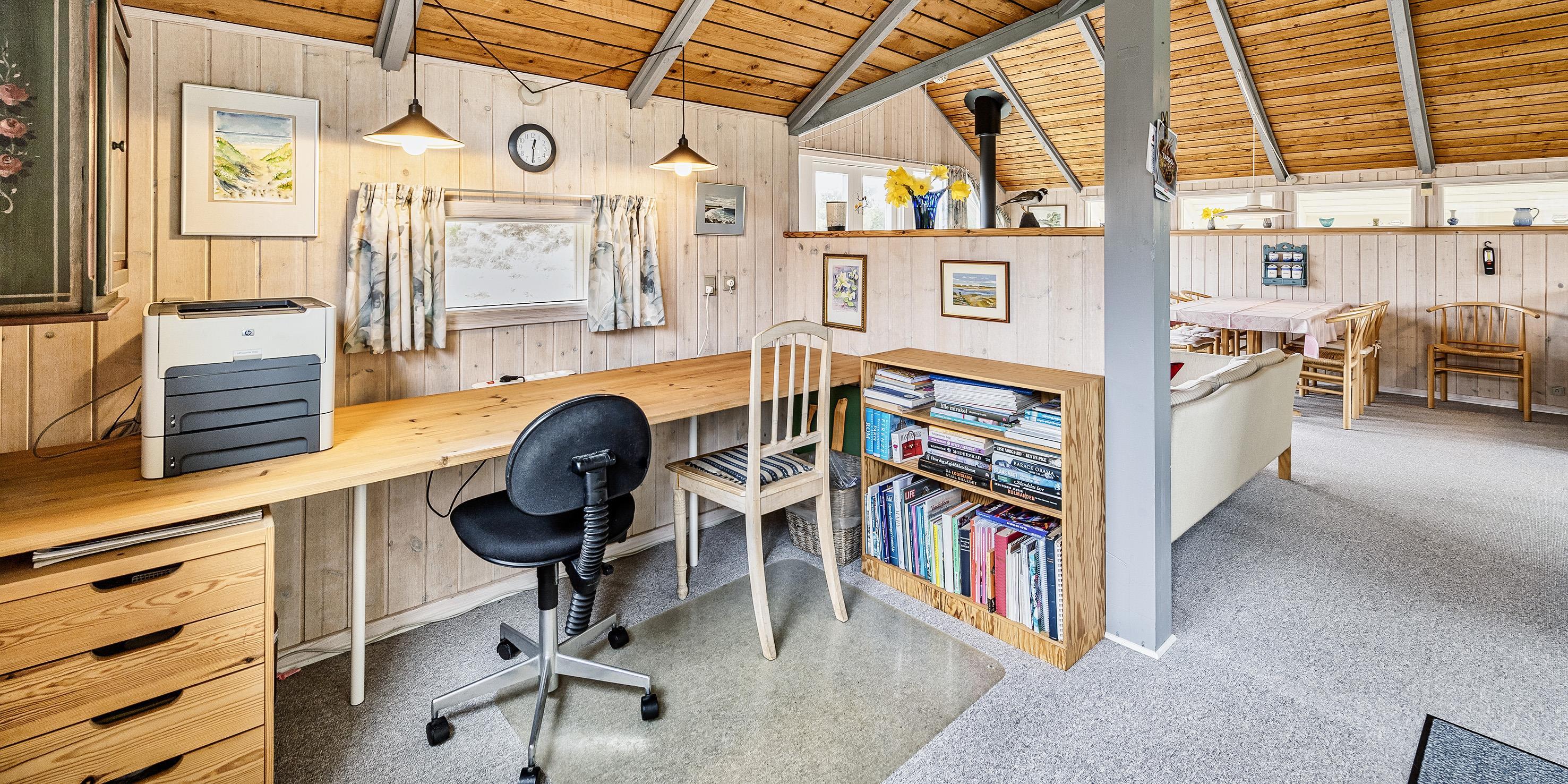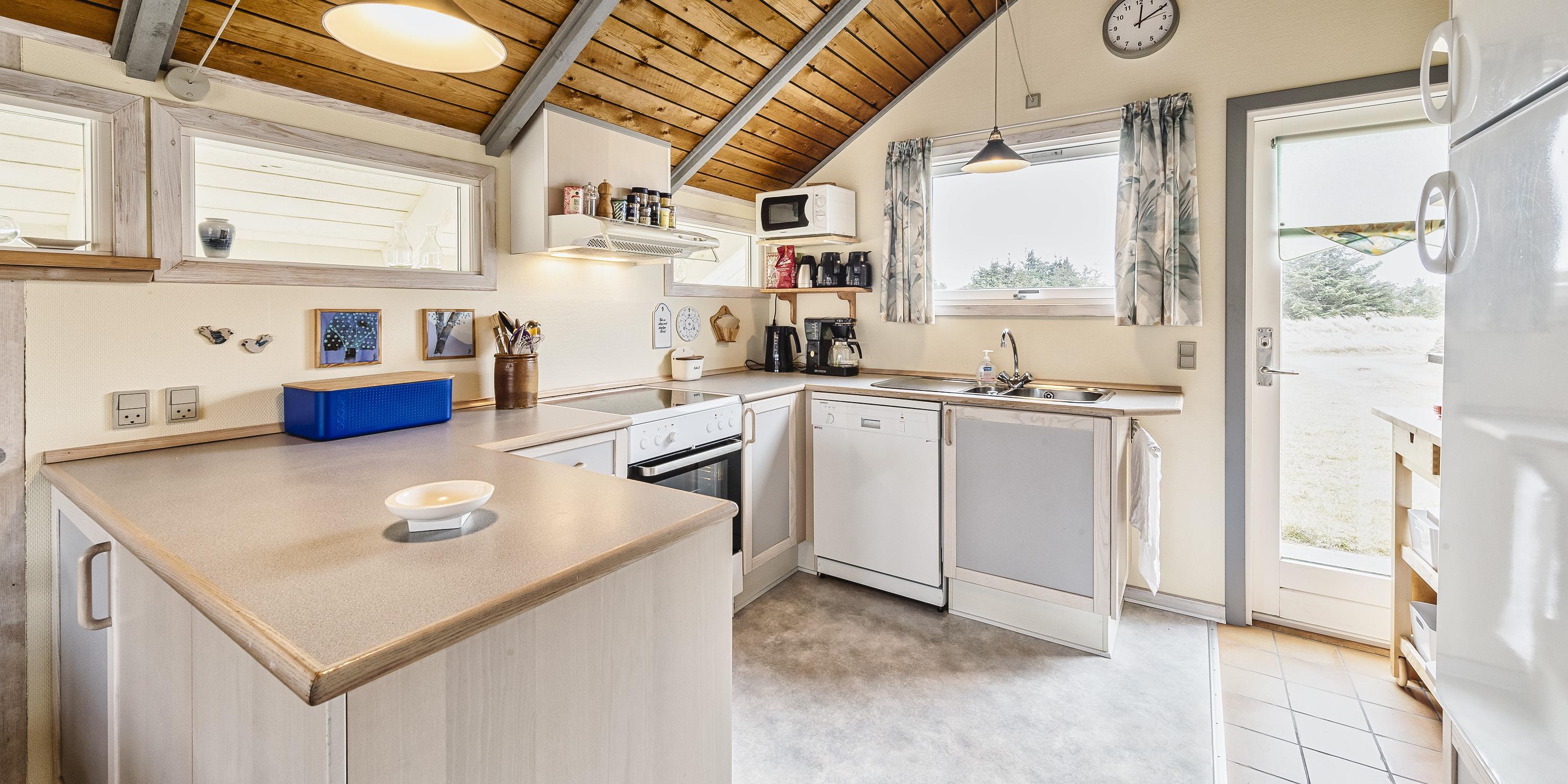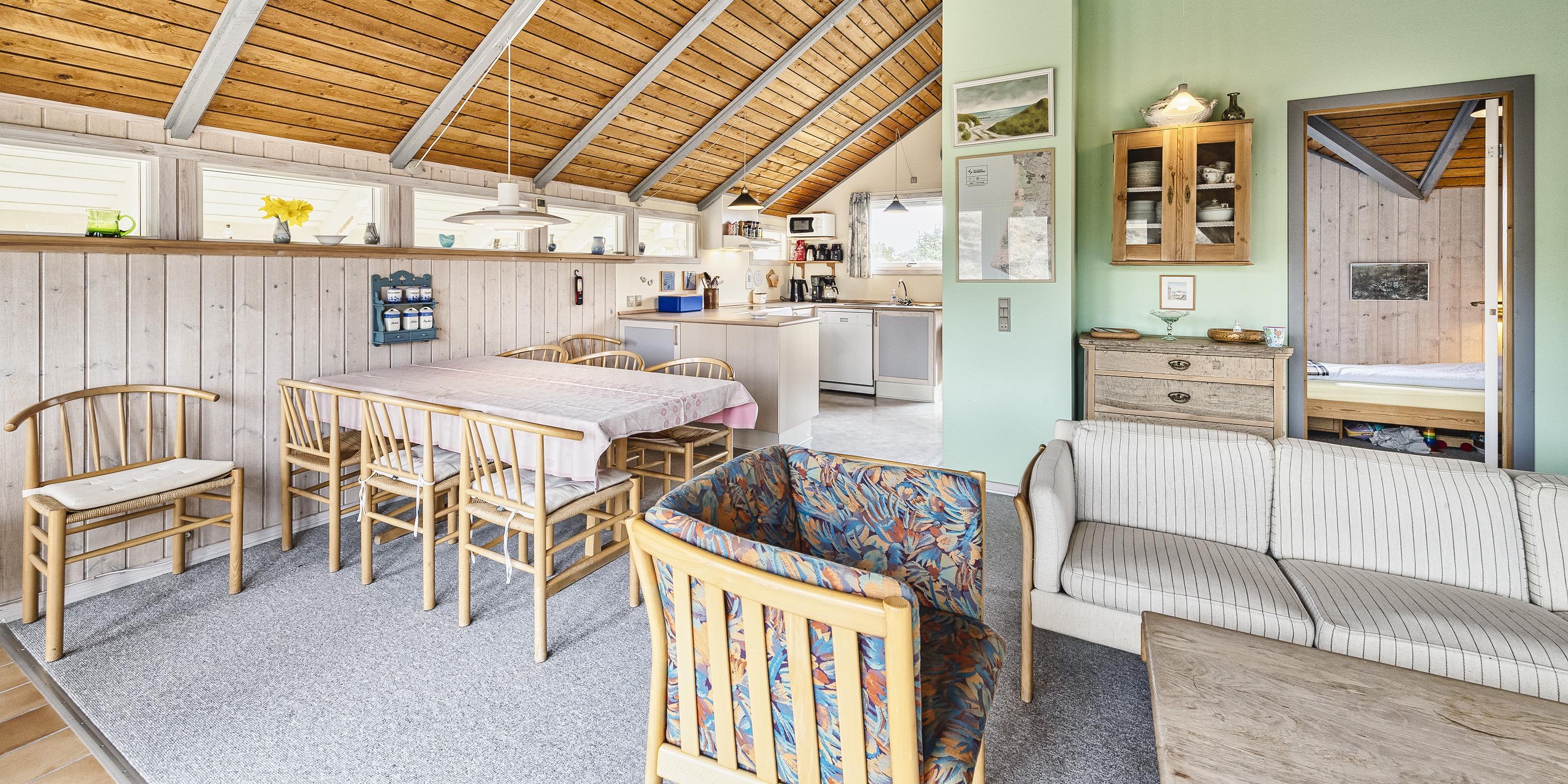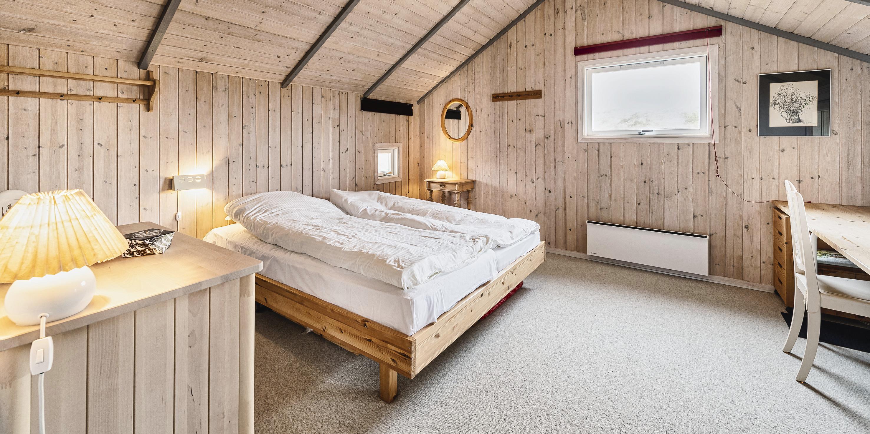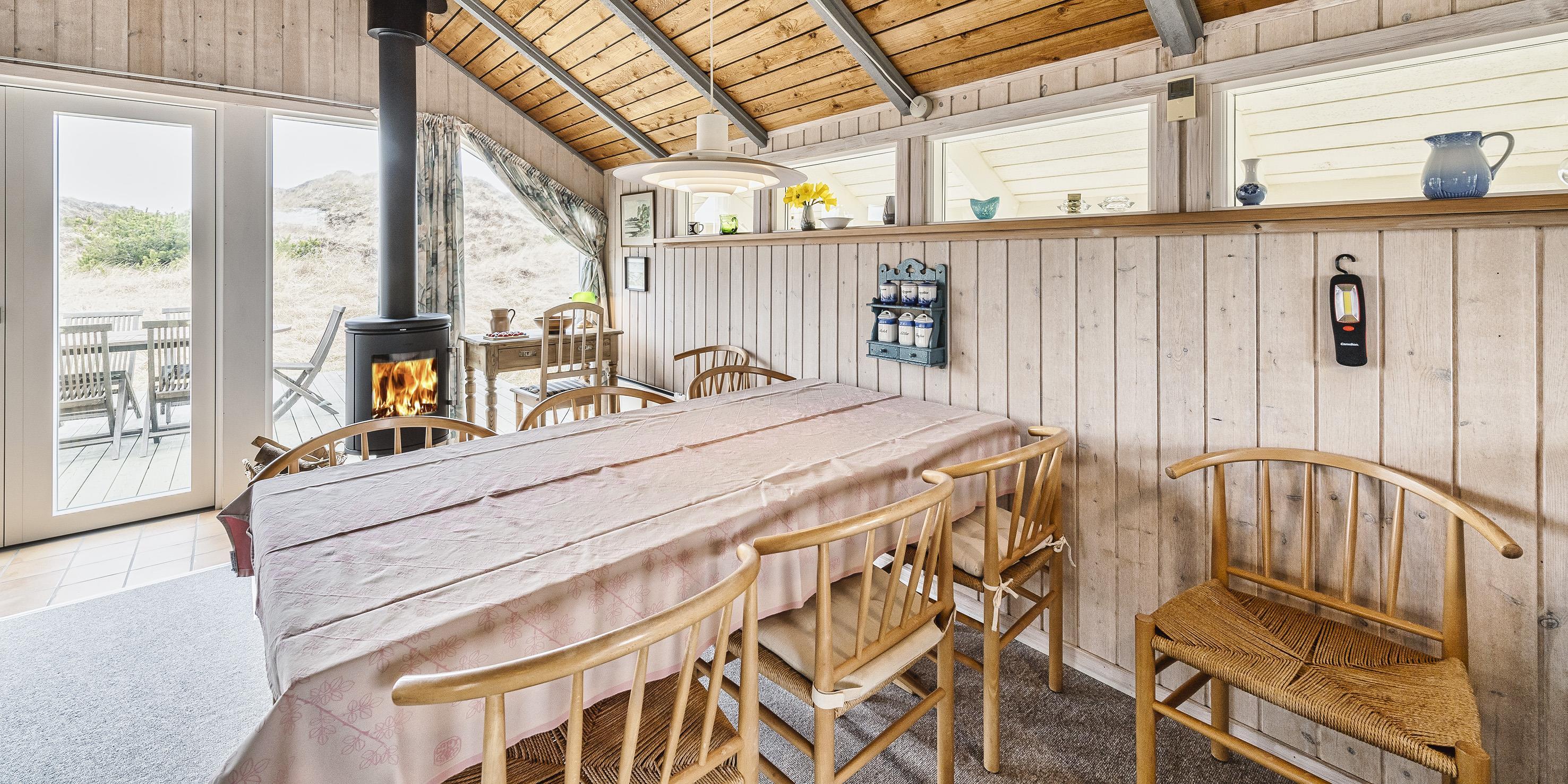 Hovedhuset indeholder: indgangspartiet er i direkte forbindelse med husets opholdsrum. Den hyggelige stue er indrettet med en god spiseplads med langbord hvorfra der er udsyn til brændeovnen og terrassen. Sofahjørne med udsyn til brændeovnen, fjernsyn (BOXER) og kig til klitlandskabet. Lille kontor hjørne med trådløs internetadgang og en printer. Køkken med opvaskemaskine, mikroovn, komfur med keramisk kogeplade og varmluftovn samt en køle-/frysekombination. En ekstra kæl- og fryseskab stå i gæstehus i gang. Fra køkkenet er der udgang til en østvendt terrasse hvor morgenmaden kan nydes til solopgang. Fra stuen er der indgang til 1 soveværelse med 2 enkeltsenge. Gæstetoilet med wc, vask og en vaskemaskine. Over den delvise lukkede træterrasse kommer man over i tilbygningen. Her forefindes der 2 store soveværelser, den ene er med en dobbeltseng, garderobeskab og et skrivebord med kig til terrassen. 1 Soveværelse med tre enkeltsenge samt garderobeskab. Masterbadeværelse med gulvvarme, bruseniche, vaskearrangement, wc, hjørnespa og en sauna. Mellemgang med ekstra køle-/fryseskab. Træterrassen ligger i læ og med adgang til den vestvendte terrasse. Fra den hævede træterrasse mod vest og hvor der adgang fra stuen, kan solnedgangen nydes ved en solrig sommerdag. 3 soveværelser: DS + 2S + DS/1S