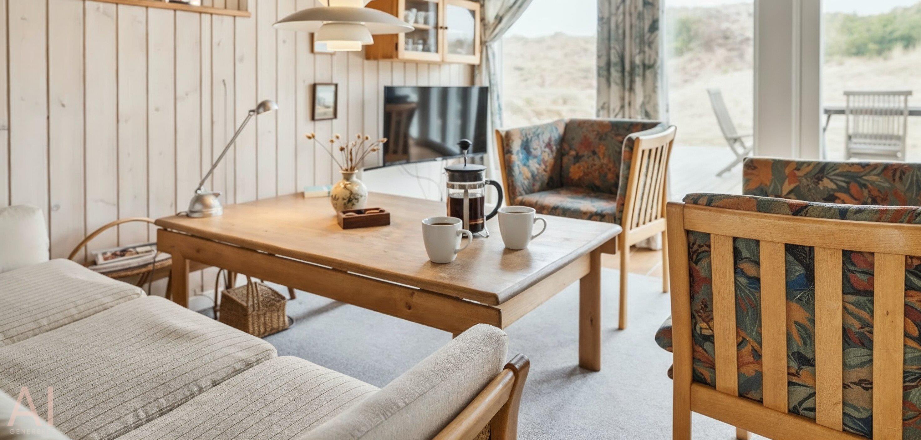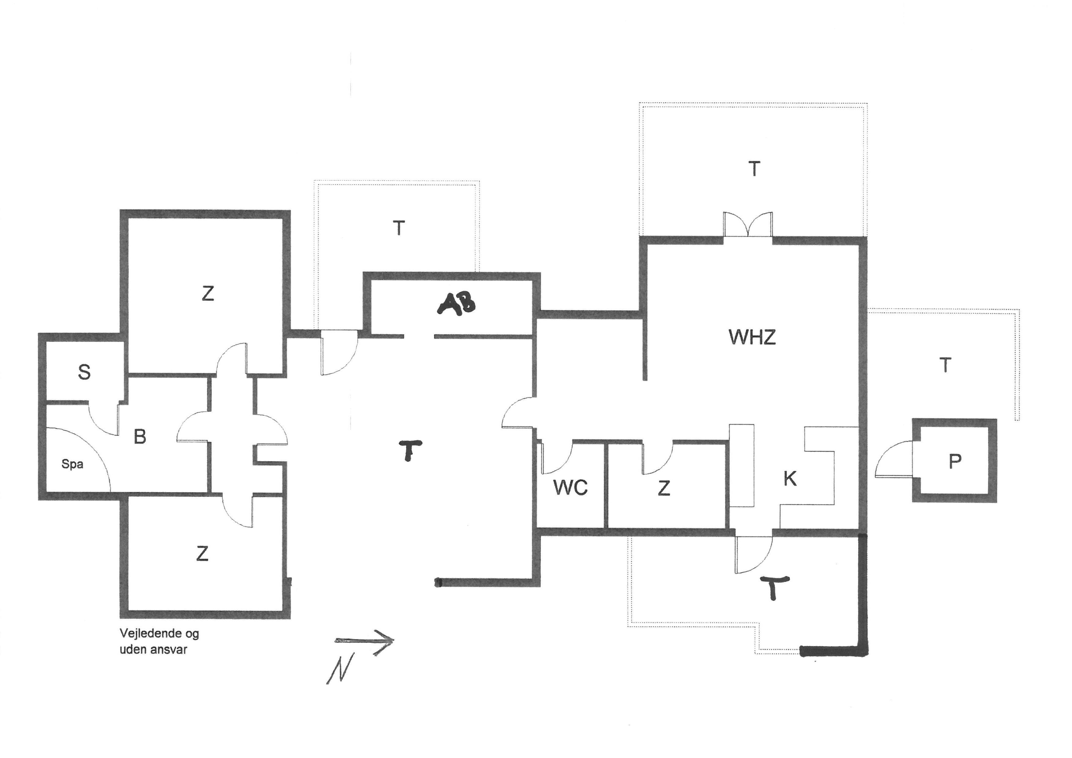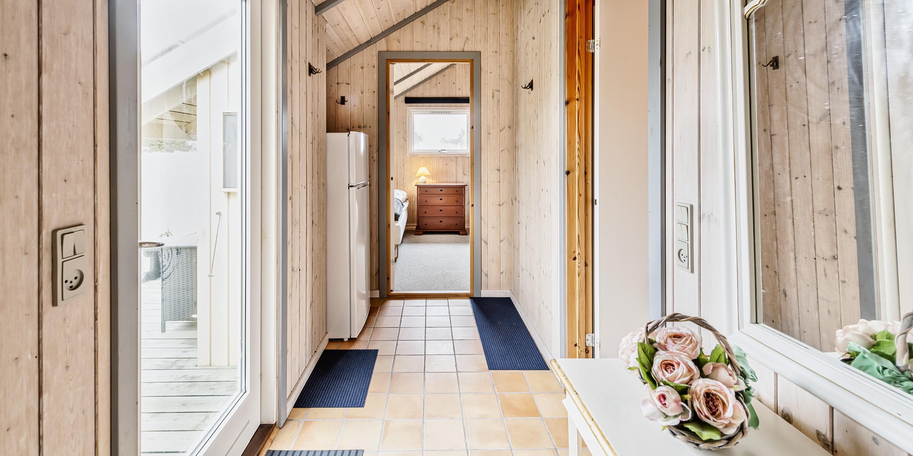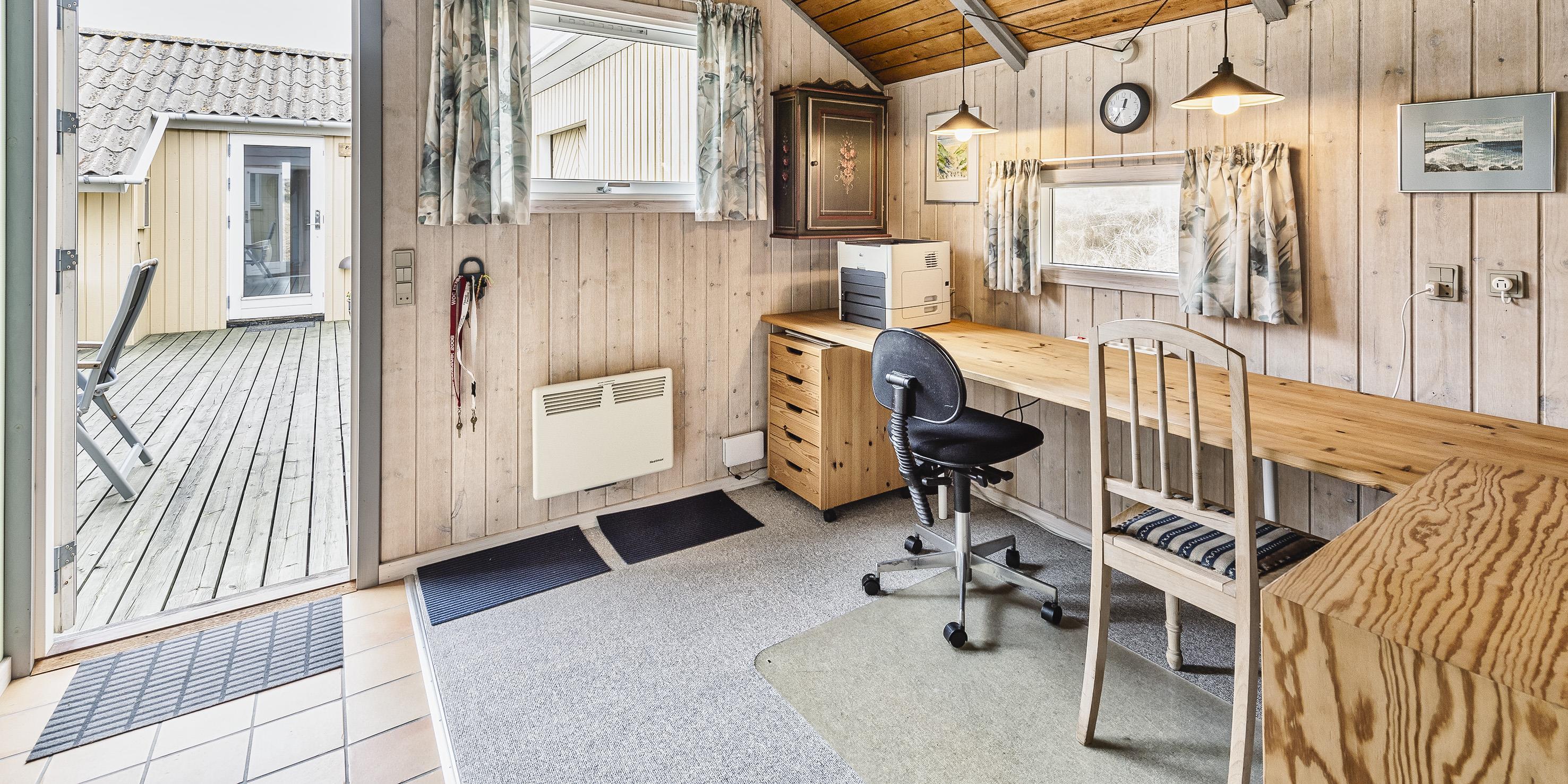 Hovedhuset indeholder: indgangspartiet er i direkte forbindelse med husets opholdsrum. Den hyggelige stue er indrettet med en god spiseplads med langbord hvorfra der er udsyn til brændeovnen og terrassen. Sofahjørne med udsyn til brændeovnen, fjernsyn (BOXER) og kig til klitlandskabet. Lille kontor hjørne med trådløs internetadgang og en printer. Køkken med opvaskemaskine, mikroovn, komfur med keramisk kogeplade og varmluftovn samt en køle-/frysekombination. En ekstra kæl- og fryseskab stå i gæstehus i gang. Fra køkkenet er der udgang til en østvendt terrasse hvor morgenmaden kan nydes til solopgang. Fra stuen er der indgang til 1 soveværelse med 2 enkeltsenge. Gæstetoilet med wc, vask og en vaskemaskine. Over den delvise lukkede træterrasse kommer man over i tilbygningen. Her forefindes der 2 store soveværelser, den ene er med en dobbeltseng, garderobeskab og et skrivebord med kig til terrassen. 1 Soveværelse med tre enkeltsenge samt garderobeskab. Masterbadeværelse med gulvvarme, bruseniche, vaskearrangement, wc, hjørnespa og en sauna. Mellemgang med ekstra køle-/fryseskab. Træterrassen ligger i læ og med adgang til den vestvendte terrasse. Fra den hævede træterrasse mod vest og hvor der adgang fra stuen, kan solnedgangen nydes ved en solrig sommerdag. 3 soveværelser: DS + 2S + DS/1S