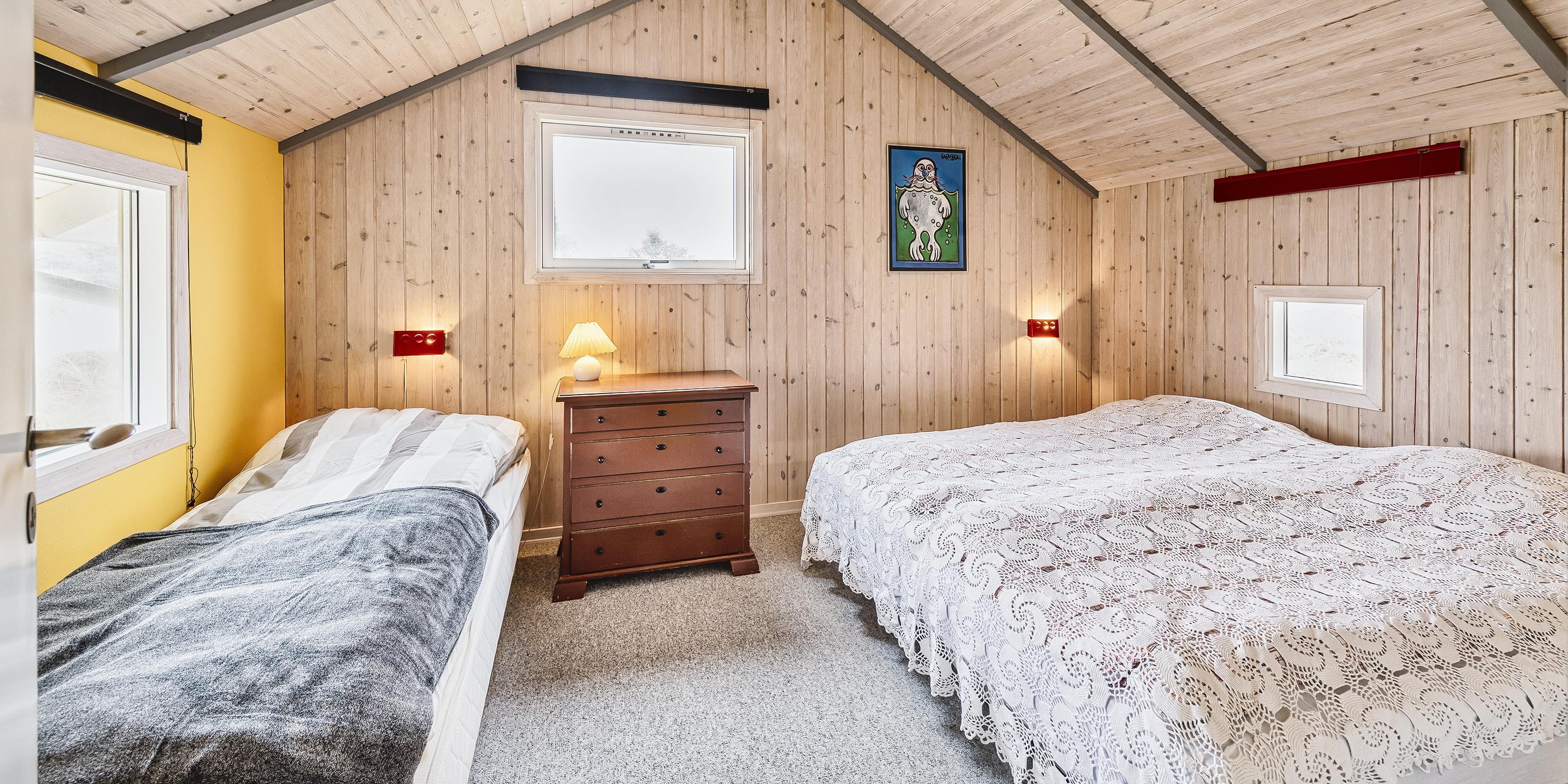 3 soveværelser. 1 med dobbeltseng 180x200 cm og 1 enkeltseng. 1 med dobbeltseng 180x200. 1 med 2 enkeltsenge (á 90x200 cm).
