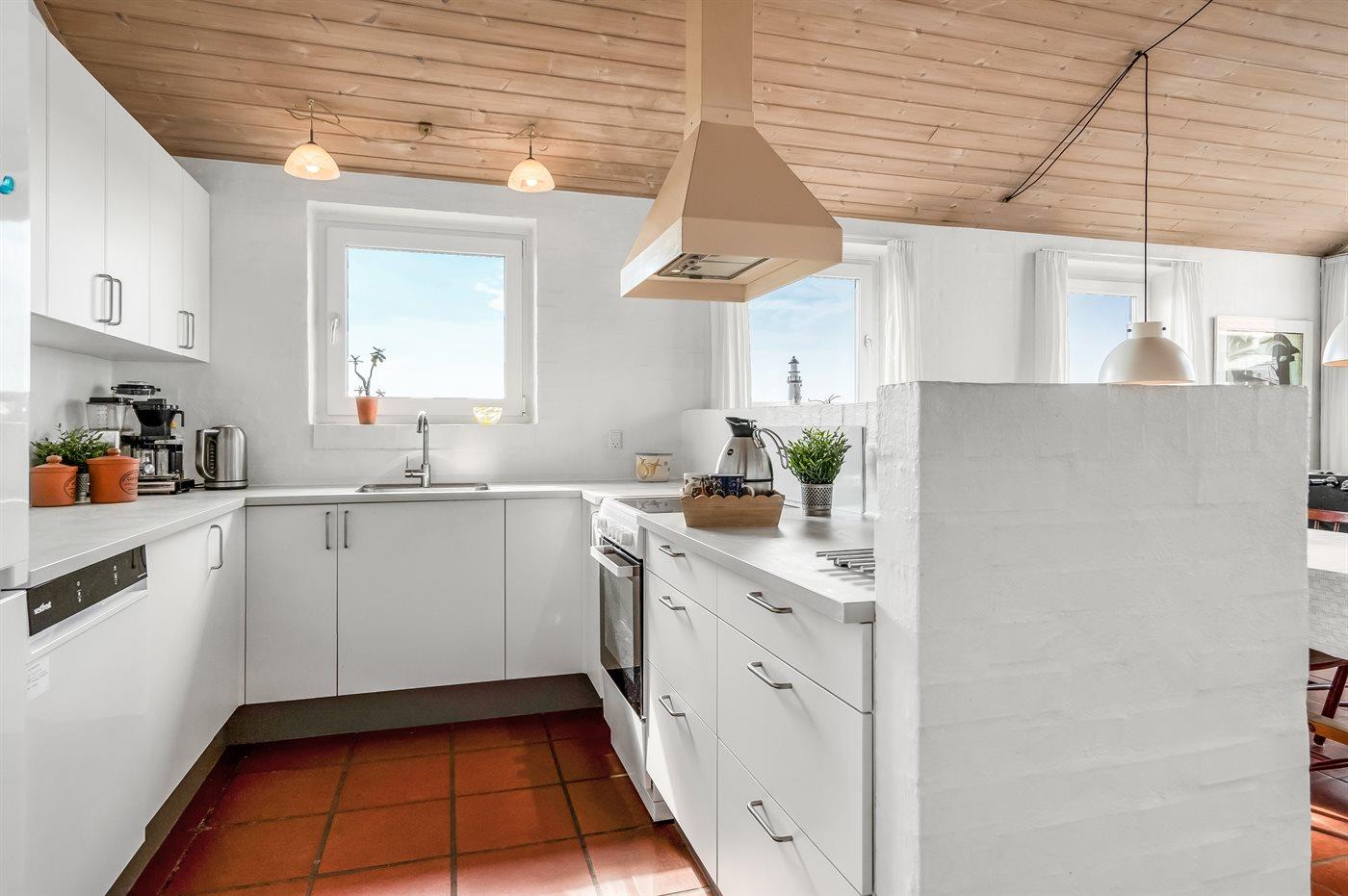 Køkkenet er udstyret med 1 køleskab. Der er 4 keramiske kogeplader, bageovn, mikrobølgeovn samt opvaskemaskine.